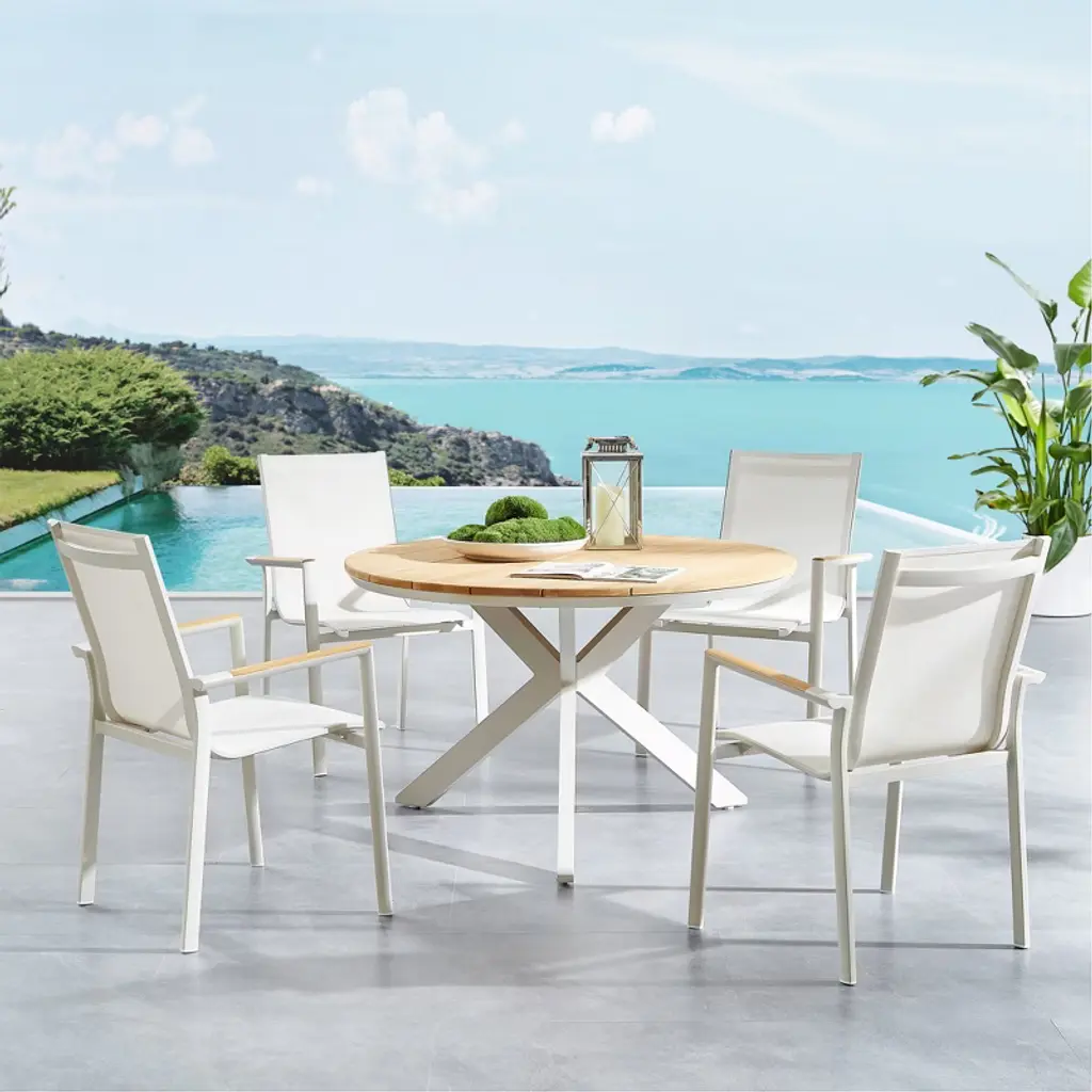 Decksplore 5-piece Outdoor Patio Dining Set With Round Teak Table & 4 Sling Armchairs Outdoor Furniture For Relaxing & Entertaining