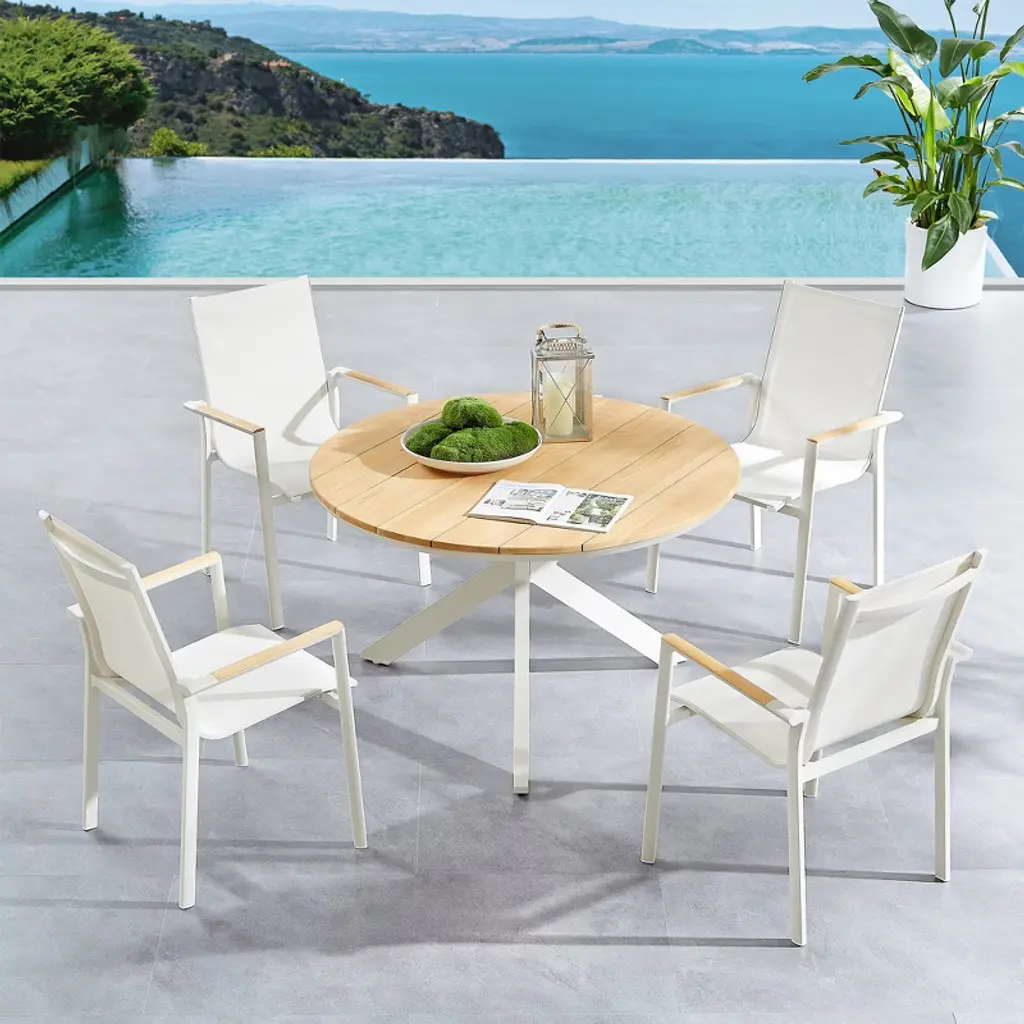 Picture this: lazy Sunday brunches, lively dinner parties under the stars, and peaceful morning coffees in your own backyard paradise. Our premium outdoor dining set brings together timeless elegance and unbeatable durability for seasons of enjoyment. The heart of the Outdoor Dining set is its gorgeous solid teak tabletop - a natural showstopper that develops a beautiful silvery patina over time while standing strong against sun, rain, and everything in between. Paired with four contemporary sling chairs, you'll love the perfect balance of support and comfort from the breathable, quick-dry fabric seats. What makes this set special: ✓ Lightweight yet rock-solid aluminum frames (easy to move but won't blow away) ✓ All-weather performance that looks great year after year ✓ Low-maintenance design (no more covering furniture every night!) ✓ Sleek, modern profile that elevates any outdoor space