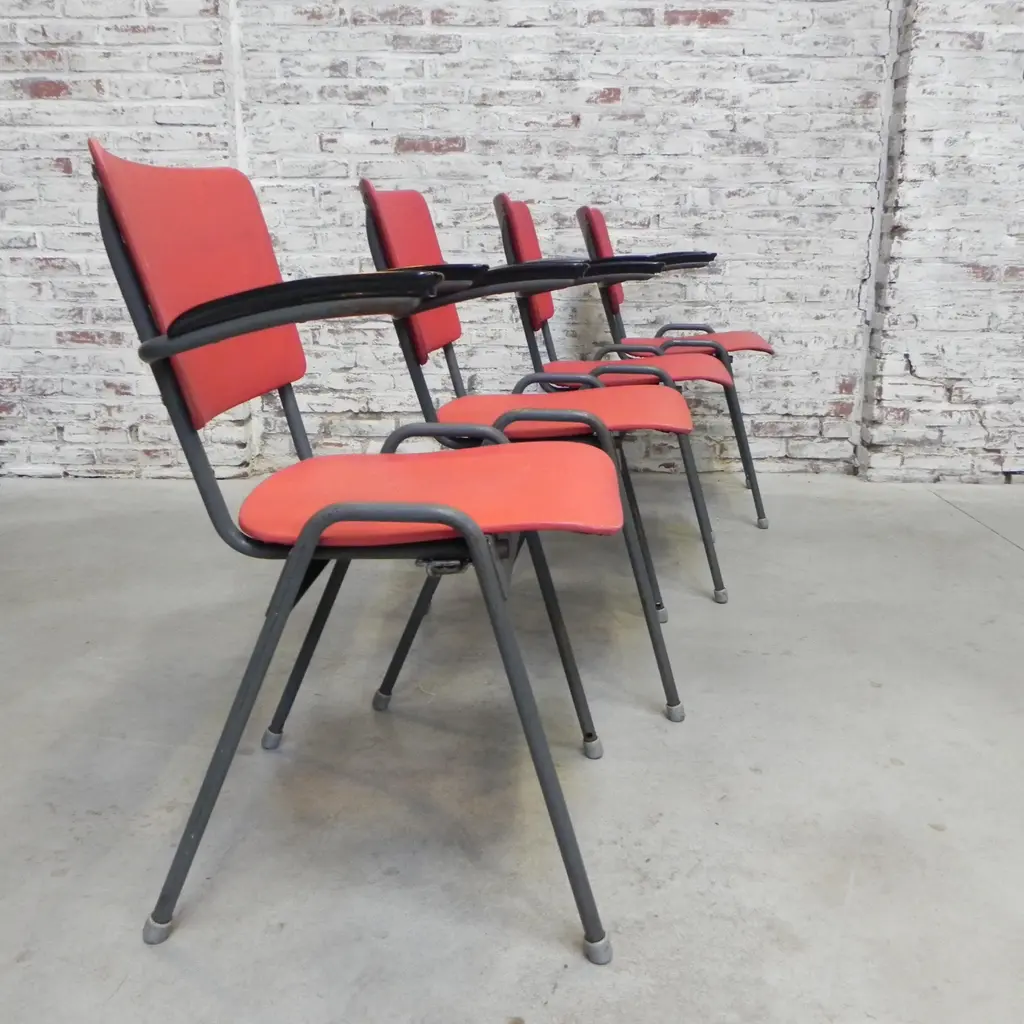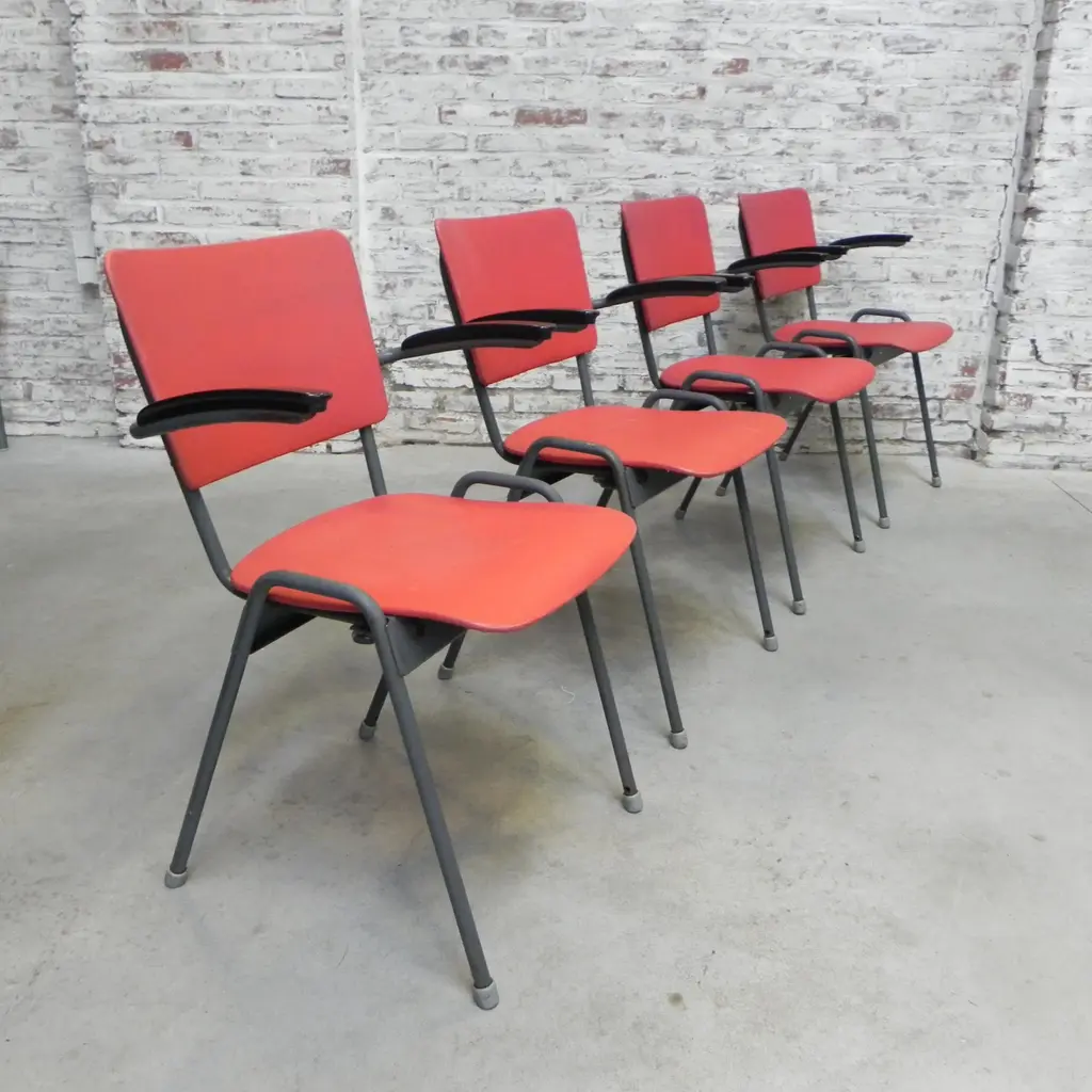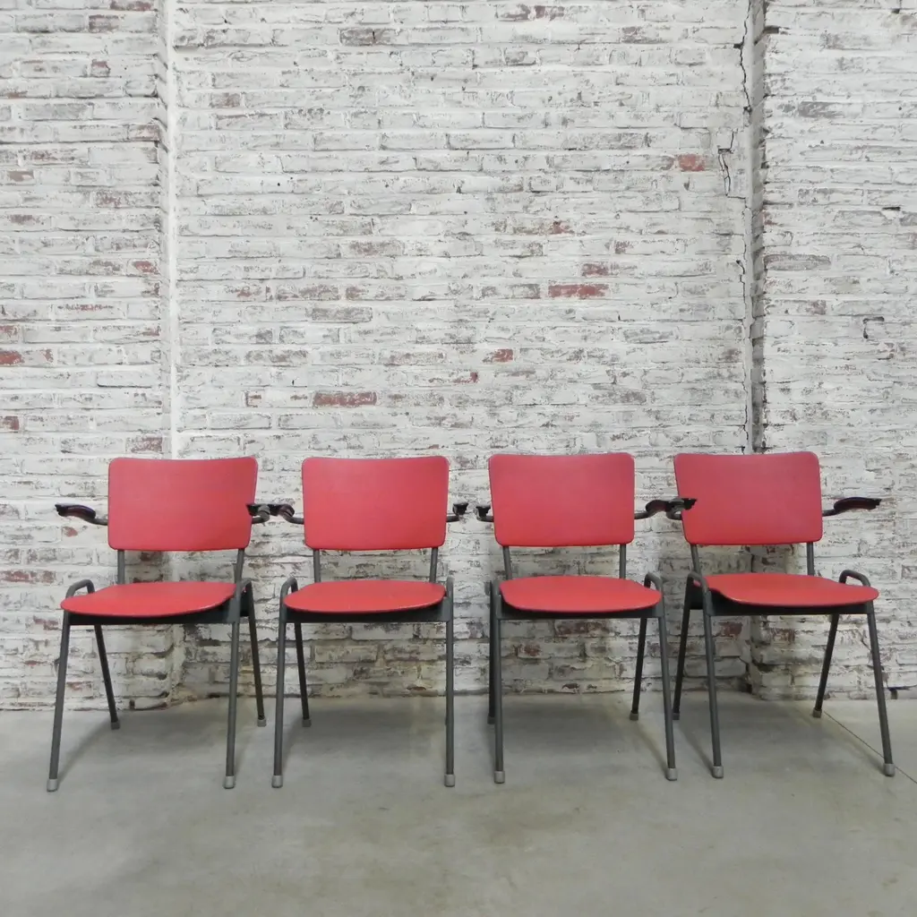 4 nice sturdy stackable chairs for the dining table or desk. Dimensions per seat: Height: 80 cm. Width: 54 cm. Depth: 54 cm. Seat height: 45 cm. The skai has some minor damage. There is a mechanism under the seat to connect the seats. Marked: ''NEDERL. PATENT No 75948'' Origin: The Netherlands, 1960s. Material: steel / skai / wood / bakelite. price for the 4.