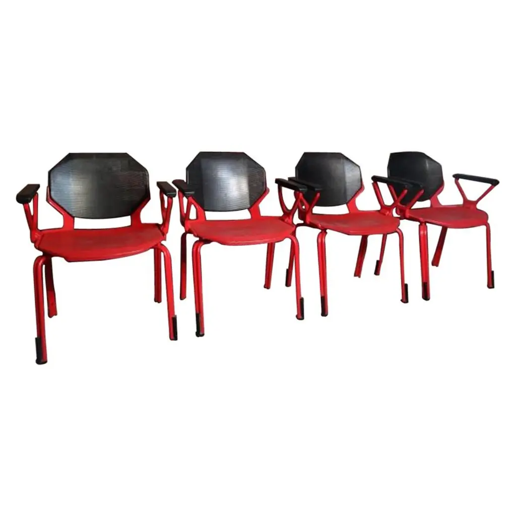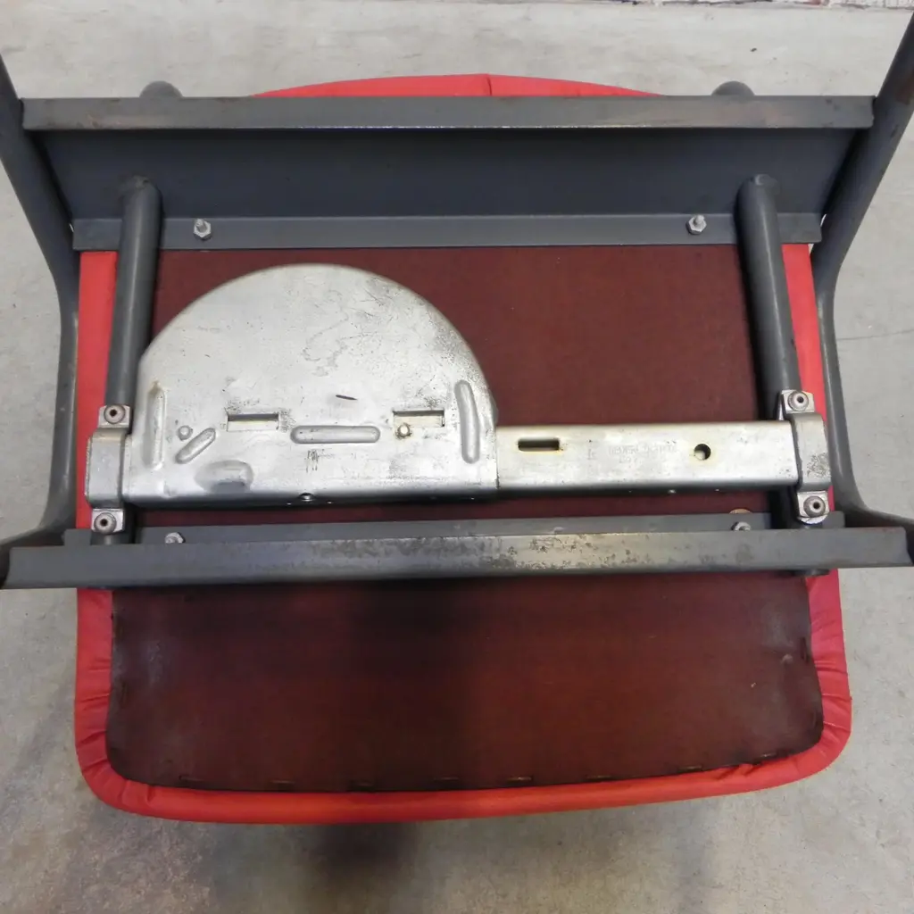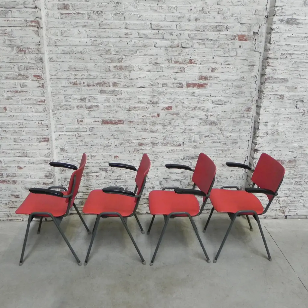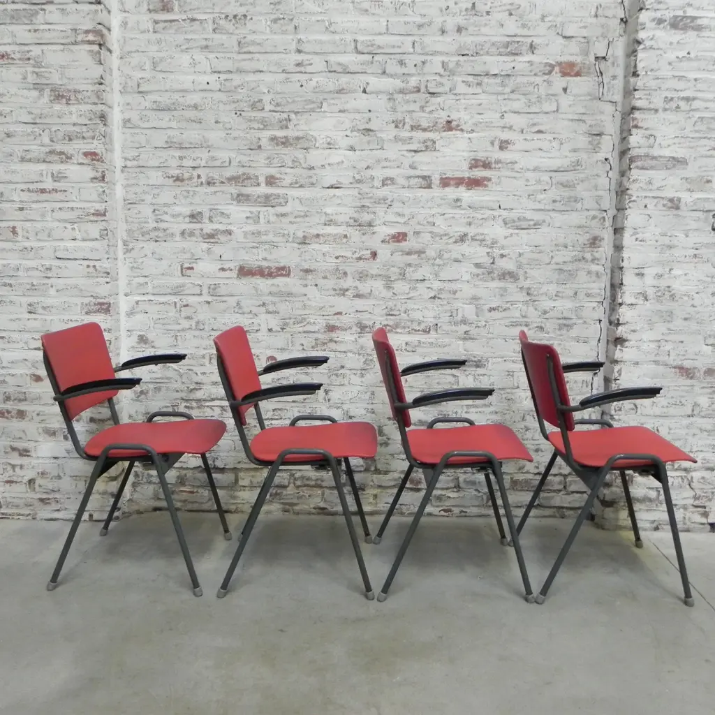 4 nice sturdy stackable chairs for the dining table or desk. Dimensions per seat: Height: 80 cm. Width: 54 cm. Depth: 54 cm. Seat height: 45 cm. The skai has some minor damage. There is a mechanism under the seat to connect the seats. Marked: ''NEDERL. PATENT No 75948'' Origin: The Netherlands, 1960s. Material: steel / skai / wood / bakelite. price for the 4.
