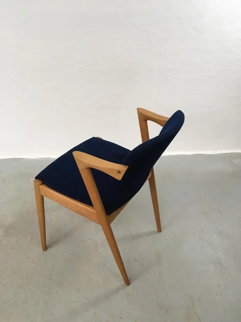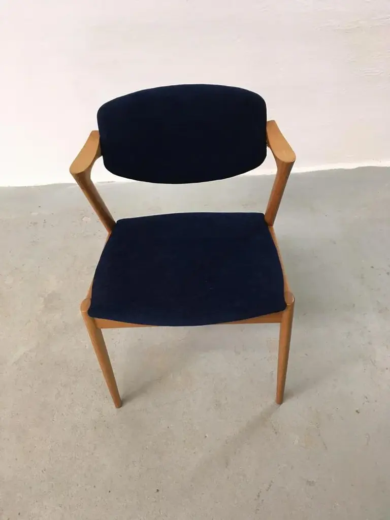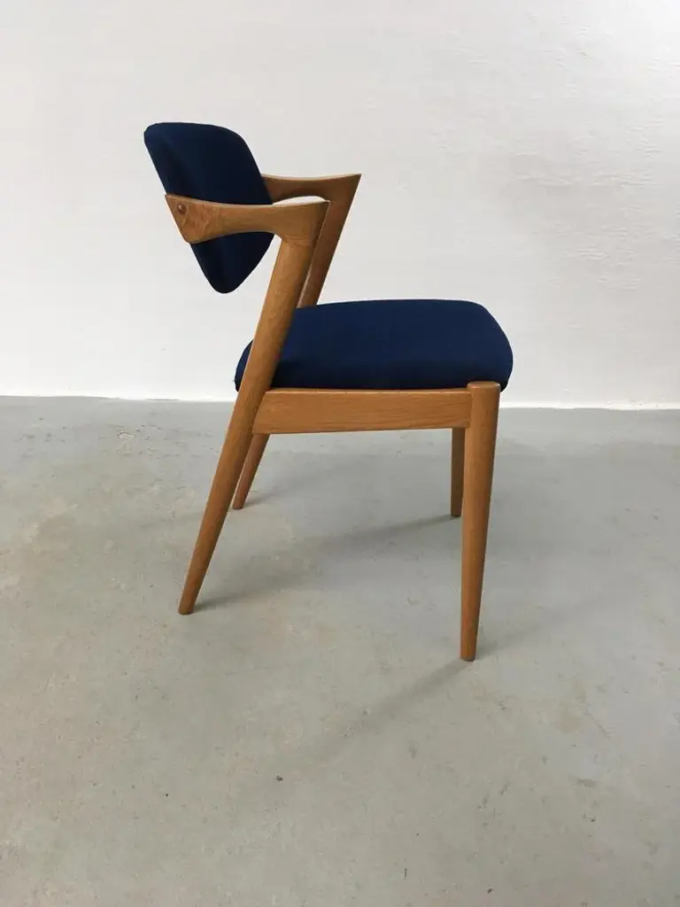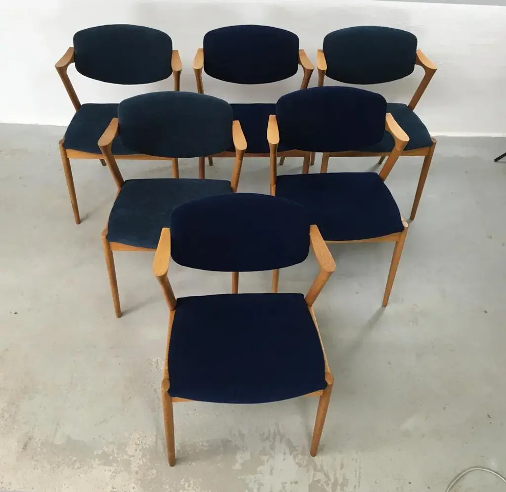 Set of six restored and refinished dining chairs in oak with adjustable backrest by Kai Kristiansen for Schous Møbelfabrik. The chairs have Kai Kristiansens typical light and elegant design that make them fit in easily where you want them in your home, a design that was so unique that his colleague the famous designer Hans J. Wegner characterized model 42 as beautiful from all angles when the chair was revealed in 1956. The chairs have been fully restored, sanded and refinished by our experienced workshop to insure that they are in very good condition with only minimal signs of age and use and will be reupholstered without additional cost in fabric of your choice from "Kvadrat" / standard leathers from "Sorensen Leather" or for additional price luxury leathers (Elegance, Vegetal, Rustic, Pure and Royal Nubuck). Authentication https://mus.reindex.net/DMFURT/main/T.php?Ifm=Pz&page=1&qe=kai+kristiansen&facetqe=kai+kristiansen&zoomed=1083&ColSearch=&hits=59&tgtlabel=Furniture+index&islocal=1&usefacets=1&localservices=0&sort=relevance&pagesize=25&format=details# I have official proof of authenticity such as vintage catalogs, designer records, or other literature sources and take full responsibility for any authenticity issues arising from misattribution