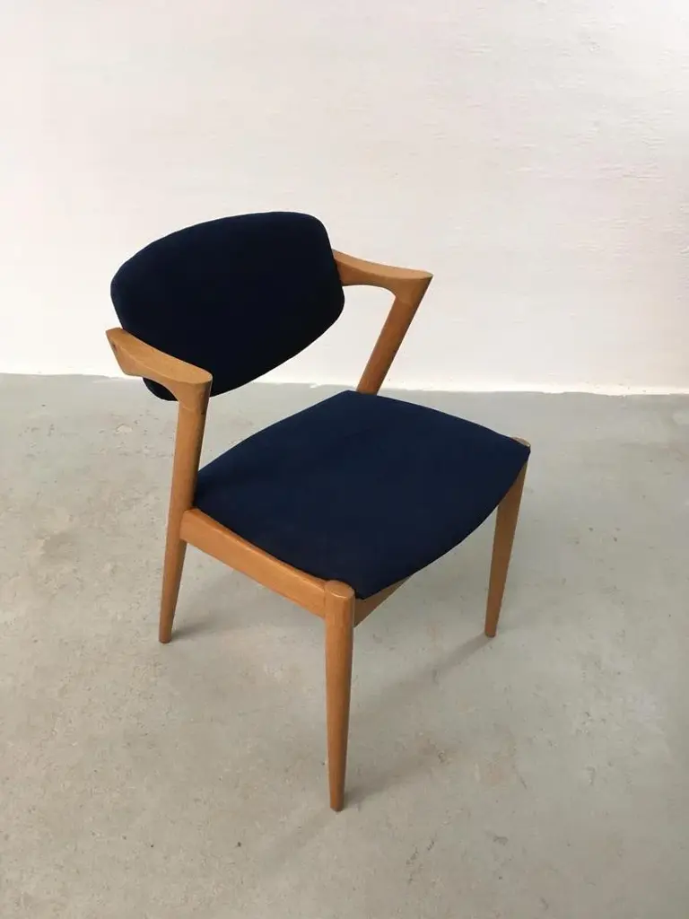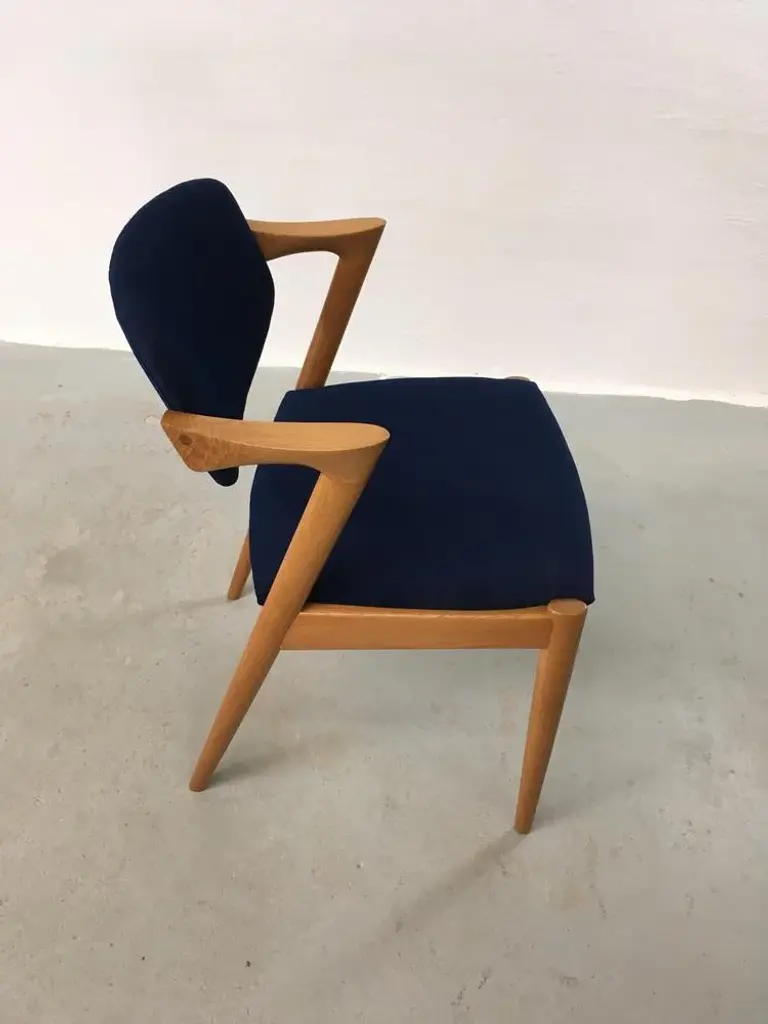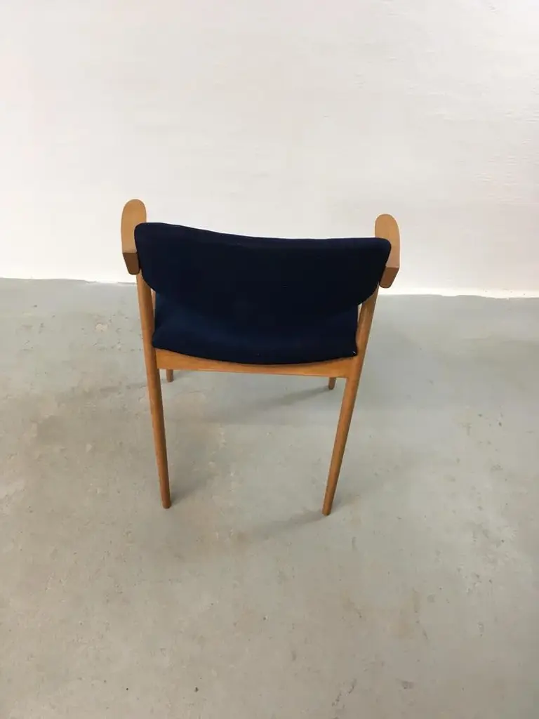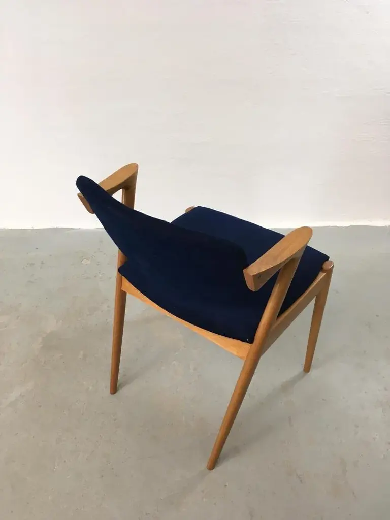 Set of six restored and refinished dining chairs in oak with adjustable backrest by Kai Kristiansen for Schous Møbelfabrik. The chairs have Kai Kristiansens typical light and elegant design that make them fit in easily where you want them in your home, a design that was so unique that his colleague the famous designer Hans J. Wegner characterized model 42 as beautiful from all angles when the chair was revealed in 1956. The chairs have been fully restored, sanded and refinished by our experienced workshop to insure that they are in very good condition with only minimal signs of age and use and will be reupholstered without additional cost in fabric of your choice from "Kvadrat" / standard leathers from "Sorensen Leather" or for additional price luxury leathers (Elegance, Vegetal, Rustic, Pure and Royal Nubuck). Authentication https://mus.reindex.net/DMFURT/main/T.php?Ifm=Pz&page=1&qe=kai+kristiansen&facetqe=kai+kristiansen&zoomed=1083&ColSearch=&hits=59&tgtlabel=Furniture+index&islocal=1&usefacets=1&localservices=0&sort=relevance&pagesize=25&format=details# I have official proof of authenticity such as vintage catalogs, designer records, or other literature sources and take full responsibility for any authenticity issues arising from misattribution
