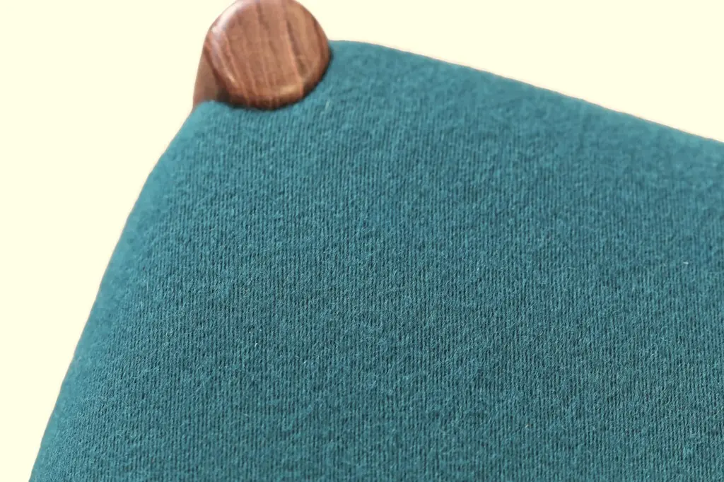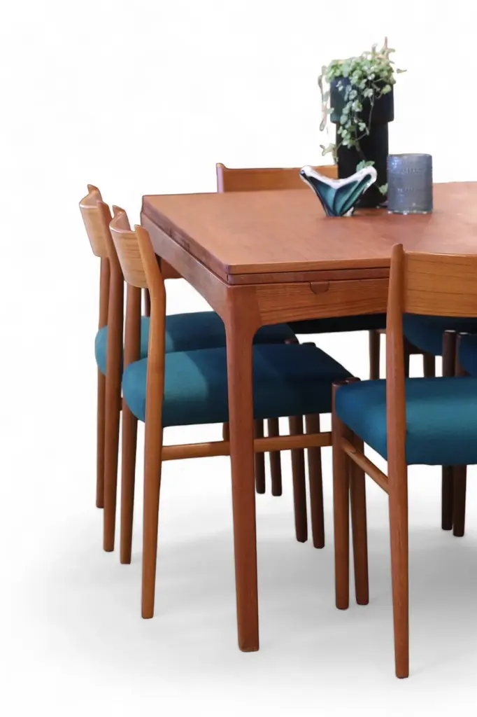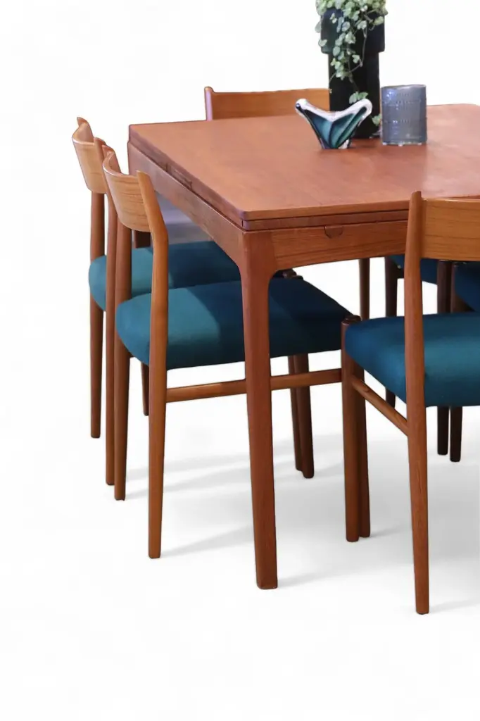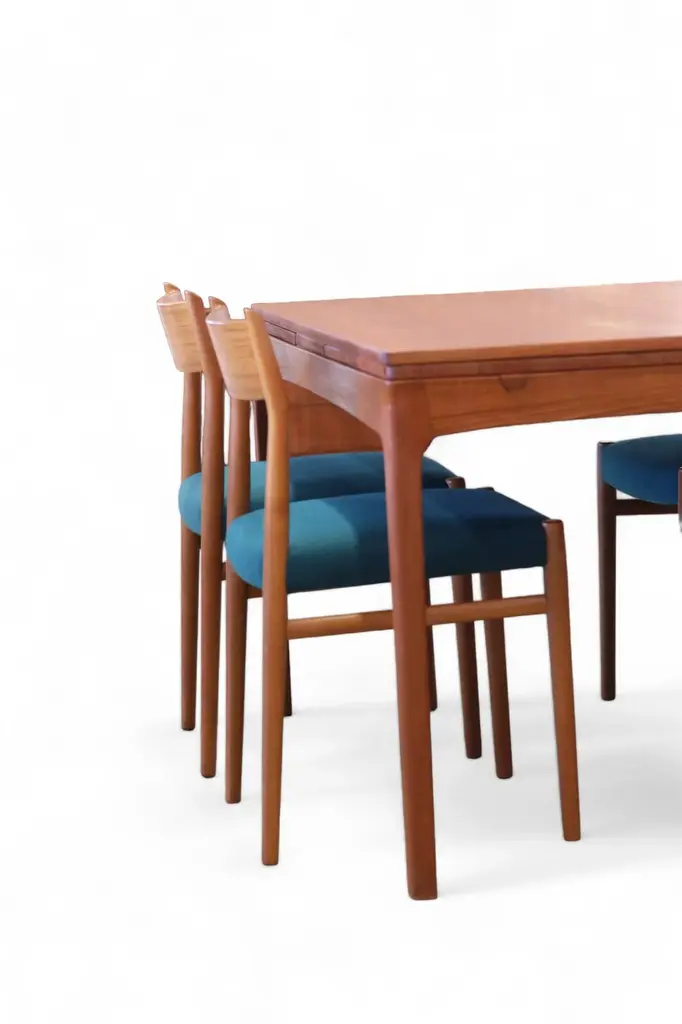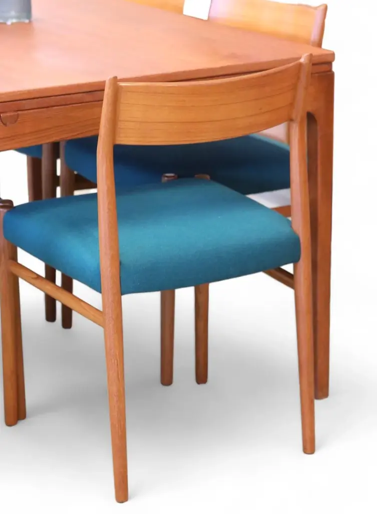 A stylish and very elegant chair in teak by arne vodder manufactured by the company sibast in denmark. the model has a low back and it gives a very elegant expression around the dining table. The chairs are really a breath of fresh air that also thrives with furniture in a more modern cut. They are absolutely top class and are easy to mix with other furniture. the legs are round with a coil-shaped silhouette. The hind legs go up towards the back and are angled towards the back tray. The connections between the pairs of legs provide a very stable chair. a chair that is really made with high craftsmanship and with a very high finish. the seat is covered in wool fabric in a musty green tone and has excellent padding with fine comfort. Upholstery is in reality in a much greener tone than the pictures show. vodder is one of the most famous designers from denmark and worked and ran companies together with finn juhl. he was a contemporary of big names like børge mogensen and arne jacobsen. Vodder's furniture was represented in the white house in the 1960s as well as in many banks, airline offices, embassies and hotels all over the world. vodder arranged many international exhibitions in sweden, england, austria and the usa together with verner panton and nanna ditzel. He also worked with a number of manufacturers including cadovius, nielaus, erik jorgensen, fritz hansen, sibast furniture and more. 49 cm wide and 47-79 cm high. in very good condition with only minor traces of use! this piece has an attribution mark, i am sure that it is completely authentic and take full responsibility for any authenticity issues arising from misattribution
