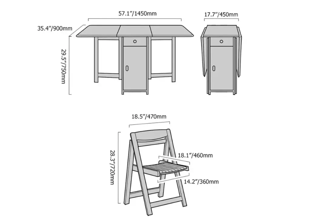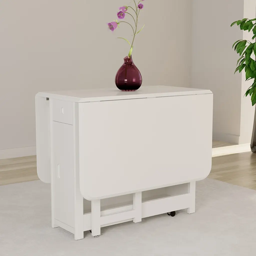 Featuring an understated silhouette with clean lines, this counter-height dining table brings contemporary flair to your home. The characteristic of this multifunctional dining table is the folding design which can be extended unilaterally or bilaterally. When it's not in use, you can fold down the sides and use it as a console table with drawer storage. Four folding chairs are included while you can stow them underneath the countertop, space-saving and ingenious. Four-wheel design allows the folded set to be easily transported out of the way for storage. Versatile, casual and compact with decent style, this multifunctional dining table is perfect for a small dining area or cozy nook.