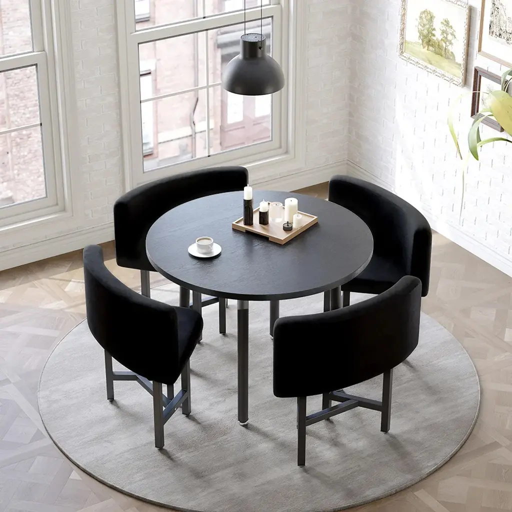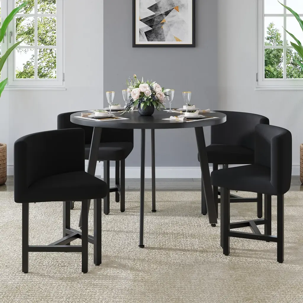 Add this stylish, modern round dining table set to your dining room for an endearing and stylish setup. This unique combination includes a 39.4-inch black MDF tabletop paired with four of its matching upholstered chairs. It is a cohesive and modern assembly, which is the perfect fit for any small space. A rigid base of four legs serves as the supporting element of this furniture structure, while comfortable velvet chairs add an extra ounce of class. Whether you plan intimate meals or other gatherings, this set mingles function and flair and instantly elevates any modern dining room in style.