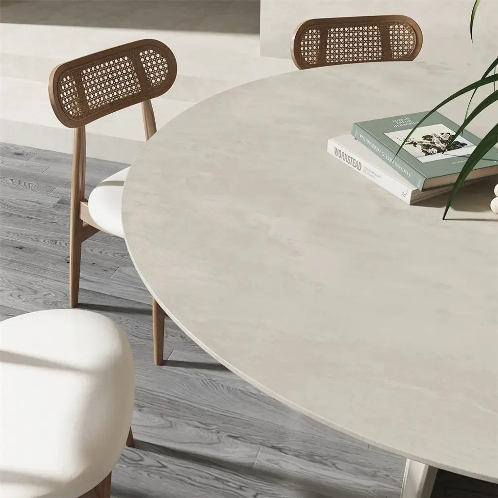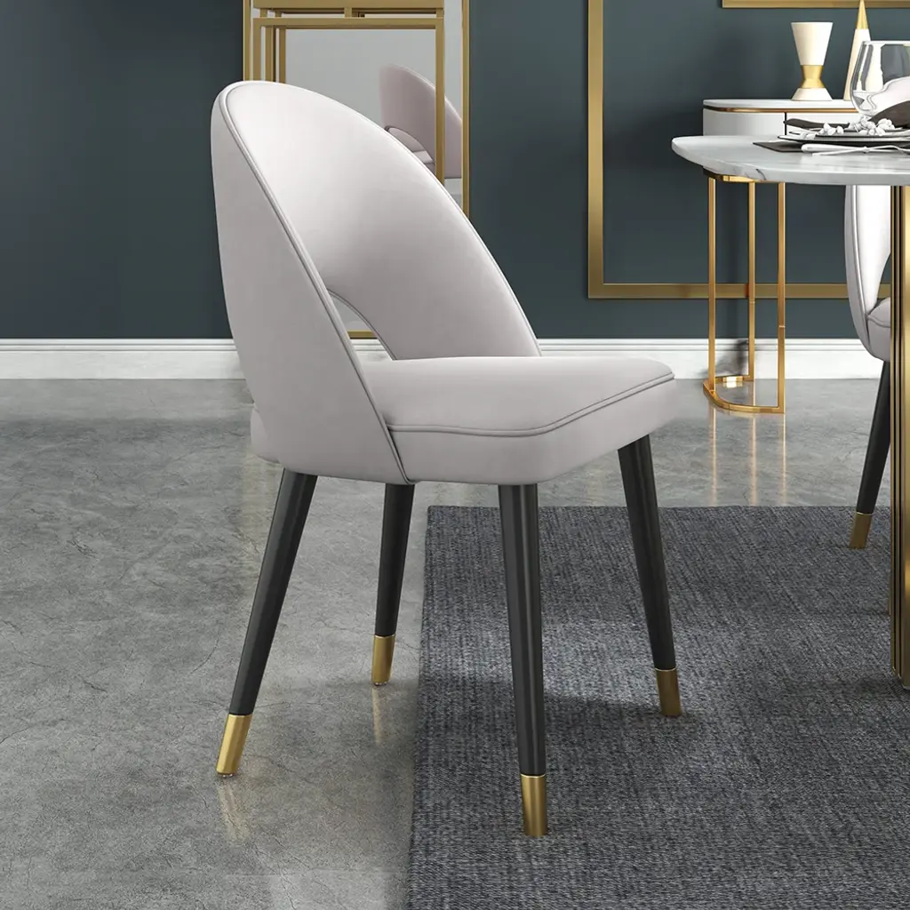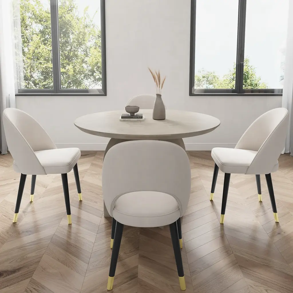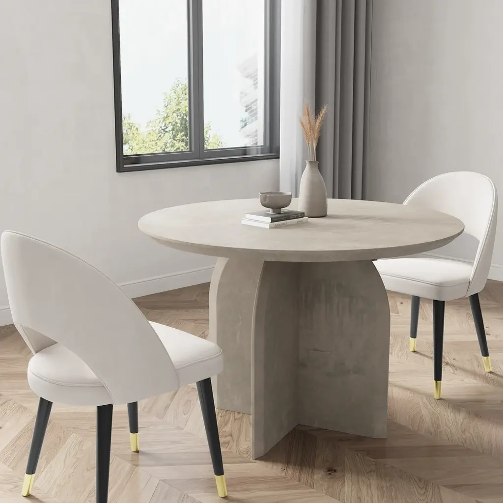 This sleek dining table brings simple into modern. The circular top is designed to hold four people, making sure it is extra safe for the elderly and kids. It has a pinewood pedestal base offering sturdy stability. Have a good time with your families and friends and enjoy good food. This comfortable chair is made of velvet and features angled legs. It radiates a mid-century modernist vibe, characterized by a broad curved backrest and an armless profile.