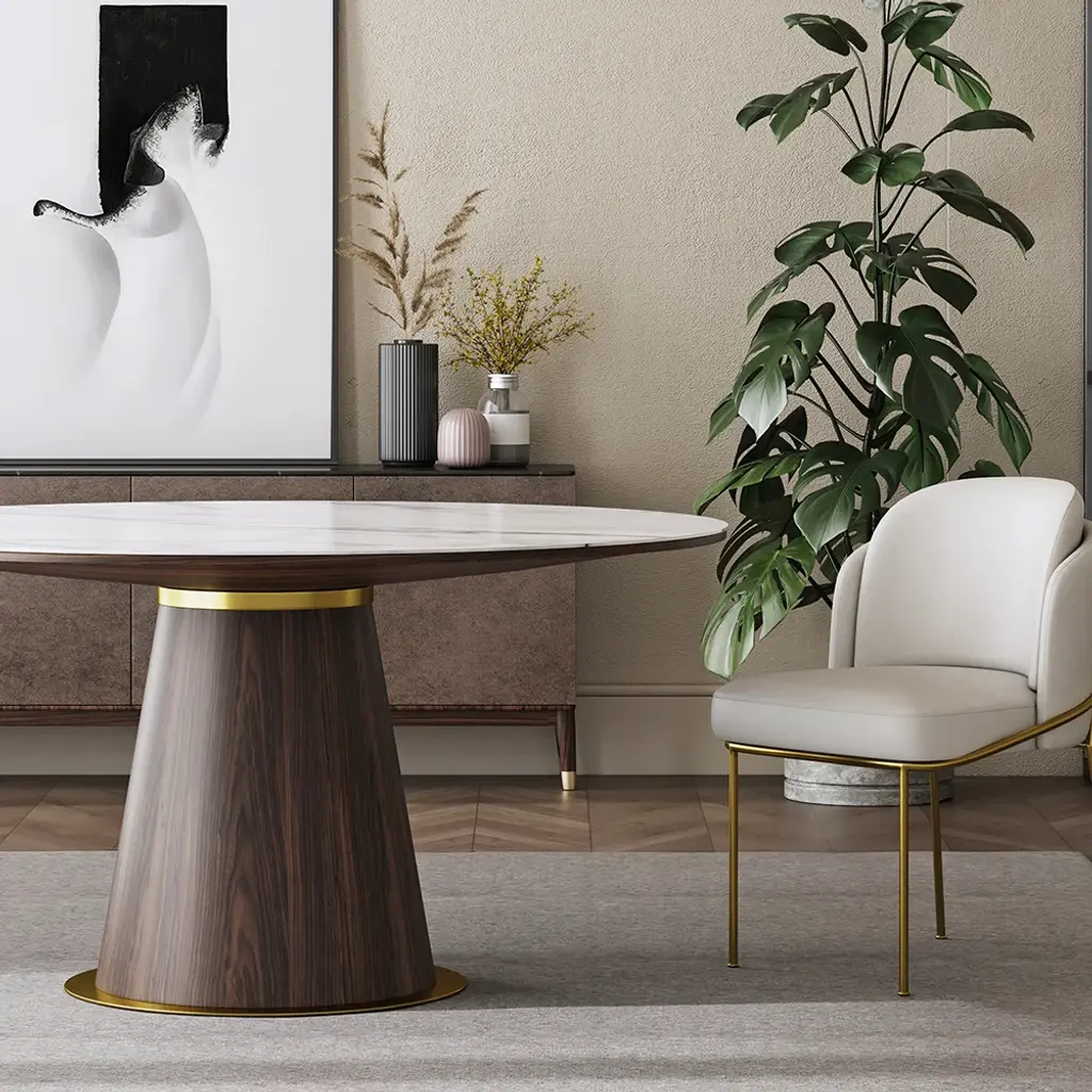 Featuring a sintered stone top, this dining table showcases refined natural beauty, adding elegance to any space. The rounded contour comfortably seats six. Level up your dining with the Linenic White Dining Chair, a modern side chair with a strong gold stainless steel frame and a quilted seat upholstered in cotton and linen for maximum comfort and style. Ideal for any environment-from houses to restaurants, bars, and cafes-it will add a touch of elegance wherever you need functionality.