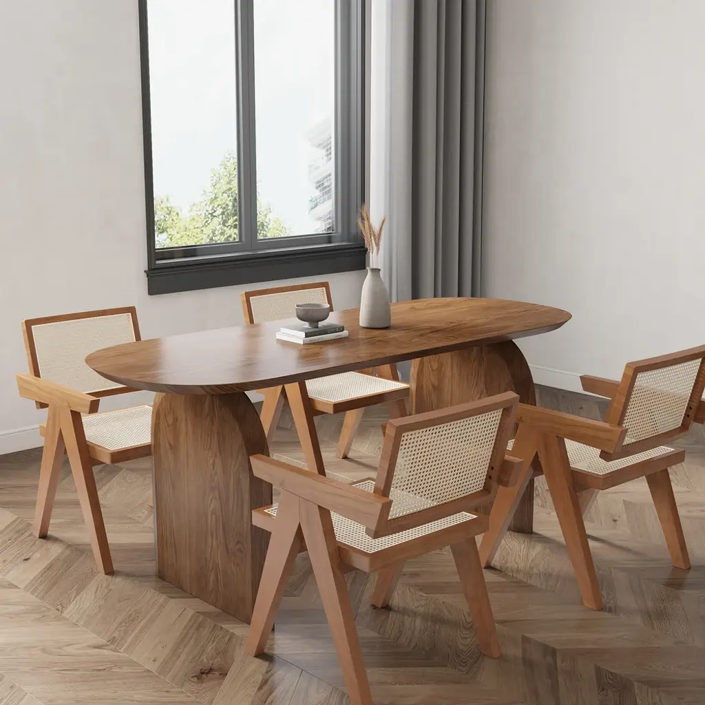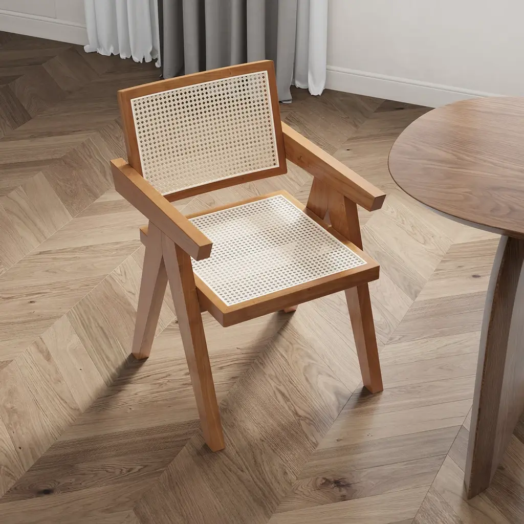 This sleek dining table brings simple into modern. The circular top is designed to hold four people, making sure it is extra safe for the elderly and kids. It has a pinewood pedestal base offering sturdy stability. Have a good time with your families and friends and enjoy good food. Give your dining room a decidedly retro touch by inviting the dining armchair to your table! Made from solid wood and rattan canework, it is right on trend with the vintage trends of the moment. Thanks to its armrests, this seat will provide you with the necessary comfort while you dine.