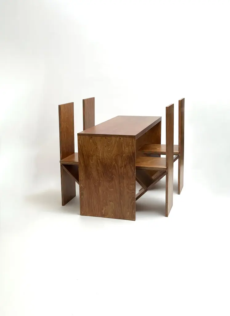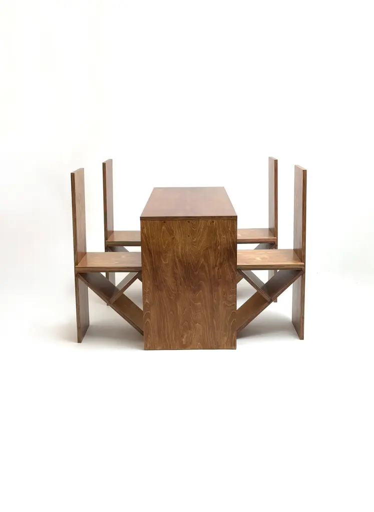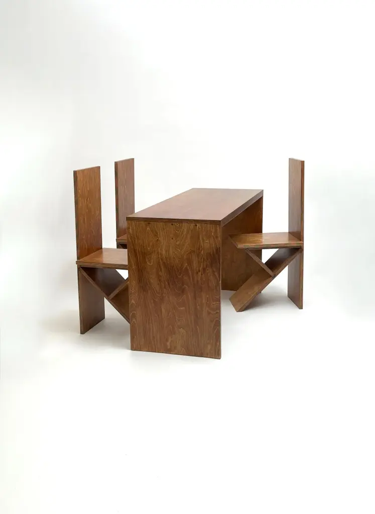 Dining Set by GoonsDimensions: Table: W 130 x D 50 x H 74 cmChair: 35 x 40 x 95 cmMaterials: Wood.Goons is located in Paris, France. All of their designs are made out of wood.