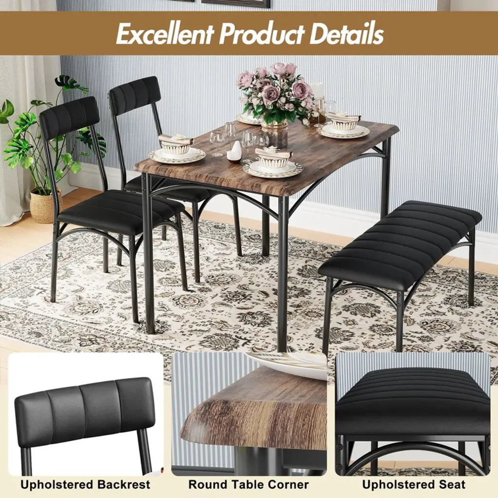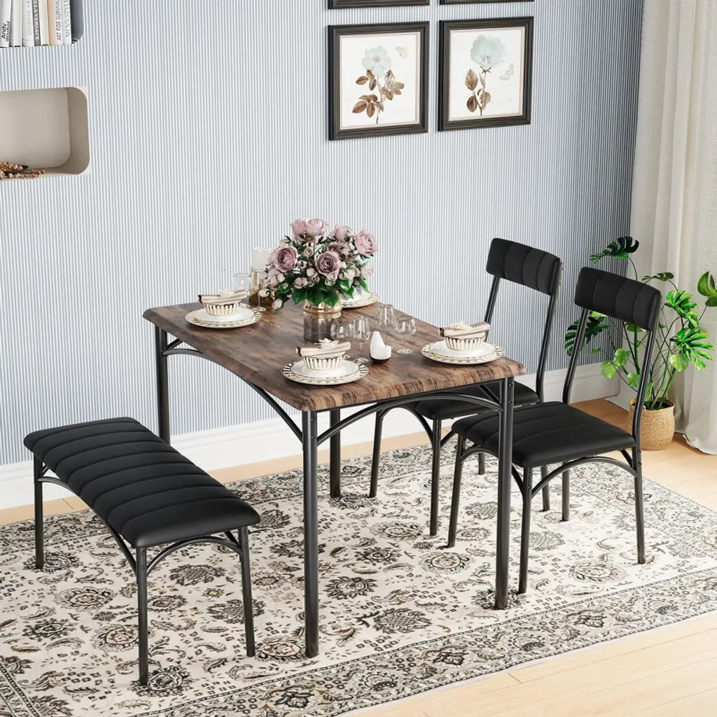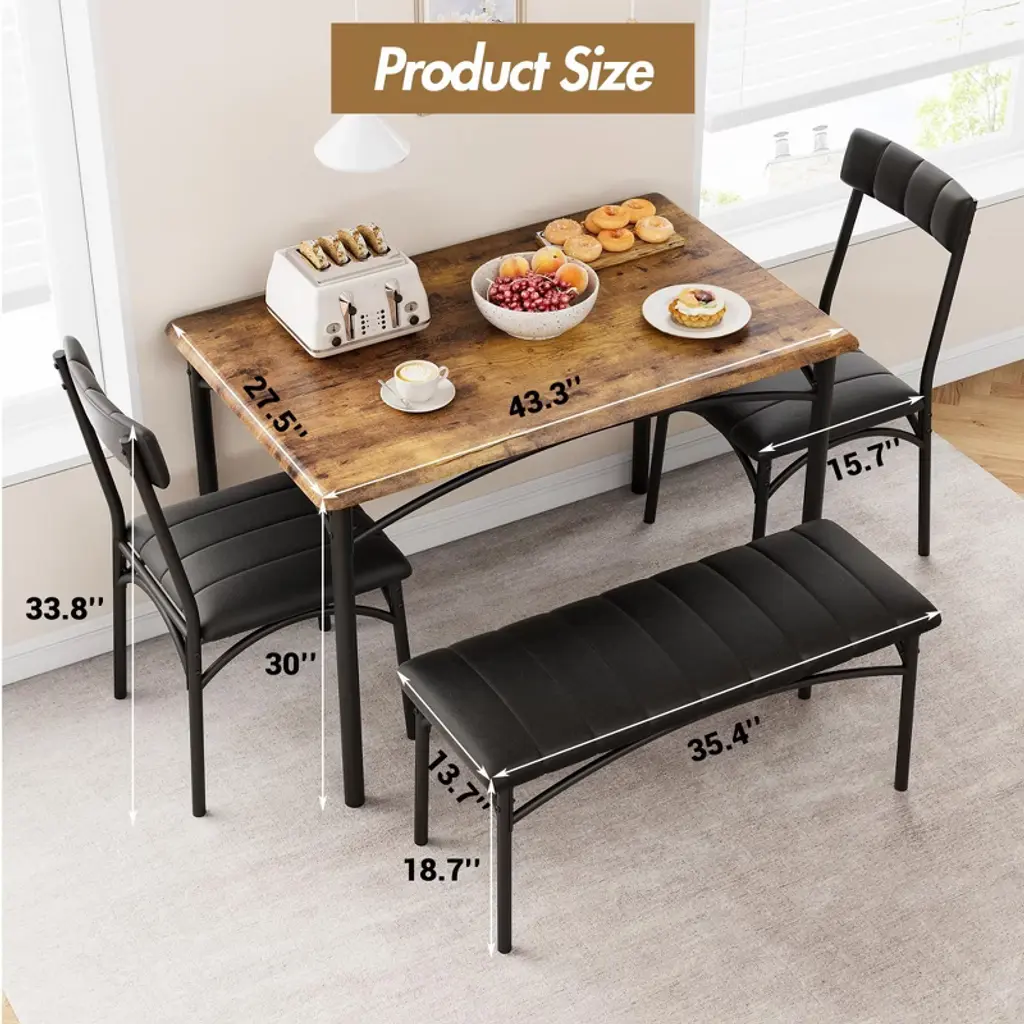 Comfortable Dining Experience: The table and chairs set comes with upholstered chairs and a plush bench made of PU leather and high-density foam. The padded backrest ensures great support for every meal, from casual breakfasts to festive dinnersSpace-Saving Elegance: This rectangular dining table set for four is ideal for cozy spaces. Its sleek design allows the chairs and bench to tuck neatly underneath the table, maximizing your living area without sacrificing style or comfortRobust and Stylish Construction: The modern dining set features thick engineered wood and sturdy metal legs, reinforced with arched iron tubing for added stability and style. It's built to endure daily use while making a striking statement in dining areaEasy Maintenance: This bistro table and chair set boasts a waterproof surface that resists damage from spills. A quick wipe with a damp cloth keeps your dining set looking pristine, letting you enjoy meals with less cleanupSimple Assembly: The dinette set allows for quick assembly with labeled parts and clear instructions. This versatile table, with two upholstered chairs and a bench, fits perfectly in kitchens, dining rooms, and cafes, adding modern charm to any space