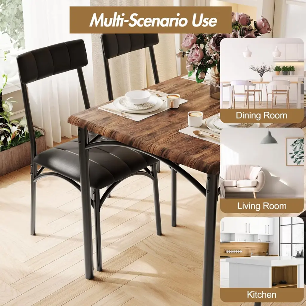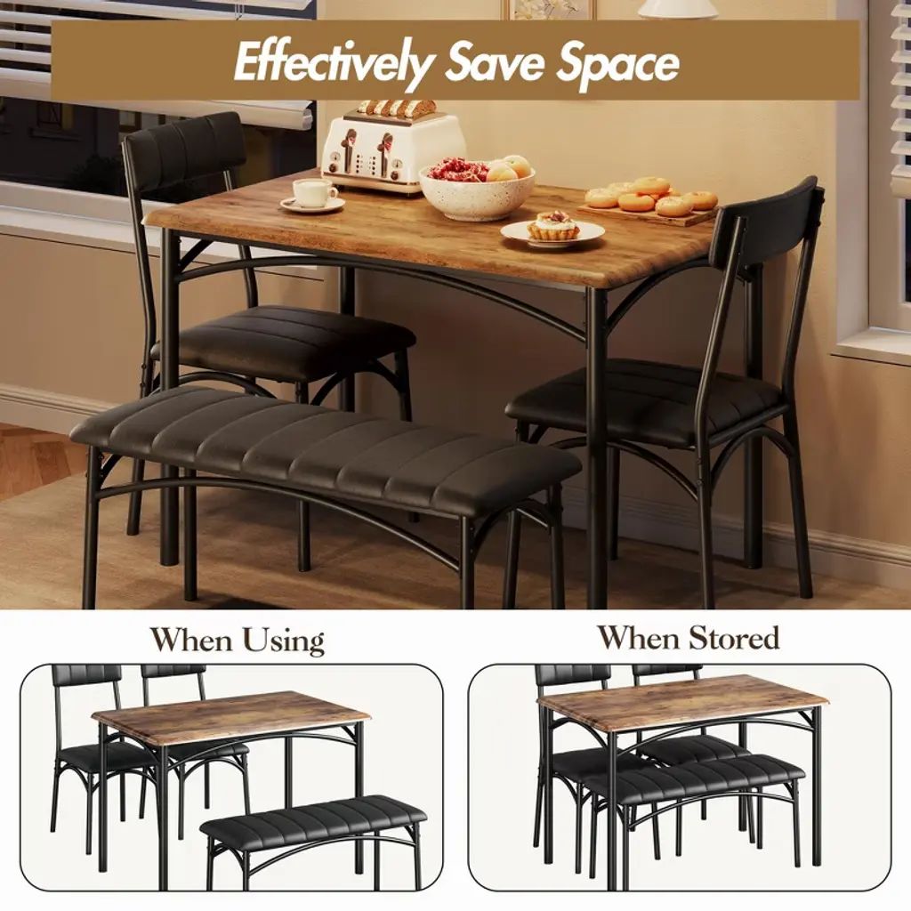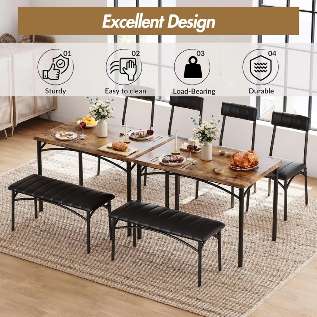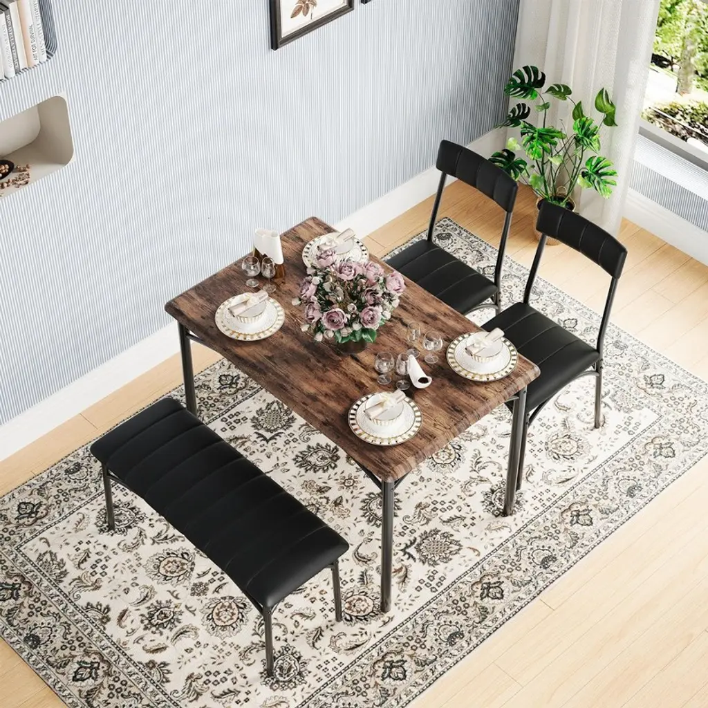 Comfortable Dining Experience: The table and chairs set comes with upholstered chairs and a plush bench made of PU leather and high-density foam. The padded backrest ensures great support for every meal, from casual breakfasts to festive dinnersSpace-Saving Elegance: This rectangular dining table set for four is ideal for cozy spaces. Its sleek design allows the chairs and bench to tuck neatly underneath the table, maximizing your living area without sacrificing style or comfortRobust and Stylish Construction: The modern dining set features thick engineered wood and sturdy metal legs, reinforced with arched iron tubing for added stability and style. It's built to endure daily use while making a striking statement in dining areaEasy Maintenance: This bistro table and chair set boasts a waterproof surface that resists damage from spills. A quick wipe with a damp cloth keeps your dining set looking pristine, letting you enjoy meals with less cleanupSimple Assembly: The dinette set allows for quick assembly with labeled parts and clear instructions. This versatile table, with two upholstered chairs and a bench, fits perfectly in kitchens, dining rooms, and cafes, adding modern charm to any space
