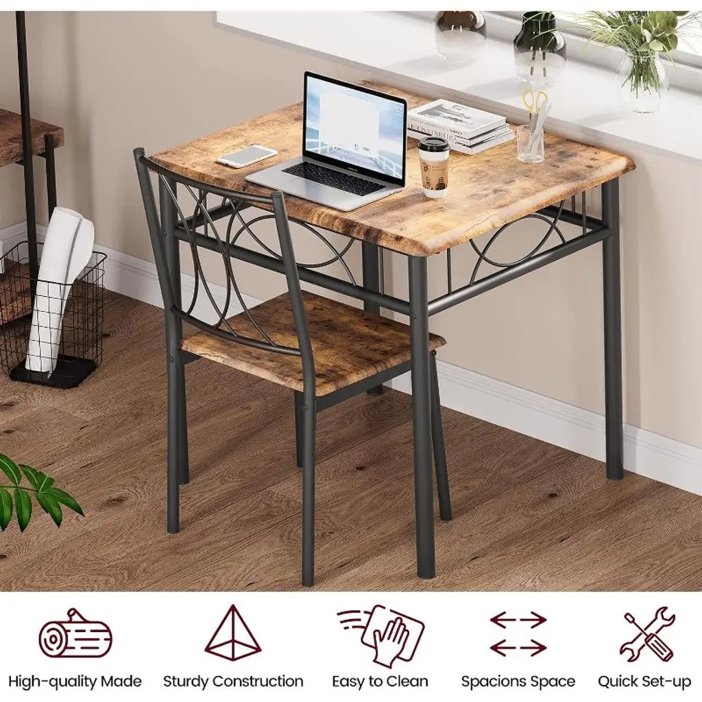 Compact table perfectly fits small spaces, making it ideal for apartments. Chairs conveniently tuck under the table when not in use, maximizing your space. Waterproof surface allows for easy cleaning; Simply wipe away stains and sauces with a damp cloth. Thick engineered wood panel paired with a metal frame for long-lasting use. Comfortable chairs enhance your dining experience. Rustic wood grain surface with a wrought iron frame adds modern farmhouse charm to any setting. Serves as a breakfast nook table, bistro table, or home office table to suit your lifestyle needs.