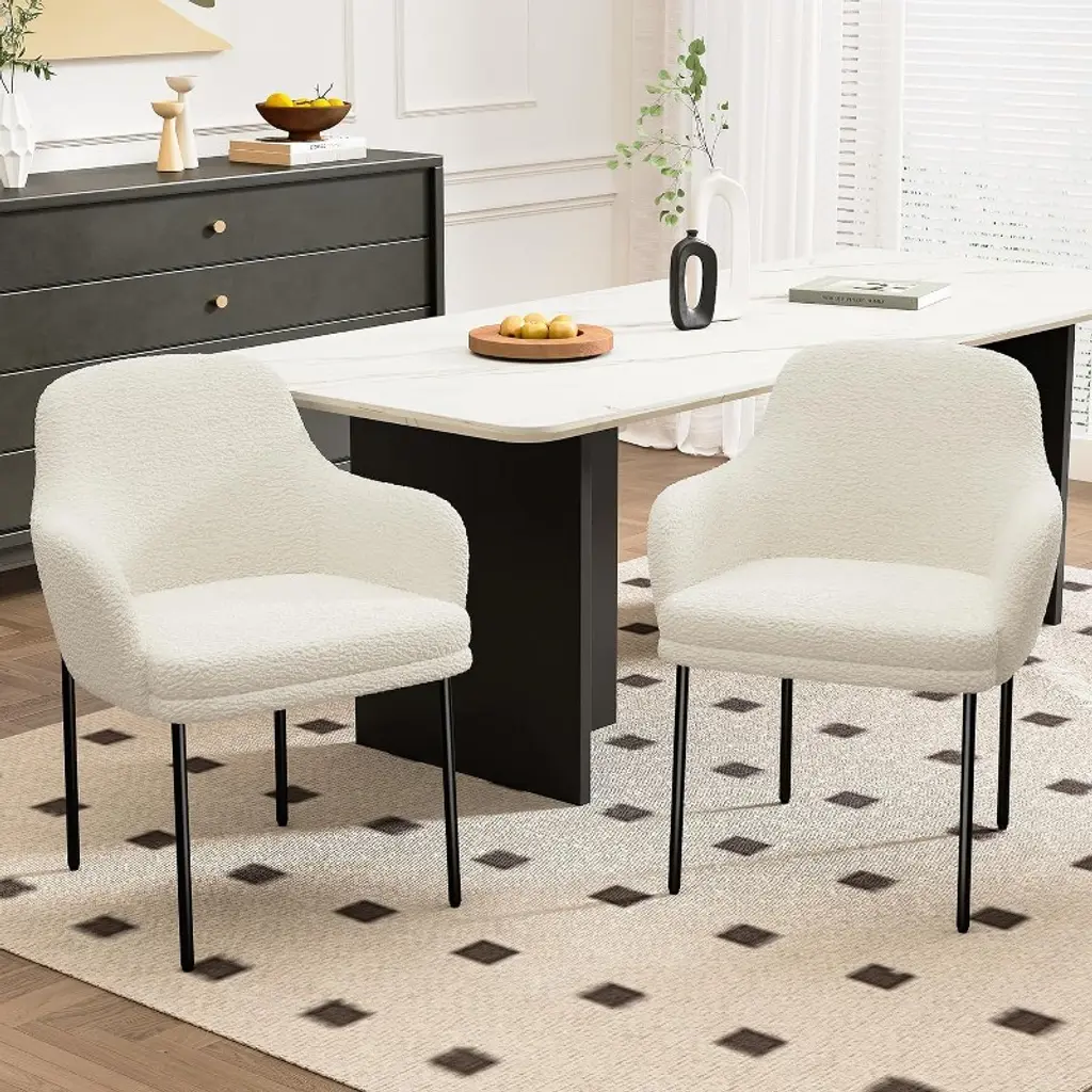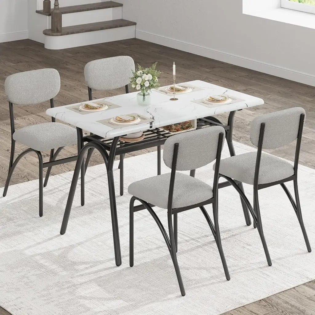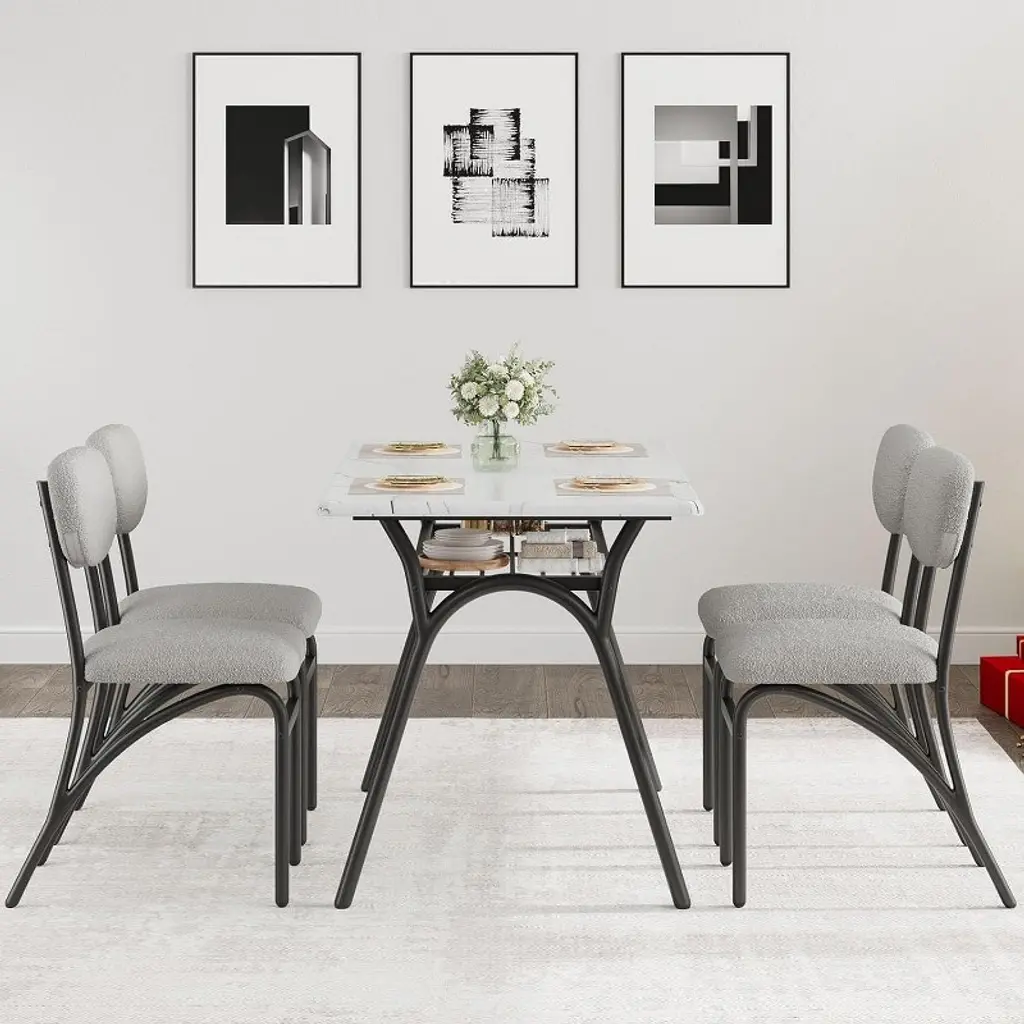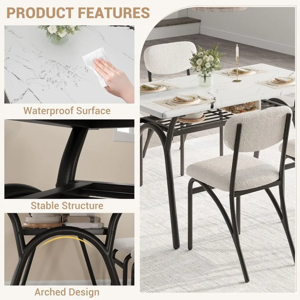 Dining Table Set With 4 Chairs Kitchen Table With Boucle Chairs For 4 Marble-look Rectangular Table & 4 Upholstered Armchairs