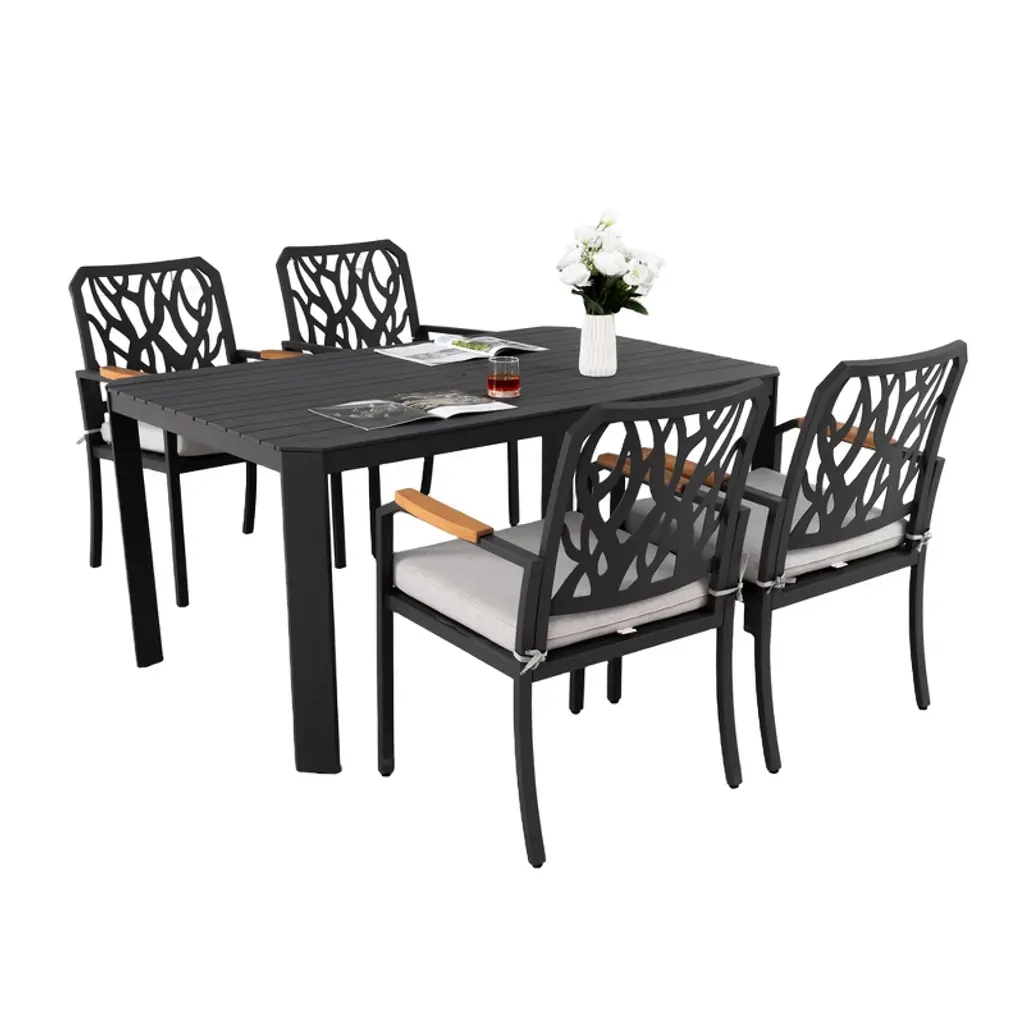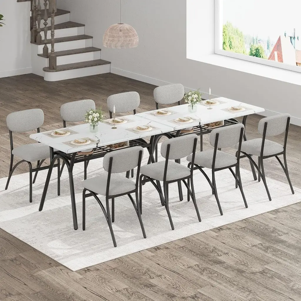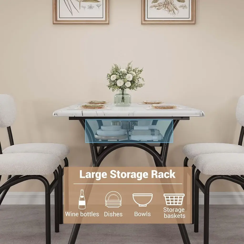 Level up your dining space with our 4-piece rectangular table set. It pairs a modern table with four boucle chairs, and its sleek, minimalist look fits any home decor. The waterproof surface makes cleaning a cinch and lasts for years, perfect for everyday meals.The table’s a game-changer with an integrated storage rack. Built from quality materials and a tough metal frame, it’s great for stashing dishes, wine, and more. The thick tabletop won’t warp, and the four sturdy legs with non-slip pads keep it steady while protecting your floors.You’ll have your new dining set ready in no time.