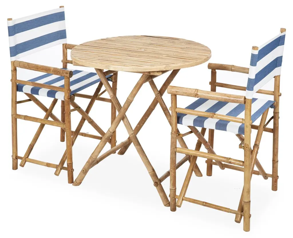 An ideal setup for sharing an alfresco meal or having cocktails at sunset, this artisanal set of table and chairs is made of durable, lightweight, natural bamboo. Each chair has a canvas seat and back. Because each item is made using natural materials, minor variations should be expected.
