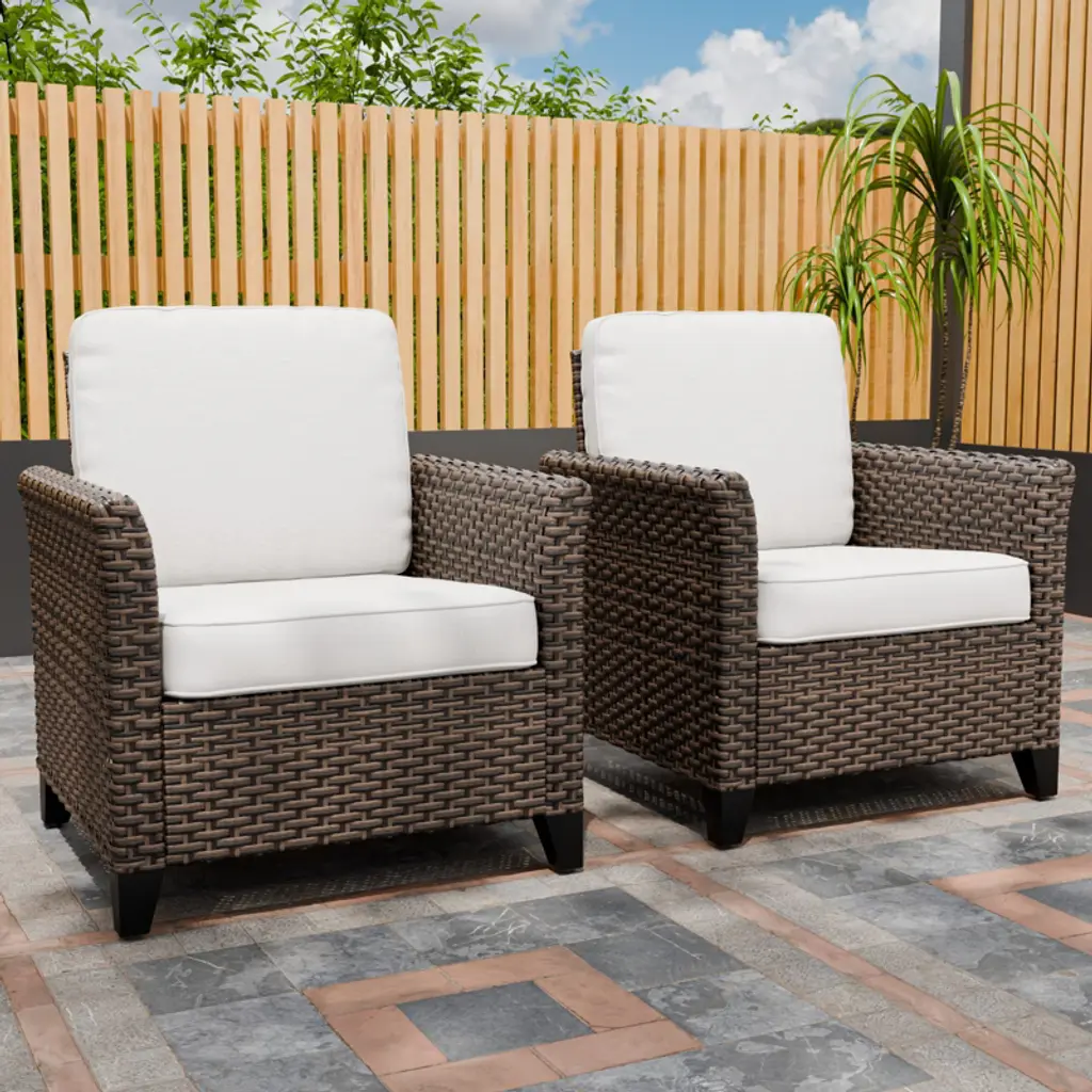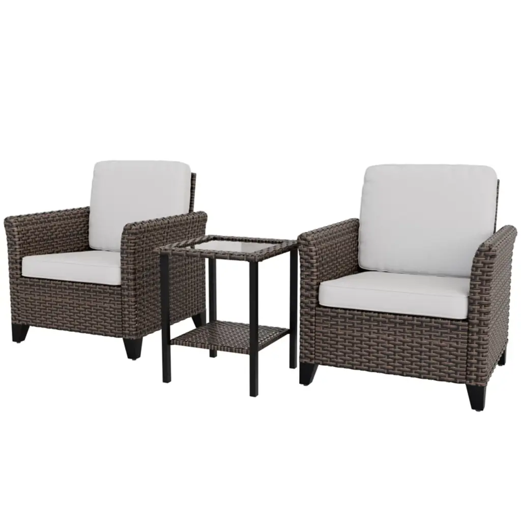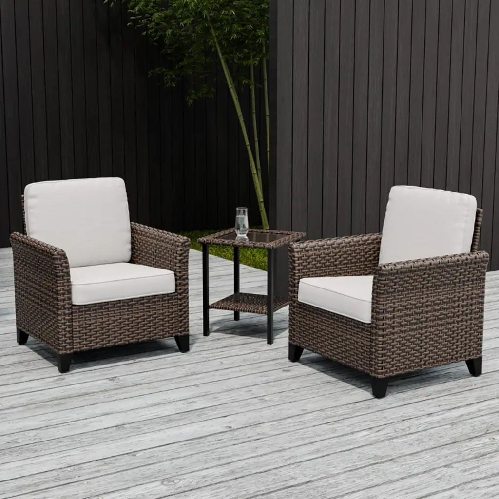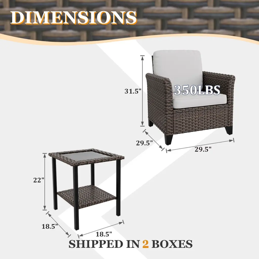 "Our patio wicker conversation set blends traditional style with modern elegance, enhancing your outdoor space. Rich brown tones match any decor, making it a great addition to your patio. Constructed with all-weather PE wicker and a powder-coated steel frame, the chairs are durable and low-maintenance. Ergonomic armrests and backrests provide comfort, while 4-inch cushions with removable zippers ensure convenience. Installation accessories and instructions are included. "