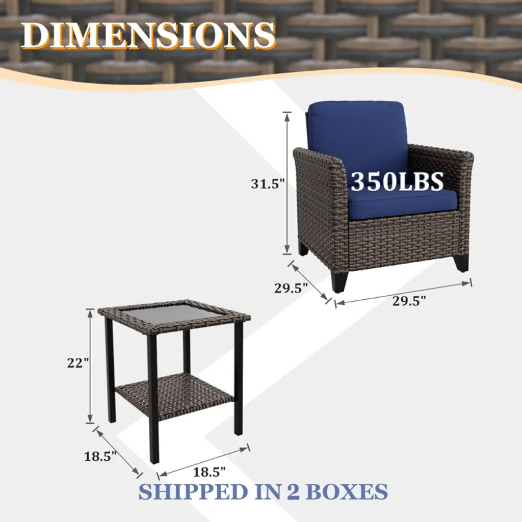 Eagle Peak Ocean Vista 3 Piece Outdoor Wicker Bistro Set, Variated Wicker Conversation Dining Chair Set With Side Table, Blue