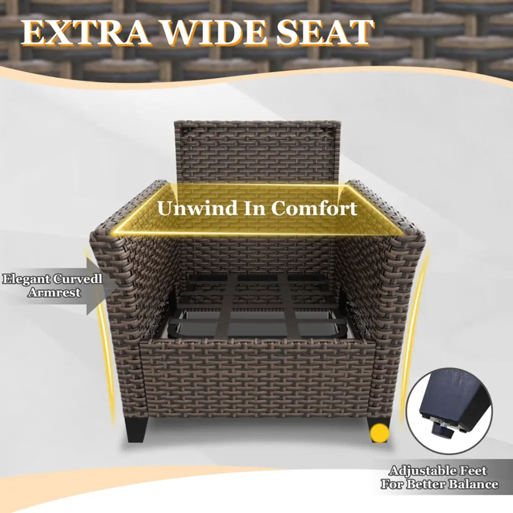 "Our patio wicker conversation set blends traditional style with modern elegance, enhancing your outdoor space. Rich brown tones match any decor, making it a great addition to your patio. Constructed with all-weather PE wicker and a powder-coated steel frame, the chairs are durable and low-maintenance. Ergonomic armrests and backrests provide comfort, while 4-inch cushions with removable zippers ensure convenience. Installation accessories and instructions are included. "
