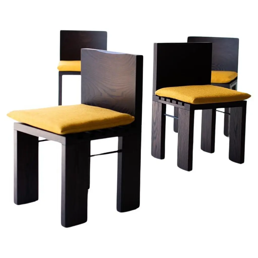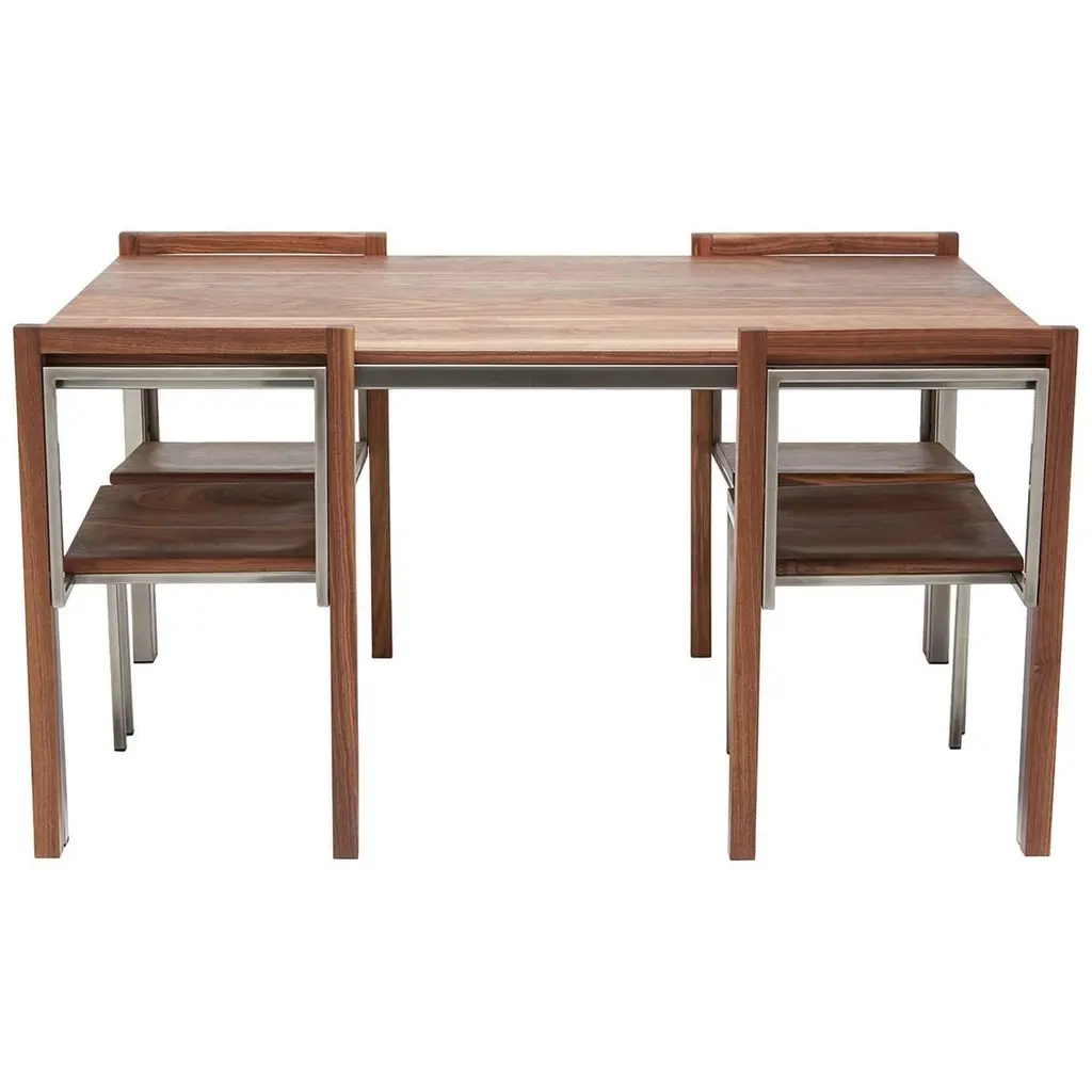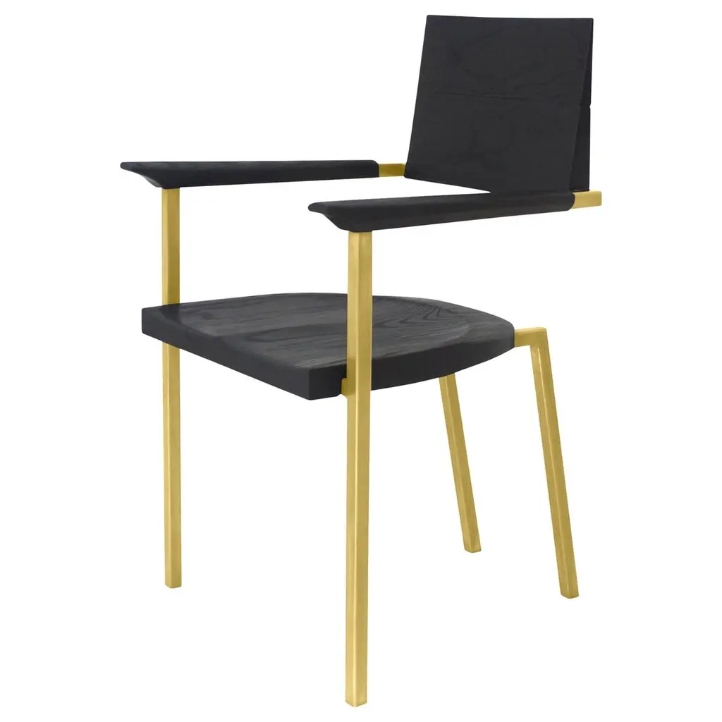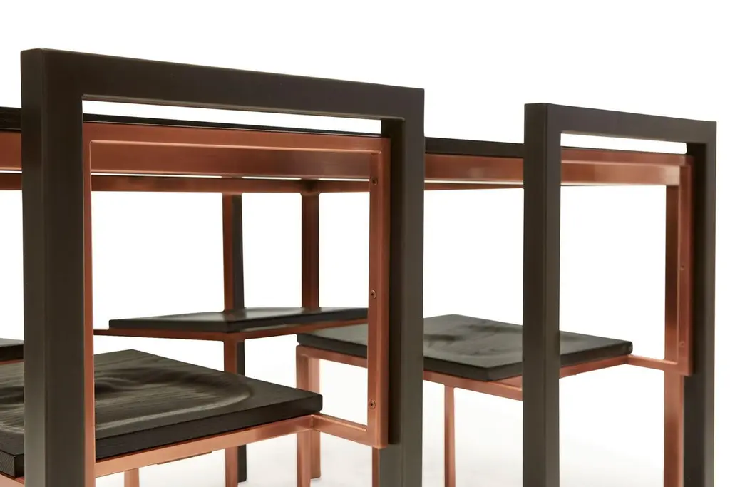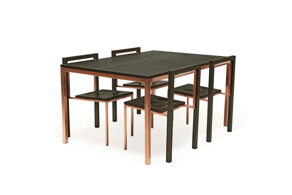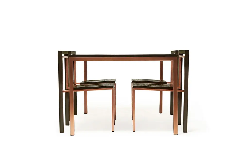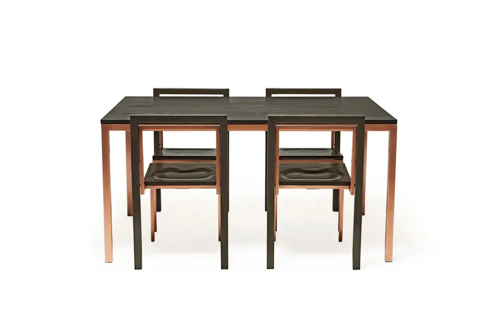 Clean lines and high quality materials are the basis of Stephen Kenn's Inheritance Collection. This simple yet elegant dining set features a solid ebonized oak tabletop with an antique copper-plated steel base. The table is paired with four matching chairs, each with a molded ebonized oak seat, antique copper-plated base frame, and blackened steel back frame.Every Stephen Kenn piece is made to order through our Los Angeles studio. We create these pieces utilizing a number of small businesses and fabricators in the LA area. We welcome inquiries about custom dimensions or custom material combinations to best fit your space and personal aesthetic.