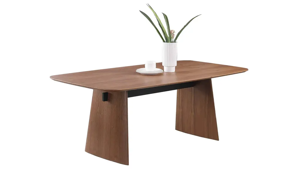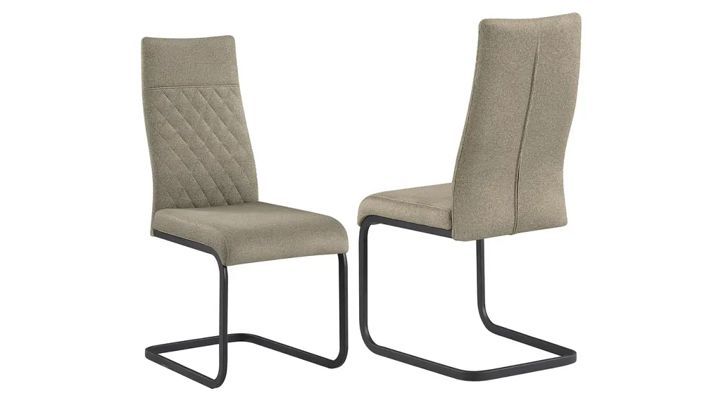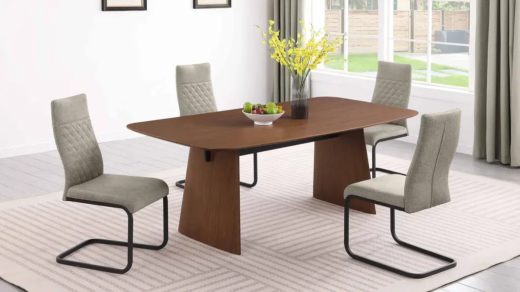 Gather around this stylish modern wooden Eden 5-pc. Dining Set. A double pedestal base supports the elegant 39" by 79" tabletop, all set in a walnut finish. Artful design is evident in the steel crossbar accent in a matte black finish. The matching chairs features a curved back with a diamond stitch pattern in a sleek taupe fabric upholstery, this chair also showcases a waterfall edge seat cushion for added comfort. The cantilever base in a matte black finish completes the look.