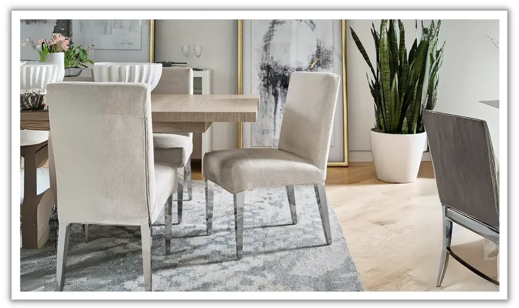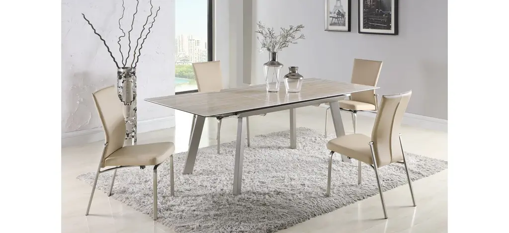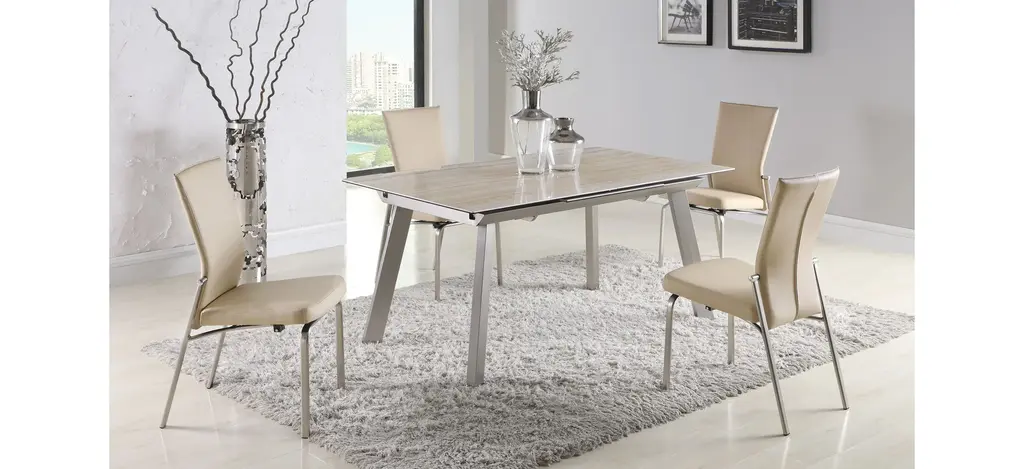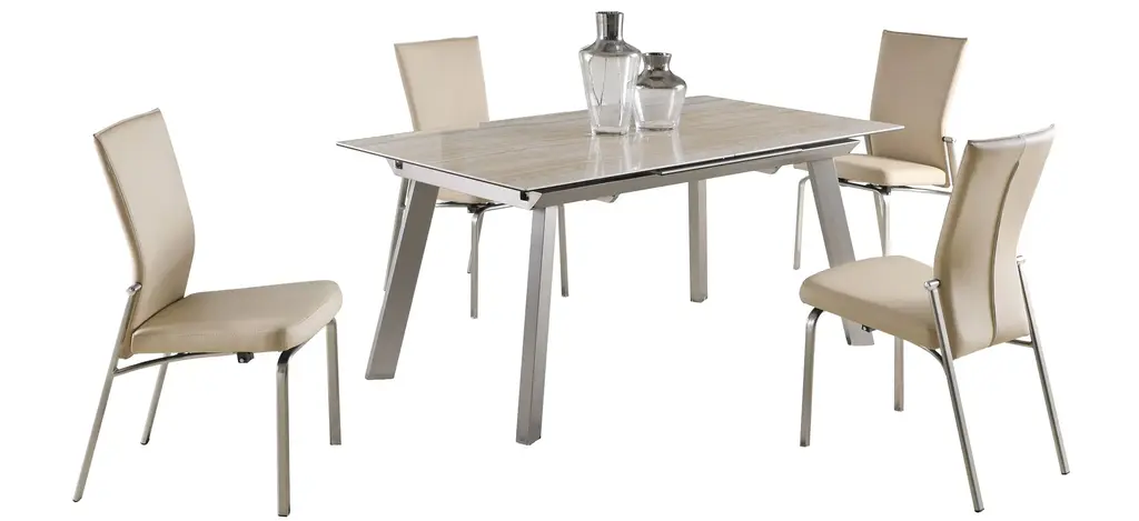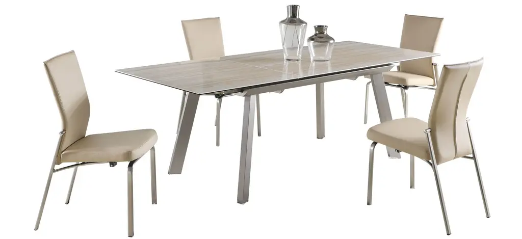 This Eleanoir dining set features an extendable ceramic top table on brushed stainless steel open square legs. The relaxing motion-back chairs are upholstered faux leather with a fashionable accent zipper on the backrestand mounted on a brushed stainless steel frame.