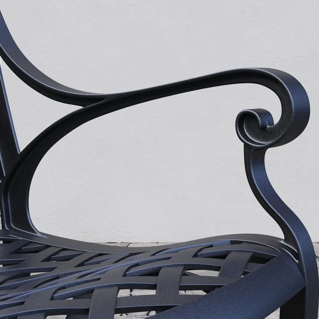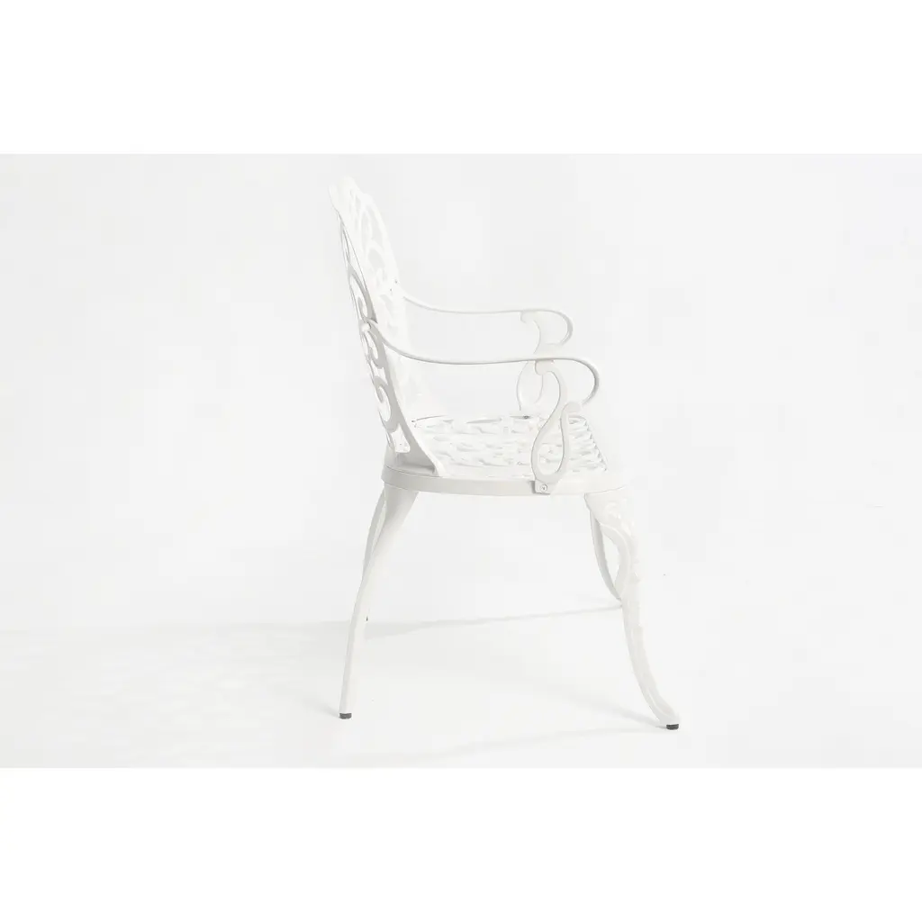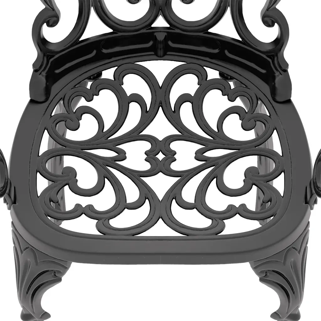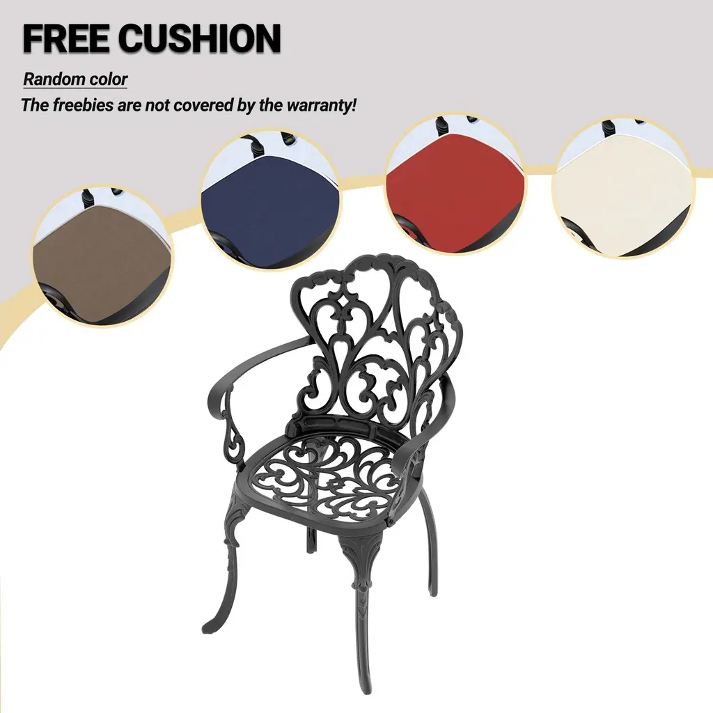 This patio chair set is a wonderful choice for your outdoor space. It offers a combination of style and comfort. The cast aluminum construction ensures durability and resistance to the elements. The chairs are designed to provide a relaxing seating experience. The cushions add an extra layer of coziness, making it perfect for long hours of enjoyment. The elegant design enhances the aesthetic of your patio, creating a inviting and charming atmosphere. Whether for dining or simply unwinding, this chair set is a great addition to your outdoor living.