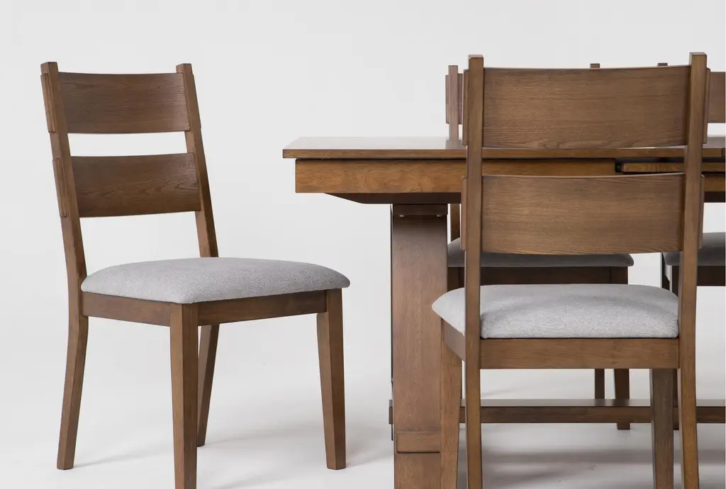 The Ellory Brown Wood 71-87" Extendable Dining Set for 6 is a modern addition to any dining room. Designed with functionality in mind, this dining set is perfect for both everyday meals and special gatherings. Crafted from a combination of elm veneer, MDF, rubberwood, and fabric, it promises durability and comfort for years to come.