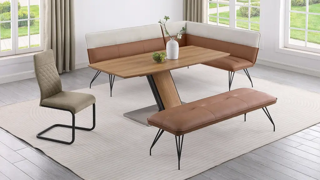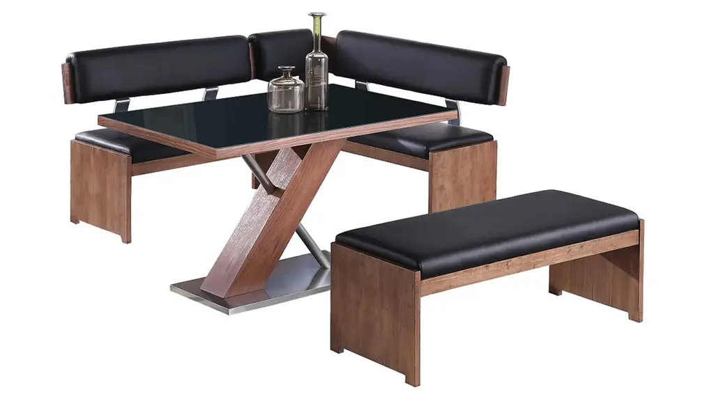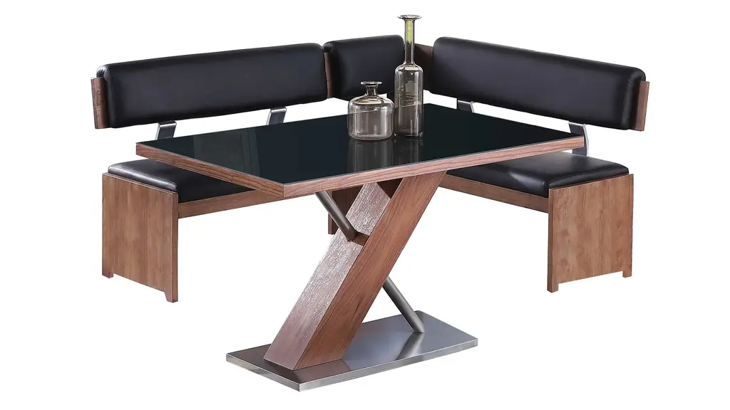 Emma 2-pc. Nook Dining Set in black glass and black faux leather upholstery wooden nook. Tempered glass and wooden body come together for a unique and dramatic presentation set on a x-shaped wooden and steel pedestal. A walnut veneer finish brings warmth into the room and contrasts with the enigmatic black glass. Add additional instant modern flair into any dining or living space with the matching wooden nook.