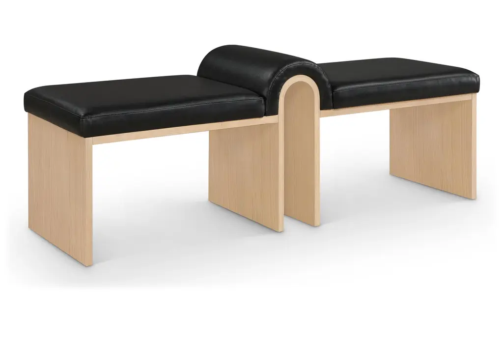 Emma 3-pc. Nook Dining Set in black glass, black faux leather upholstery wooden nook, and matching wooden bench. Tempered glass and wooden body come together for a unique and dramatic presentation set on a x-shaped wooden and steel pedestal. A walnut finish brings warmth into the room and contrasts with the enigmatic black glass. Add additional instant modern flair into any dining or living space with the matching wooden nook and bench in black faux leather upholstery.