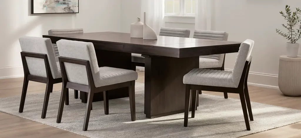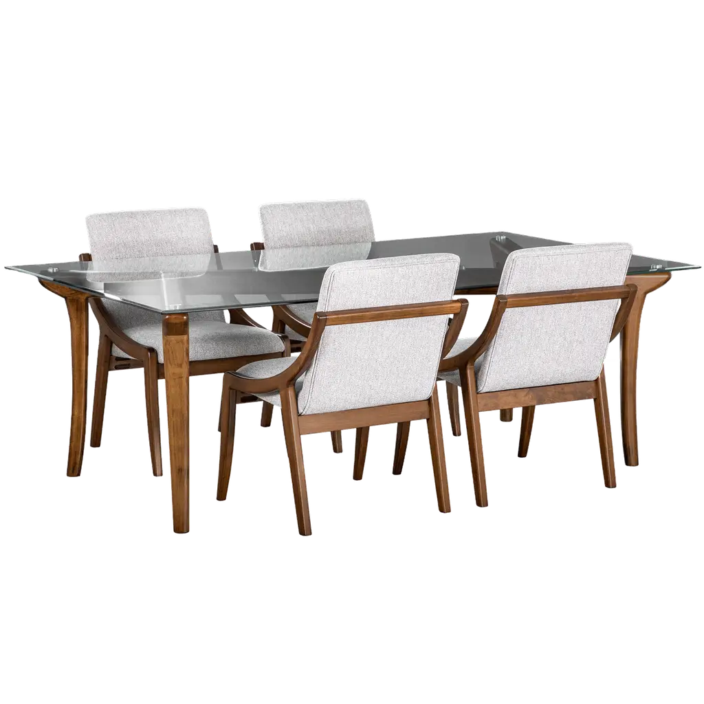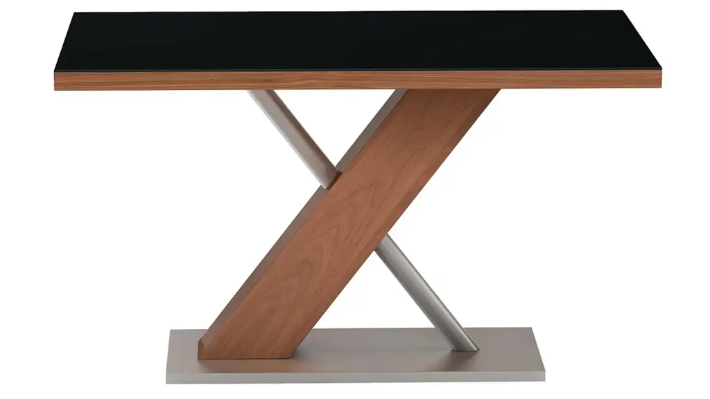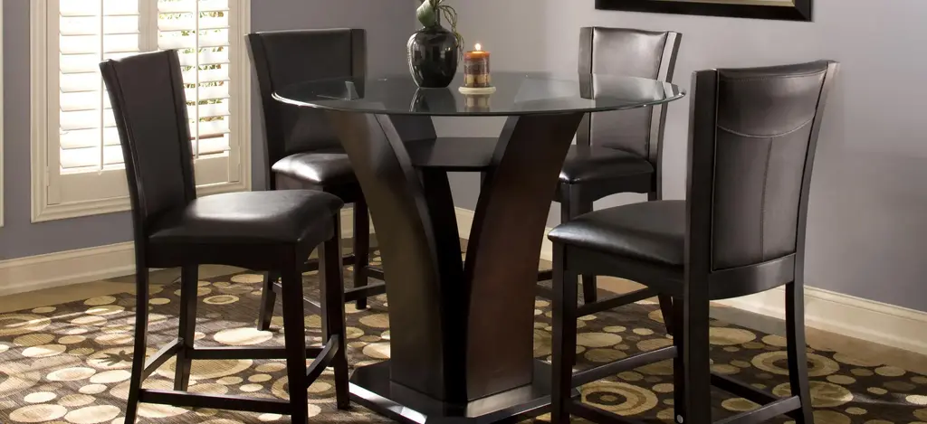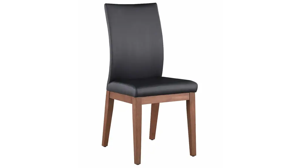 Emma 5-pc. Dining Set in black glass and four curved-back side chairs. Tempered glass and wooden body come together for a unique and dramatic presentation set on a x-shaped wooden and steel pedestal. A walnut finish brings warmth into the room and contrasts with the enigmatic black glass. Elegant and functional, these curved-back side chairs with black faux leather upholstery set atop a solid wood frame create a perfect matching set.