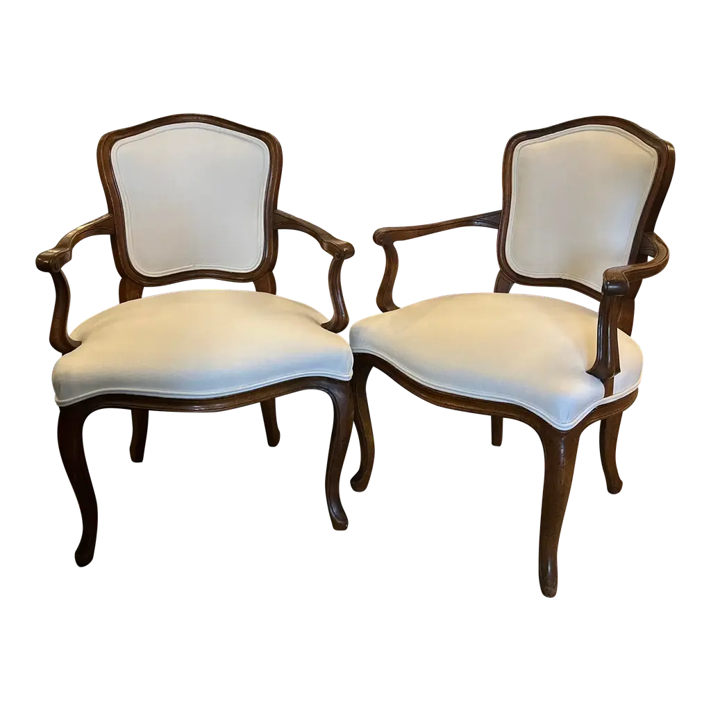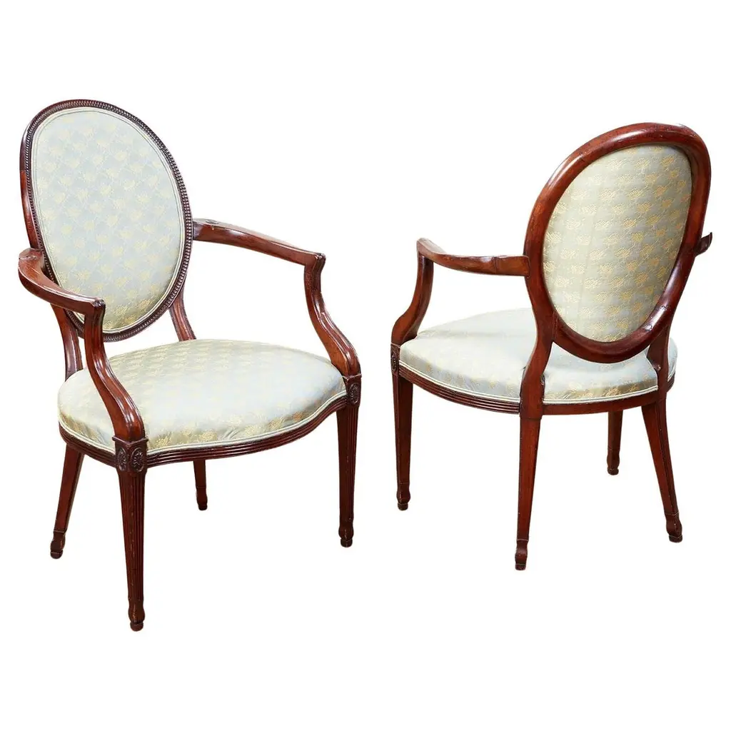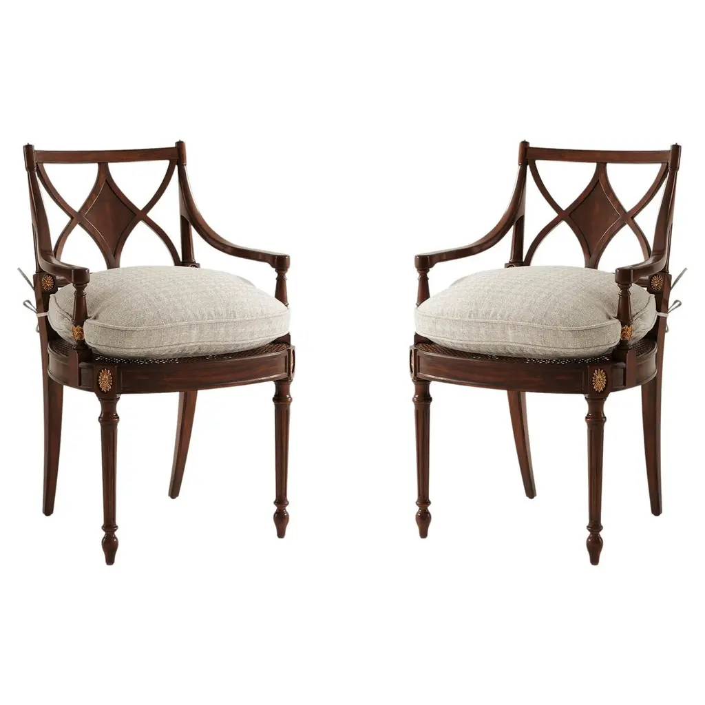 Constructed from rich mahogany, its intricate carvings and swirl mahogany veneered scroll on the top rail showcase masterful artistry. Brass accents add a subtle touch of refinement, harmonizing beautifully with the chair's classic design.Upholstered in sumptuous Cream fabric, this chair offers unparalleled comfort and a sophisticated aesthetic. The welted trim enhances the polished look, while the reeded, turned legs with splayed feet provide both sturdiness and style. Whether enhancing a formal dining room or creating a statement in a refined interior, this dining chair effortlessly blends luxury and functionality.Dimensions:23.5" W x 27.5" D x 41" HSeat - 19.75" HArm - 25.5" H