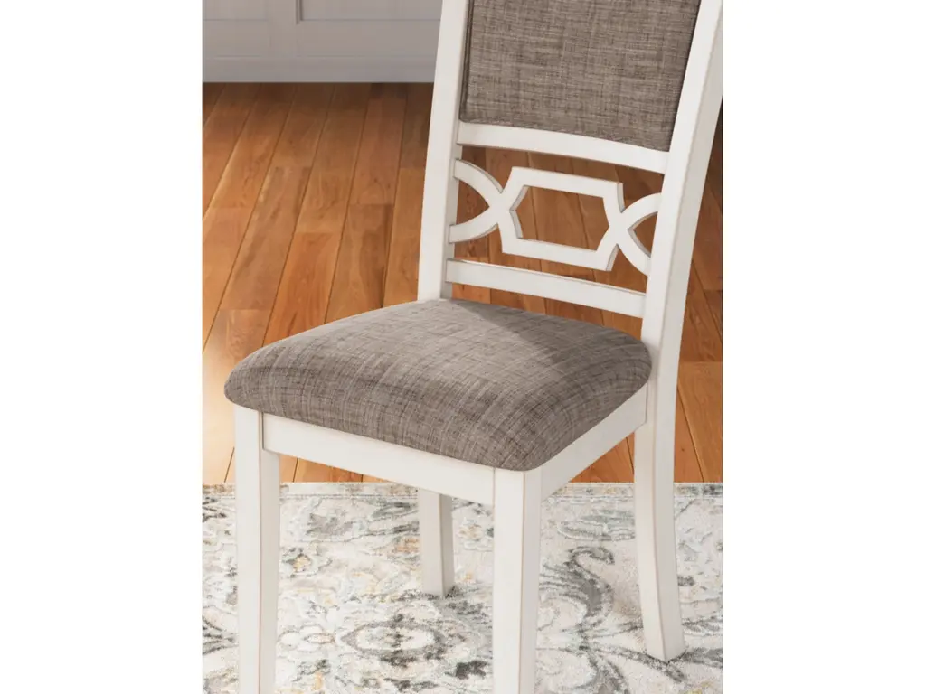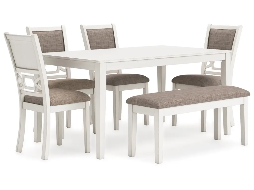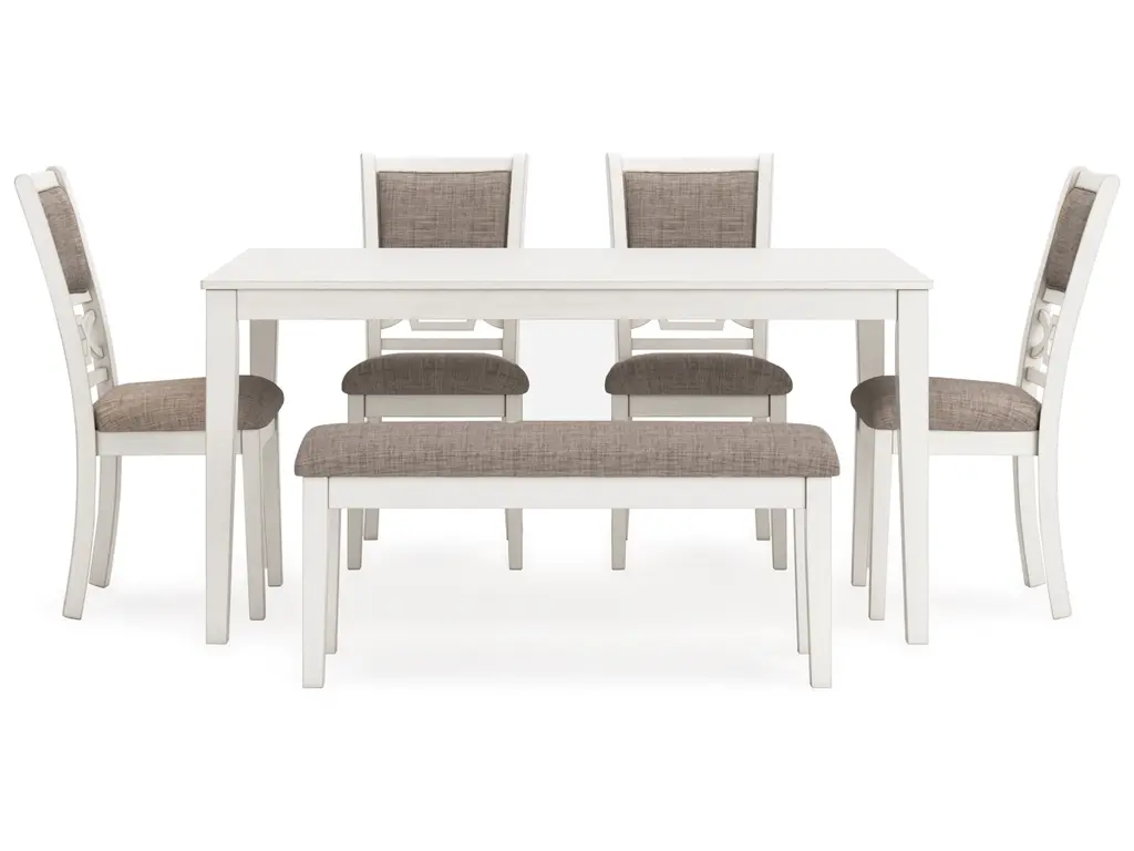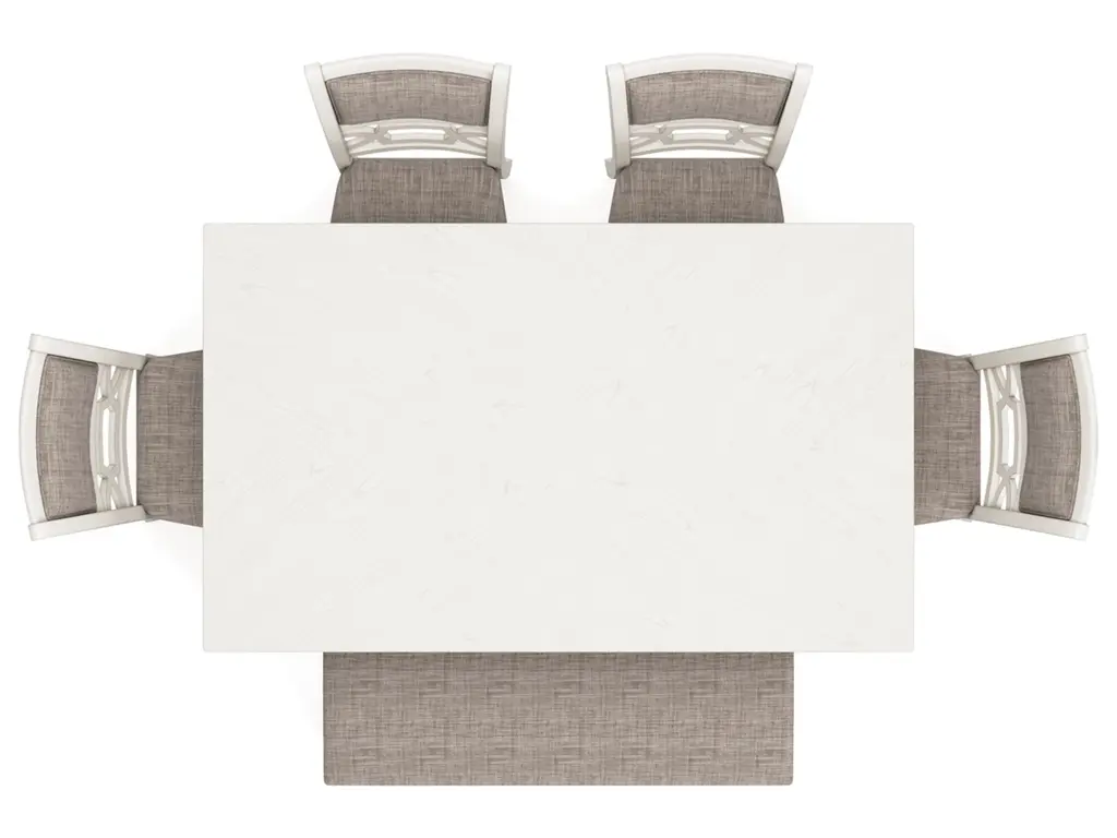 Come together for a delightful dining experience. Chic and relaxed, the Erinberg dining set effortlessly captivates with its elegant simplicity. The timeless design of the table, chairs and bench pairs a crisp white hue with gray textured upholstery. It's a fresh addition everyone will notice.