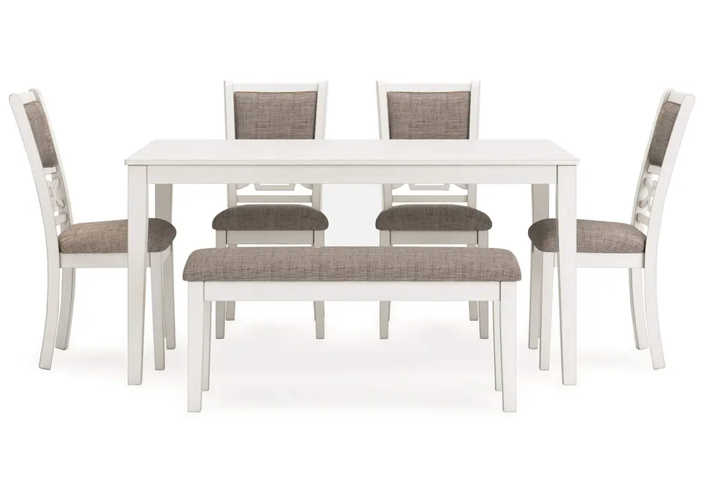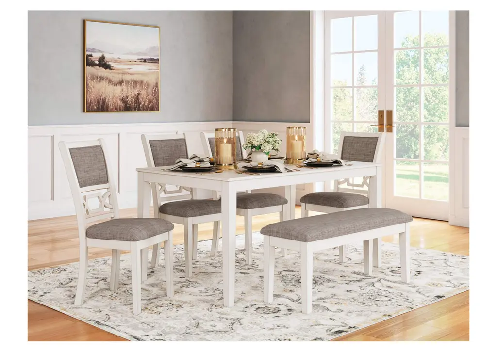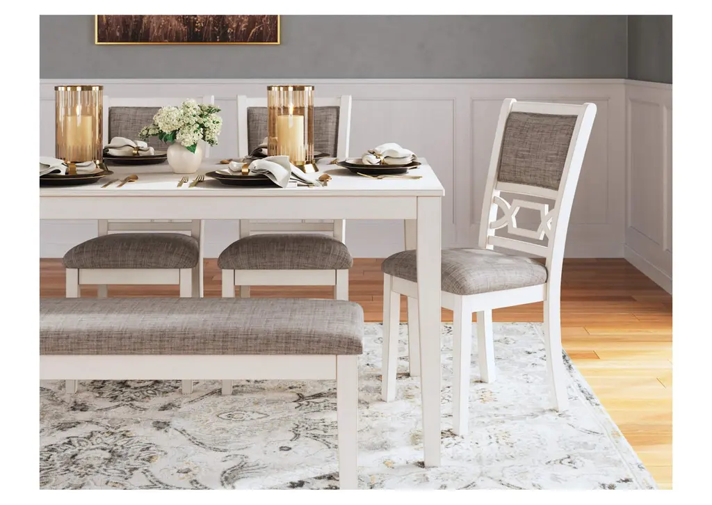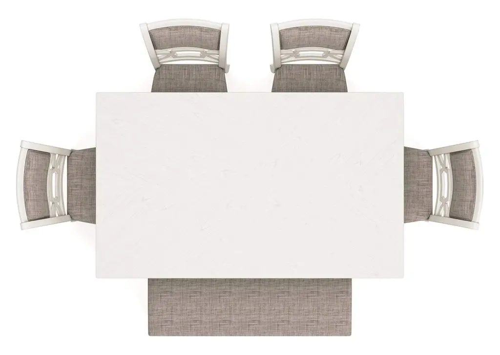 Come together for a delightful dining experience. Chic and relaxed, the Erinberg dining set effortlessly captivates with its elegant simplicity. The timeless design of the table, chairs and bench pairs a crisp white hue with gray textured upholstery. It's a fresh addition everyone will notice. Weight 164.000 lbs. (73.8kgs.)