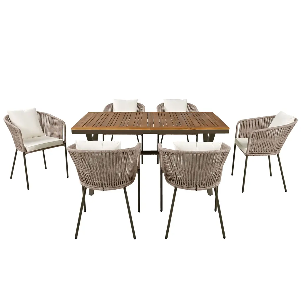 Perfect your outdoor dining experience with this stylish set, including a table and six chairs crafted for lasting comfort and support. The sturdy iron frame and rectangular wood tabletop provide a durable foundation, while the ergonomic chairs feature a curved backrest for added relaxation. Adjustable feet on both the table and chairs ensure stability on any surface, offering a secure setup for all your outdoor gatherings. With its classic rope weaving detail, this set adds a modern touch to any patio or garden space.