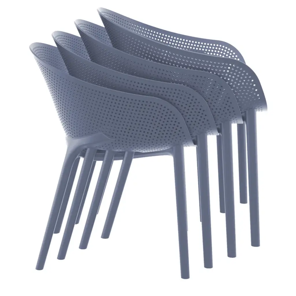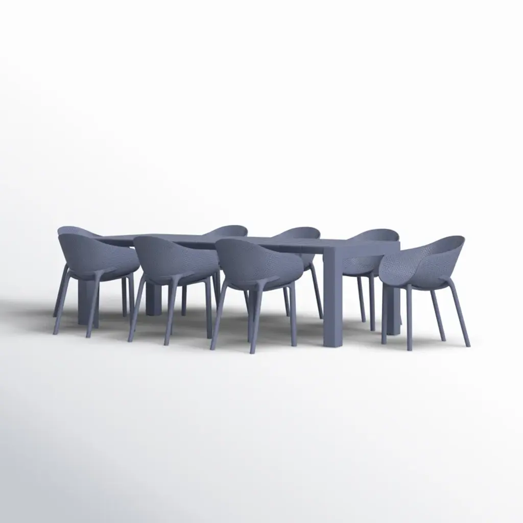 Fresh + airy. With the table fully extended, this sleek outdoor dining set seats up to eight people for BBQs and pool parties. The chairs feature perforations to keep you cool, and they stack for easy storage. Built from weather-resistant resin, this set stands up to sun, storms, and ketchup spots.