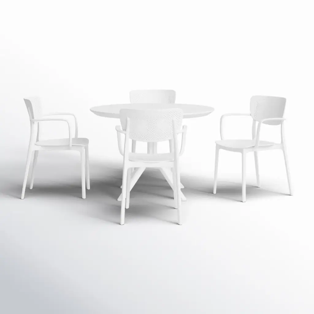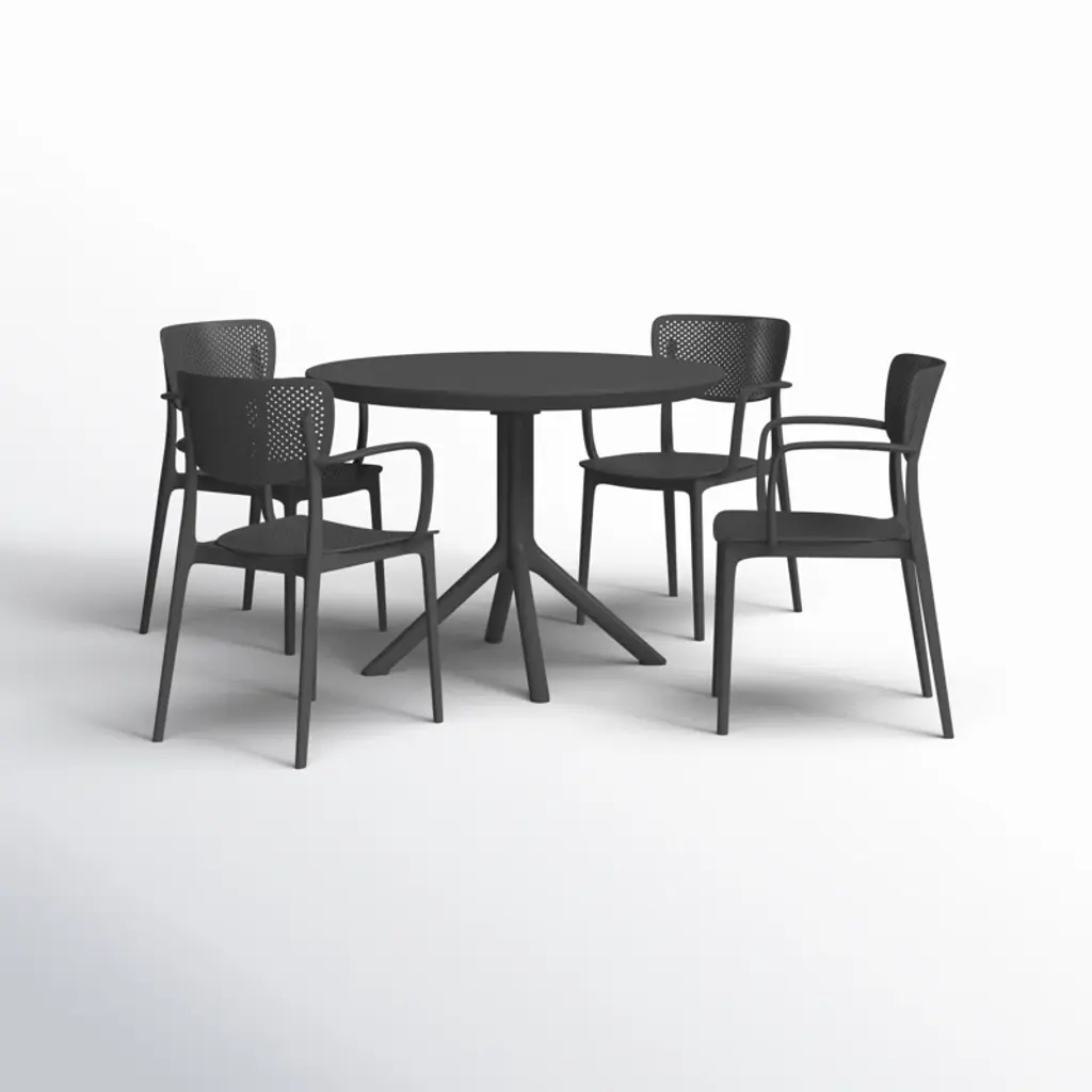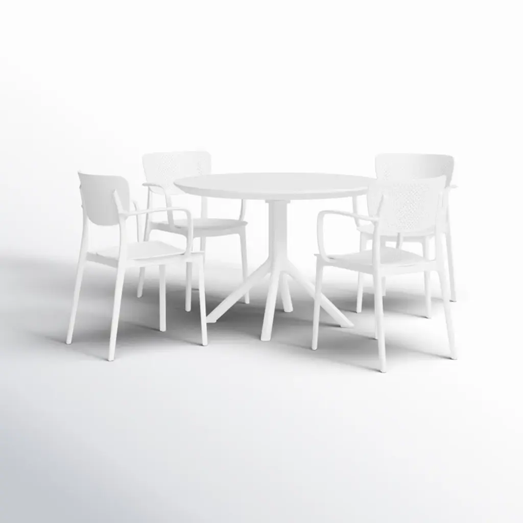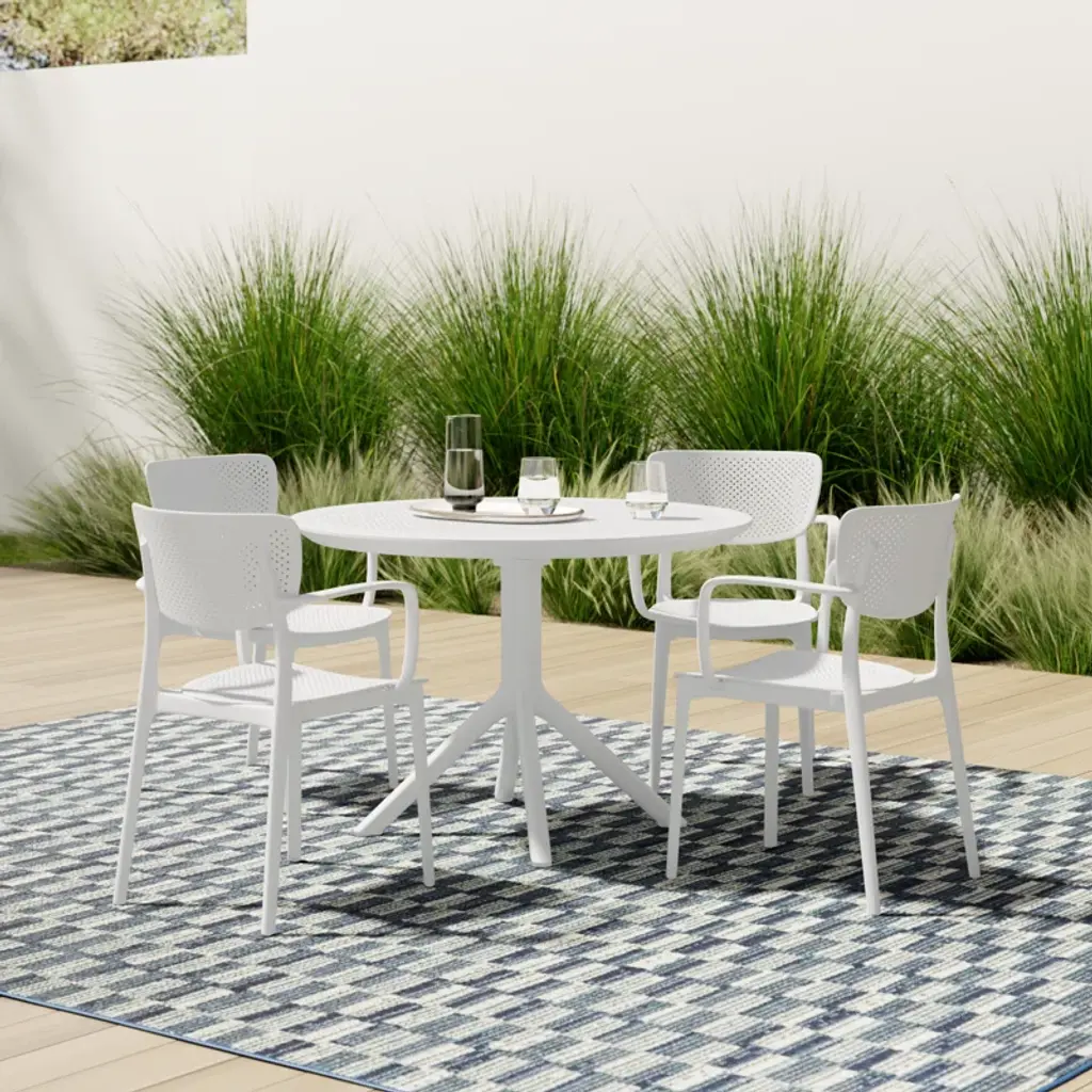 Four person casual dining set with comfortable armchairs and a 42 inch round dining table. Elegant design. Great for patios, balconies and decks. Chairs and table are made from marine grade polypropylene. Chairs are super sturdy with commercial strength. Easy to store by stacking the chairs.
