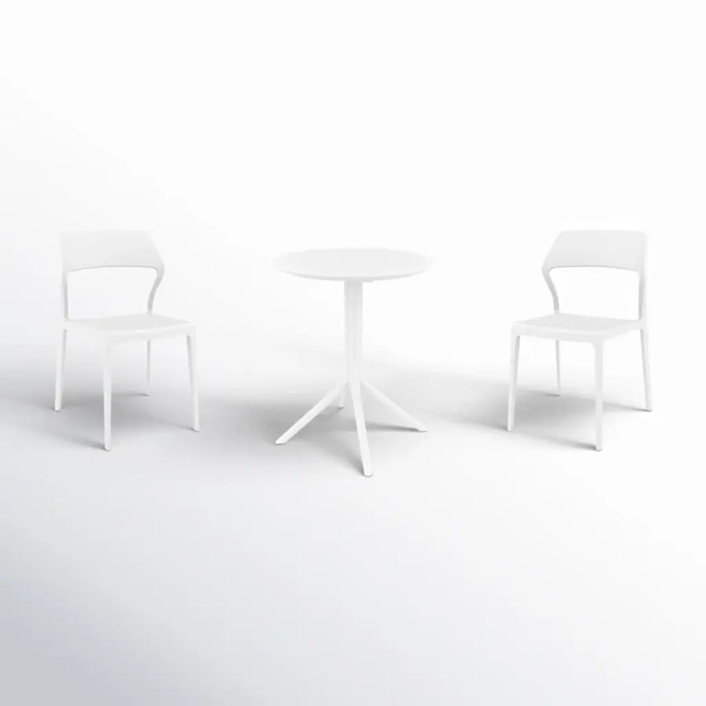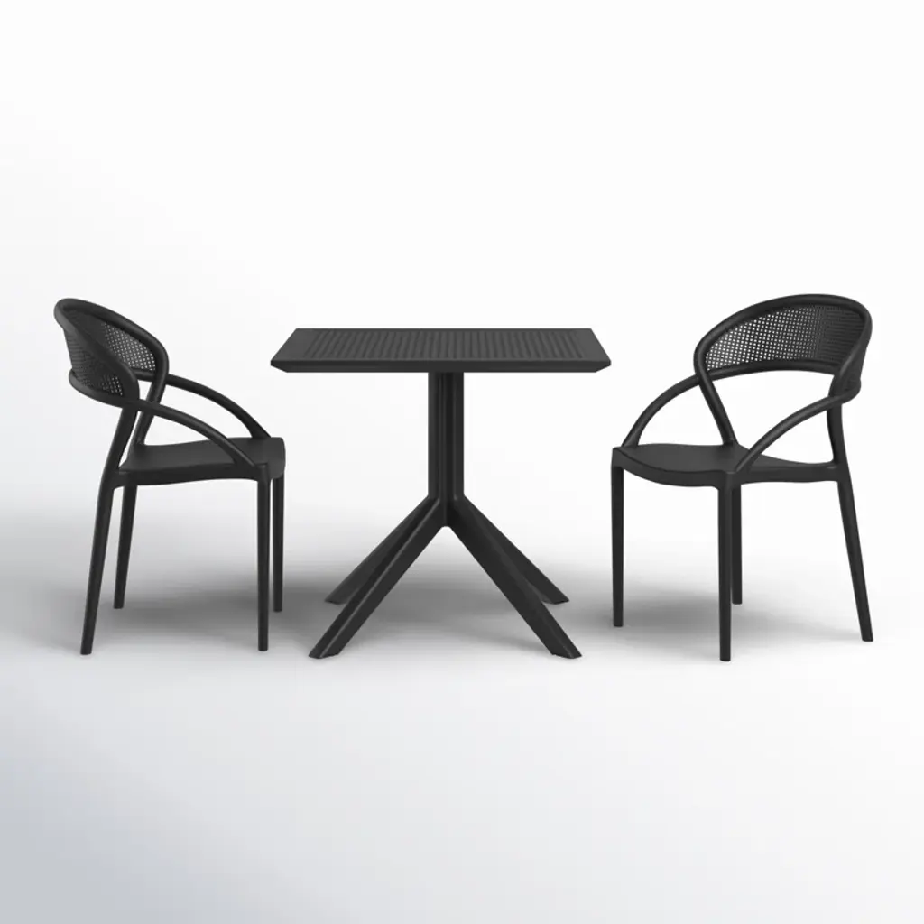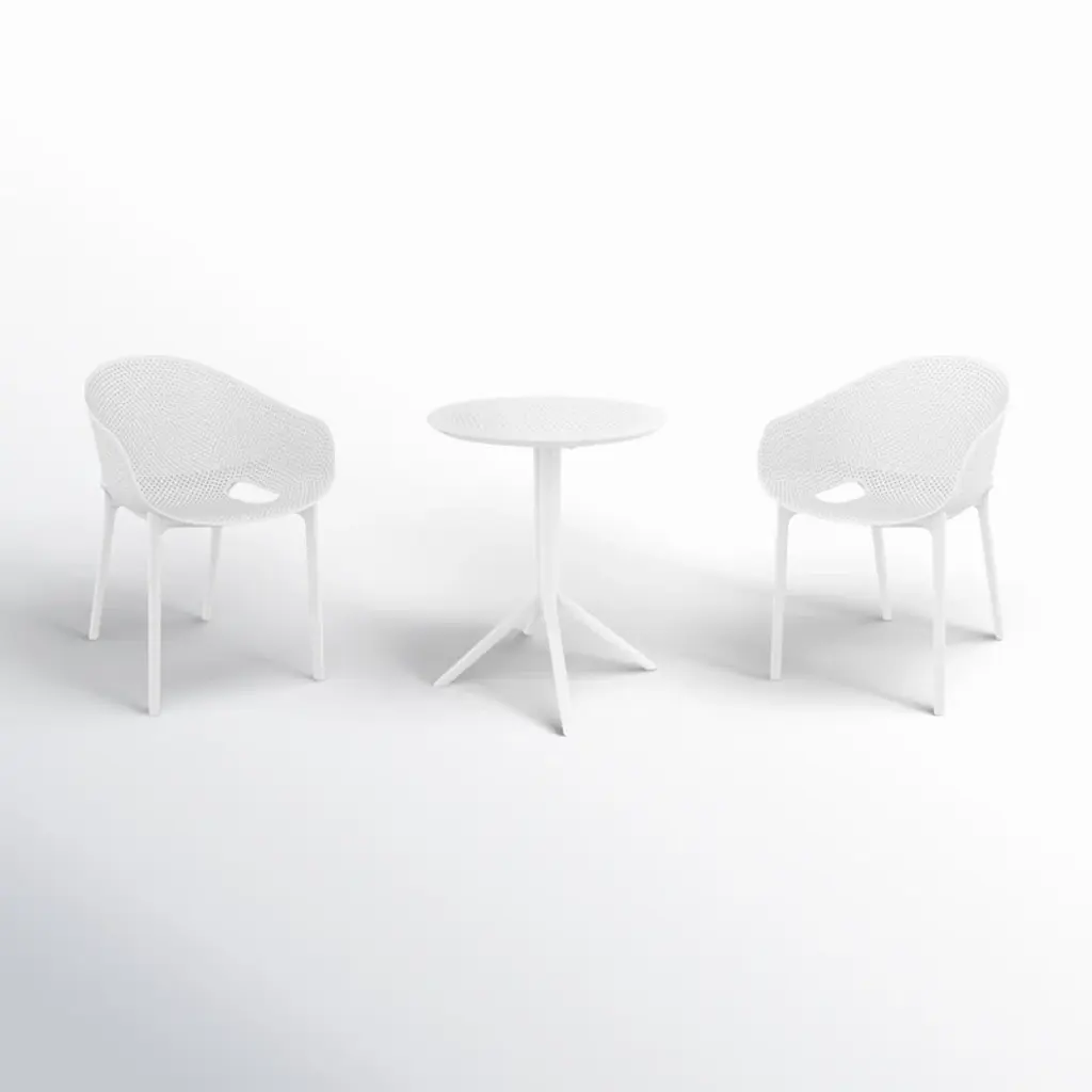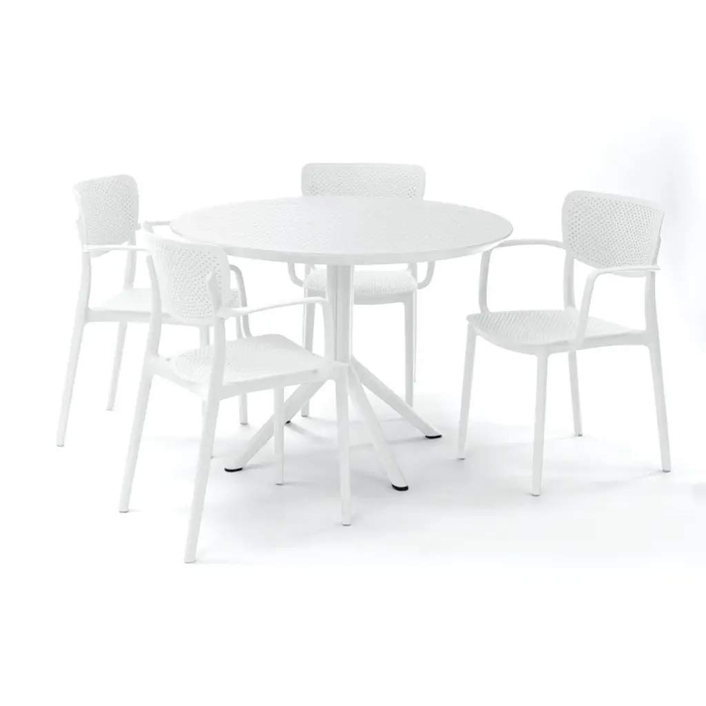Four person casual dining set with comfortable armchairs and a 42 inch round dining table. Elegant design. Great for patios, balconies and decks. Chairs and table are made from marine grade polypropylene. Chairs are super sturdy with commercial strength. Easy to store by stacking the chairs.