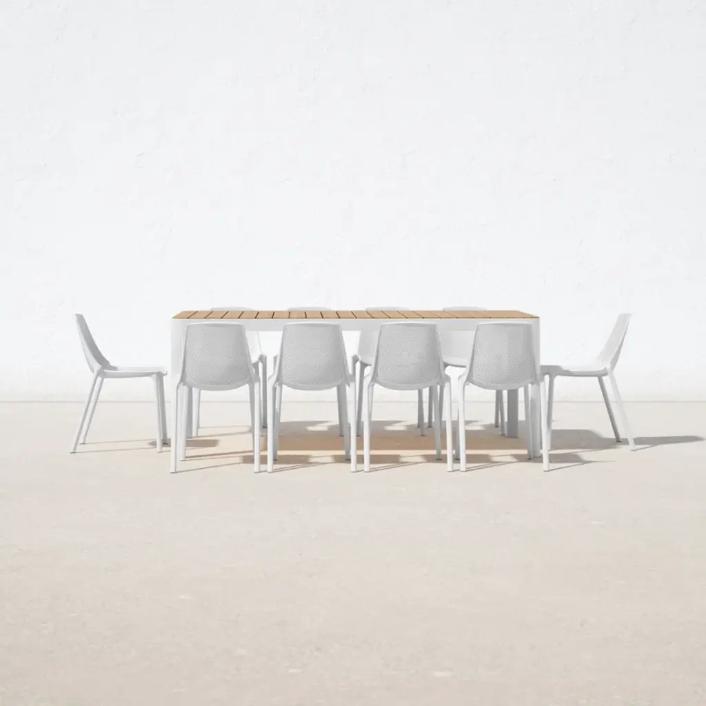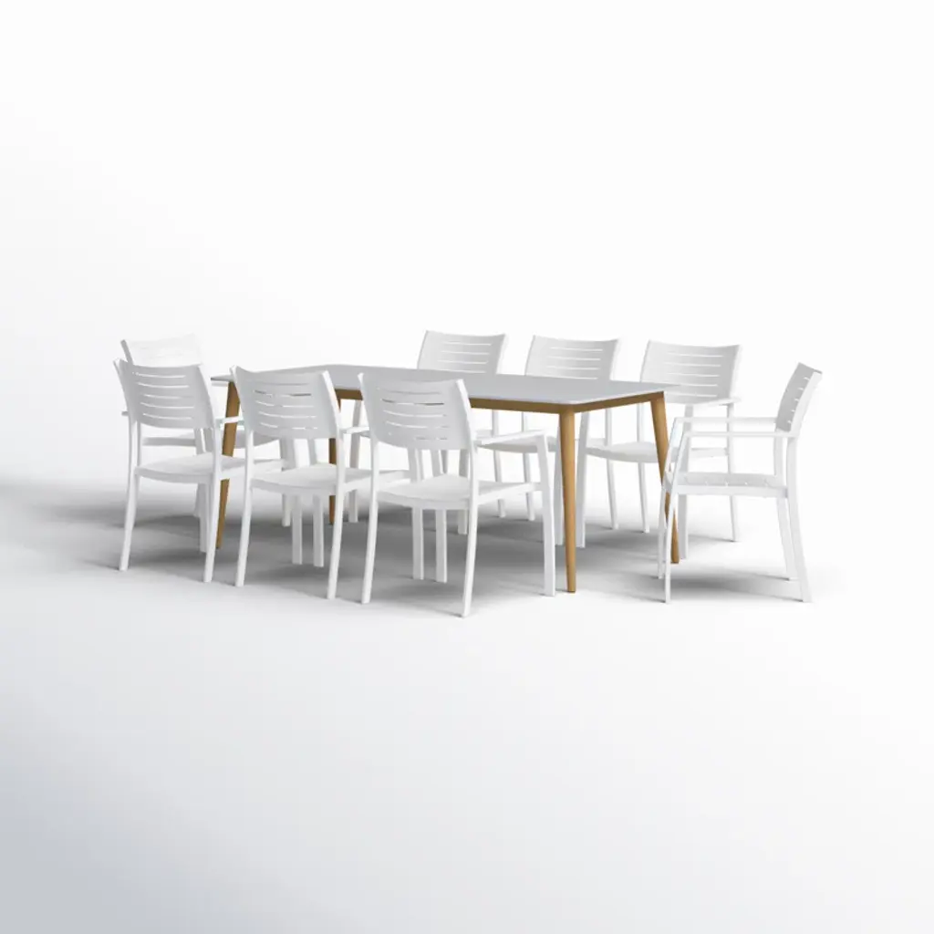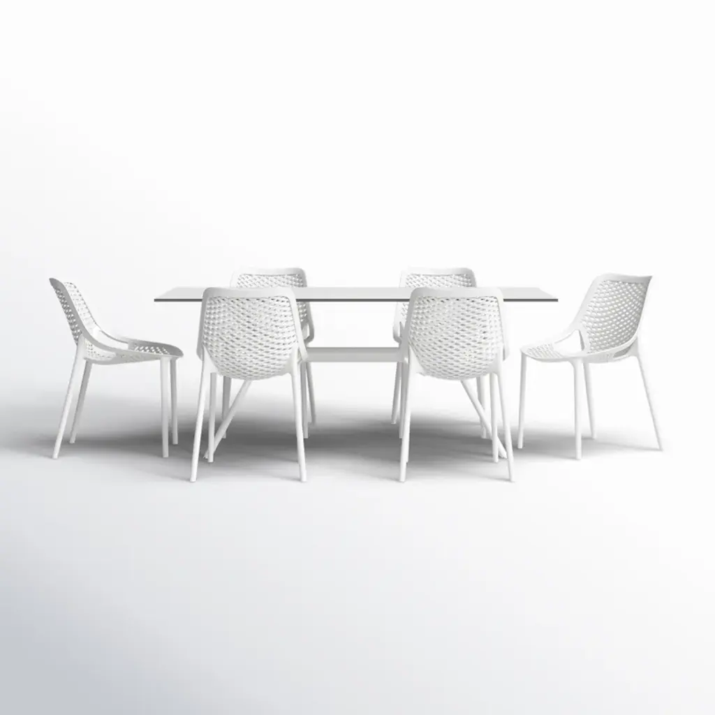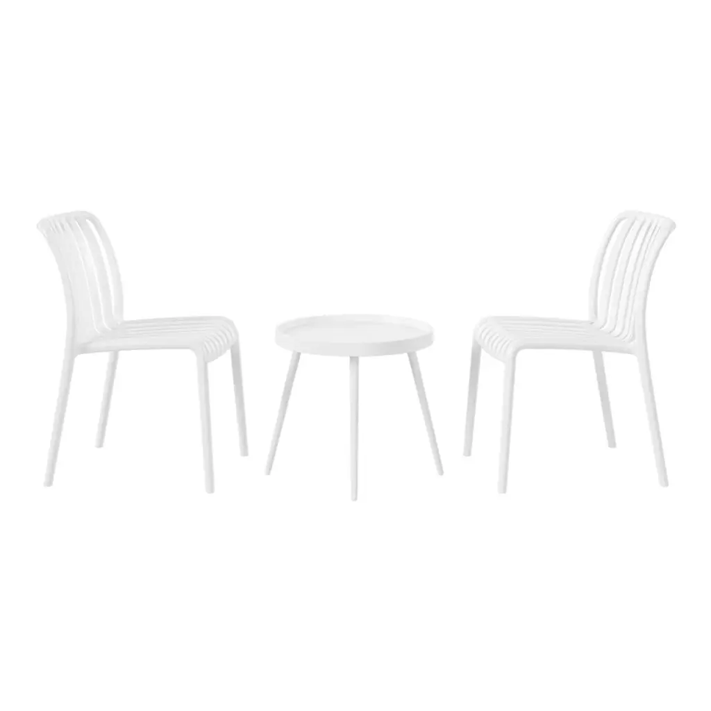 Four person casual dining set with comfortable armchairs and a 42 inch round dining table. Elegant design. Great for patios, balconies and decks. Chairs and table are made from marine grade polypropylene. Chairs are super sturdy with commercial strength. Easy to store by stacking the chairs.