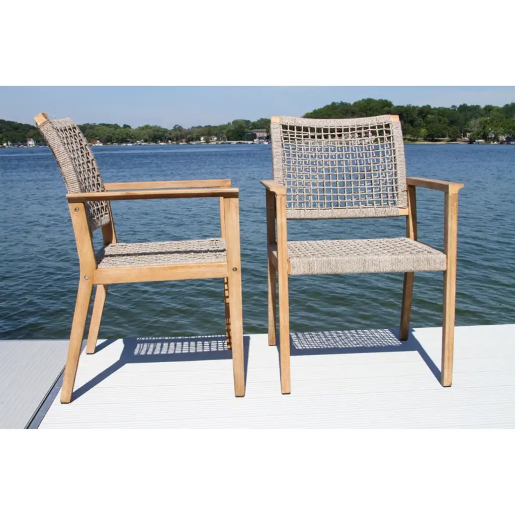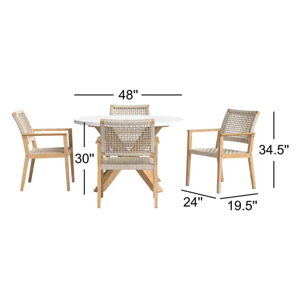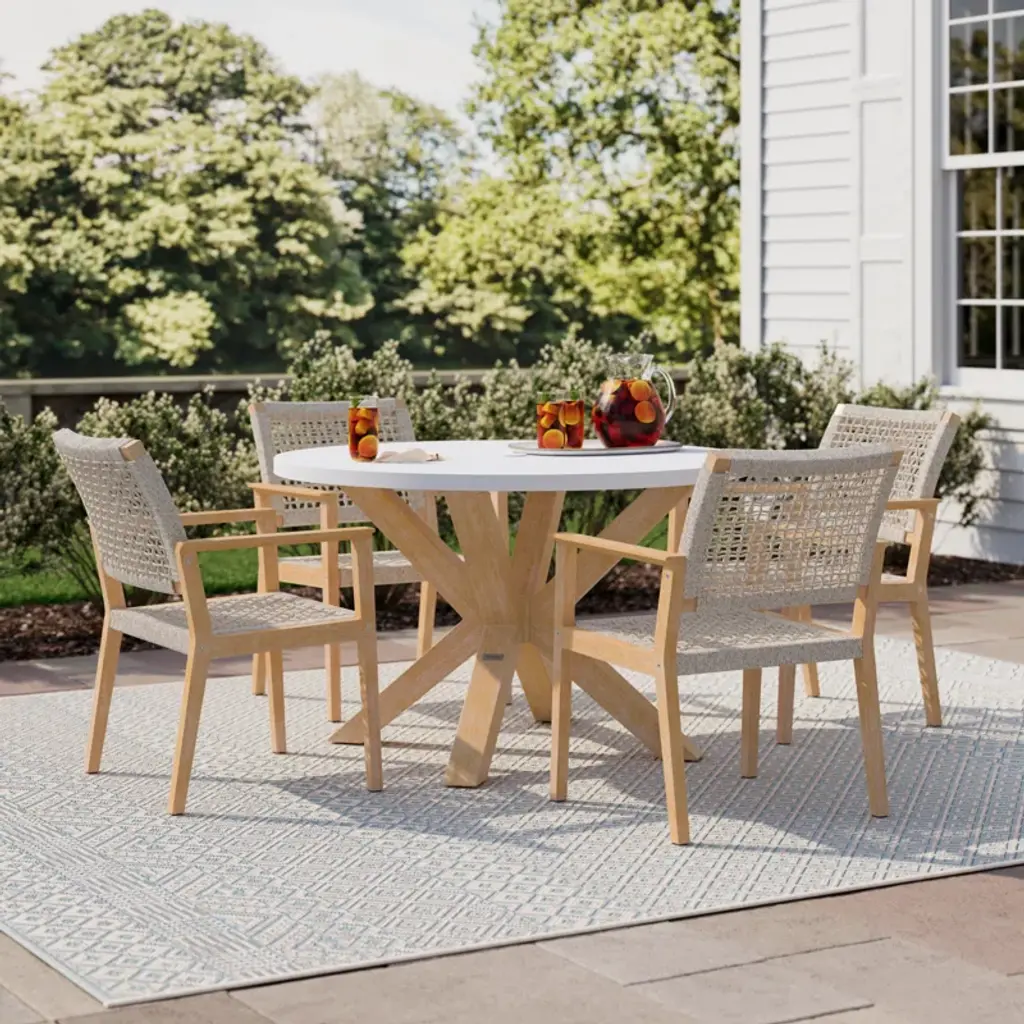 The 5-piece ivory composite and eucalyptus wash dining set is made from sustainable, plantation-grown eucalyptus hardwood. The ivory composite table is made from molded polyresin and blended with powdered concrete for texture, density, and long-lasting durability in all climates. The chairs are handwoven with nautical-grade rope. The eucalyptus table and chair frames are gently brushed for texture and then stained and washed in a beautiful UV-inhibited, lasting finish.