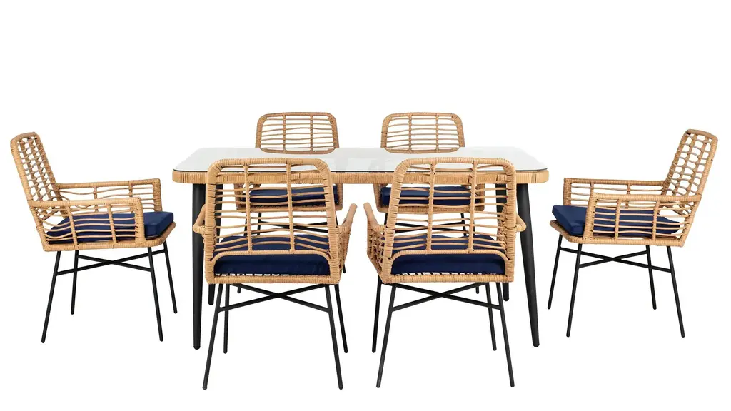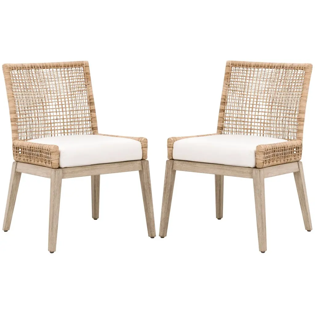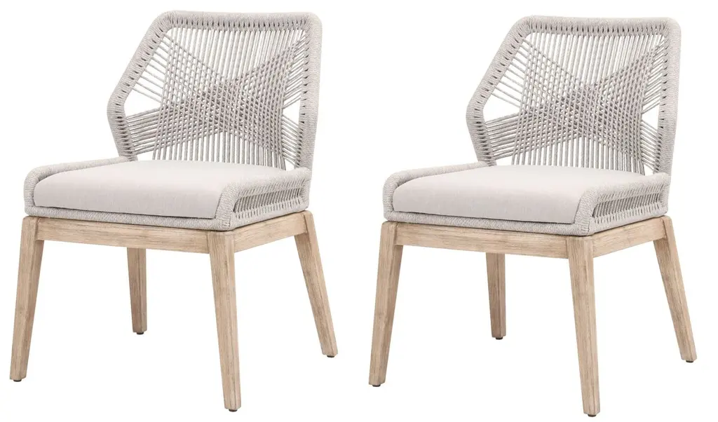 The 5-piece Fleur composite and eucalyptus wash dining set is made from sustainable, plantation-grown eucalyptus hardwood. The Fleur composite table is made from molded polyresin and blended with powdered concrete for texture, density, and long-lasting durability in all climates. The chairs are handwoven with nautical-grade rope. The eucalyptus table and chair frames are gently brushed for texture and then stained and washed in a beautiful UV-inhibited lasting finish.