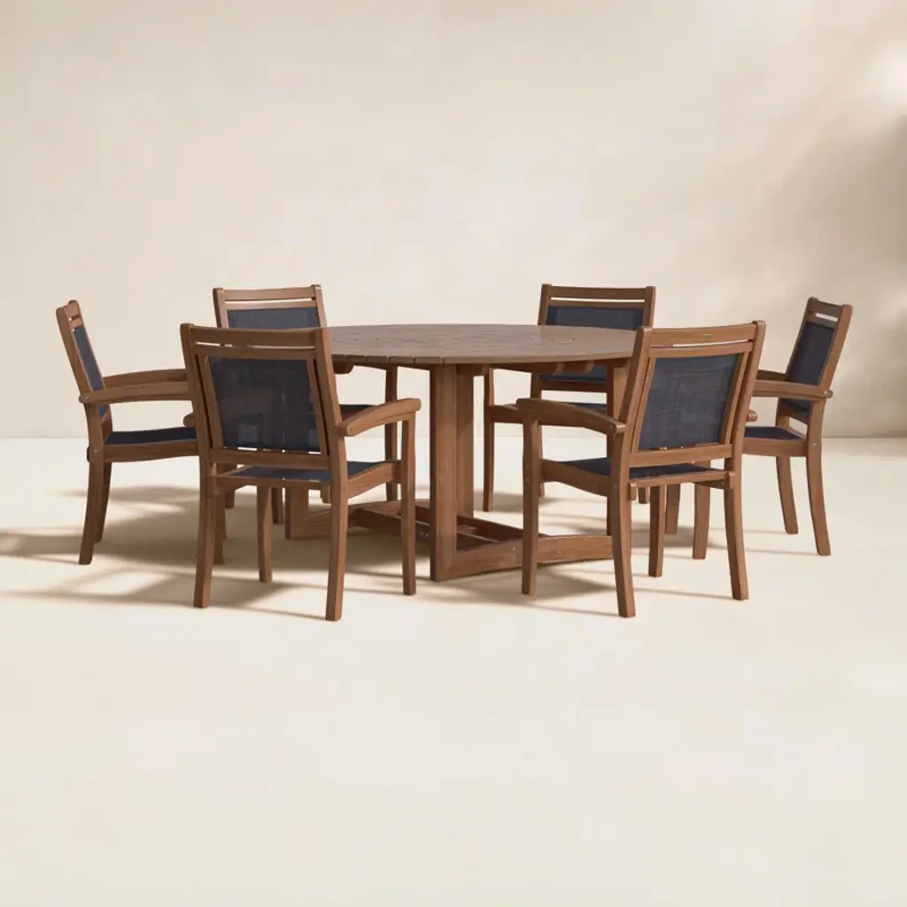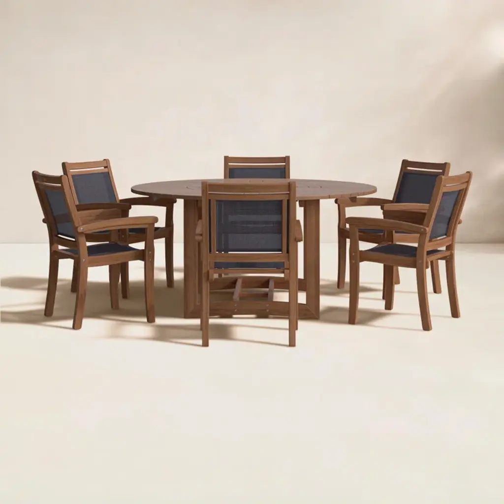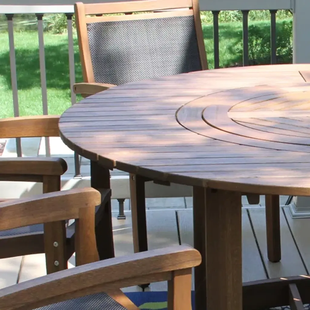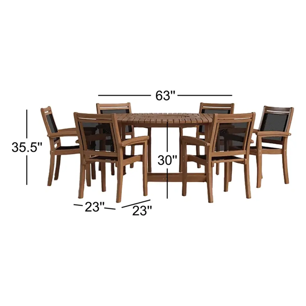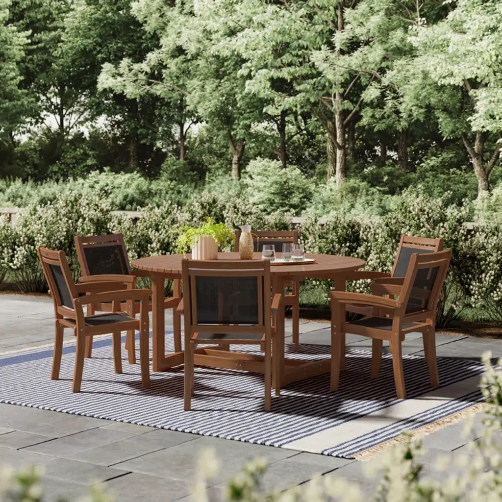 Gather your loved ones around our 7-piece outdoor dining set, perfect for alfresco meals and special occasions. It features a round table with an umbrella hole in the center and six stackable armchairs with breathable resin fabric on the seats and backs. Each piece is crafted from weather-resistant solid eucalyptus wood with a warm brown finish. Bonus: The tabletop has a built-in lazy Susan for easy food sharing.