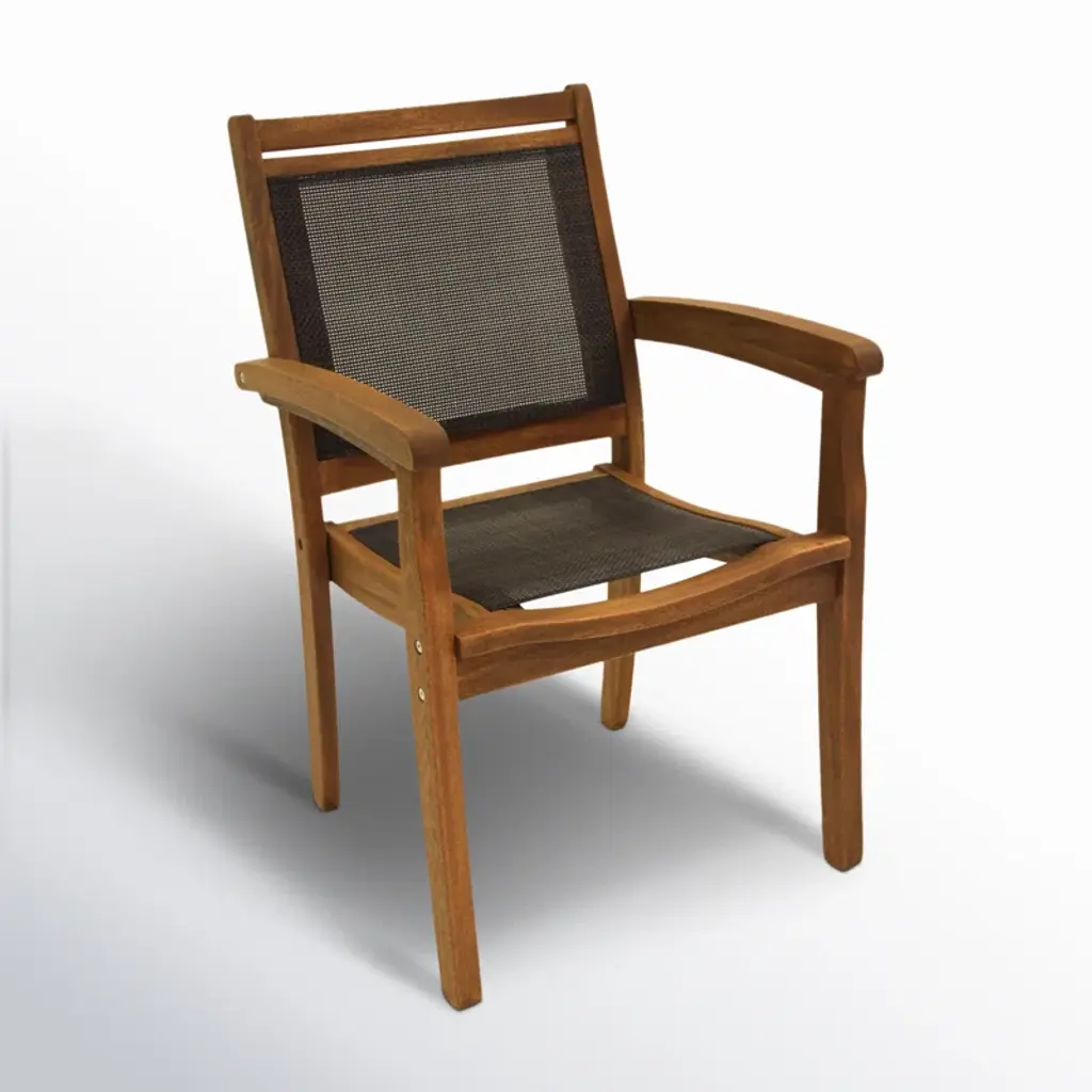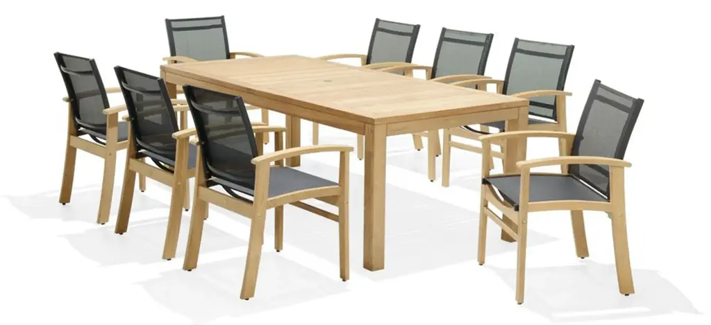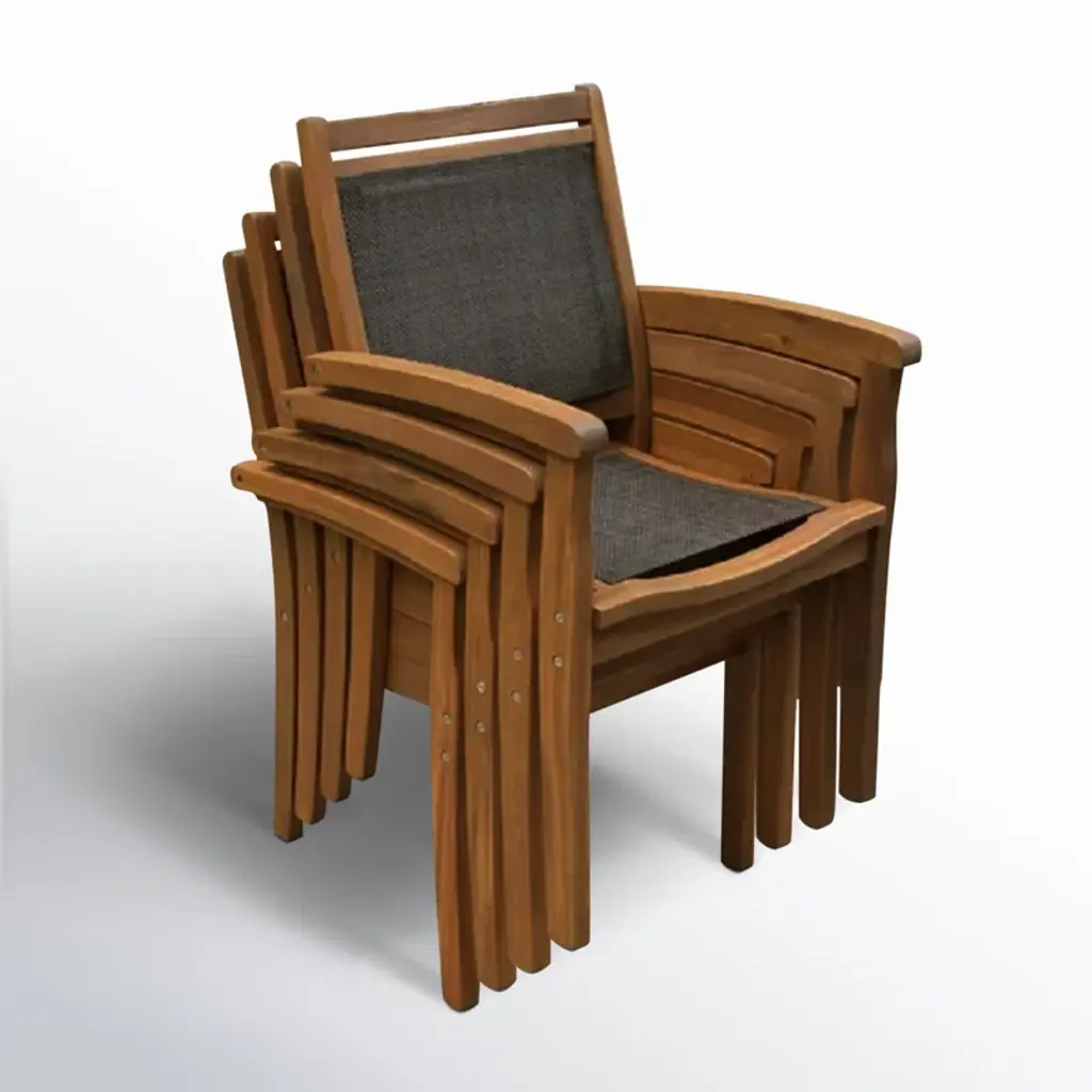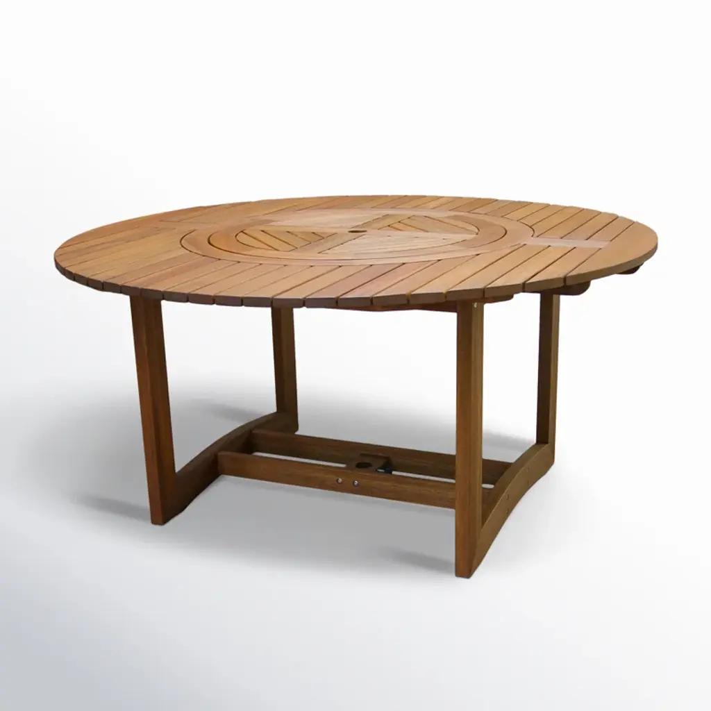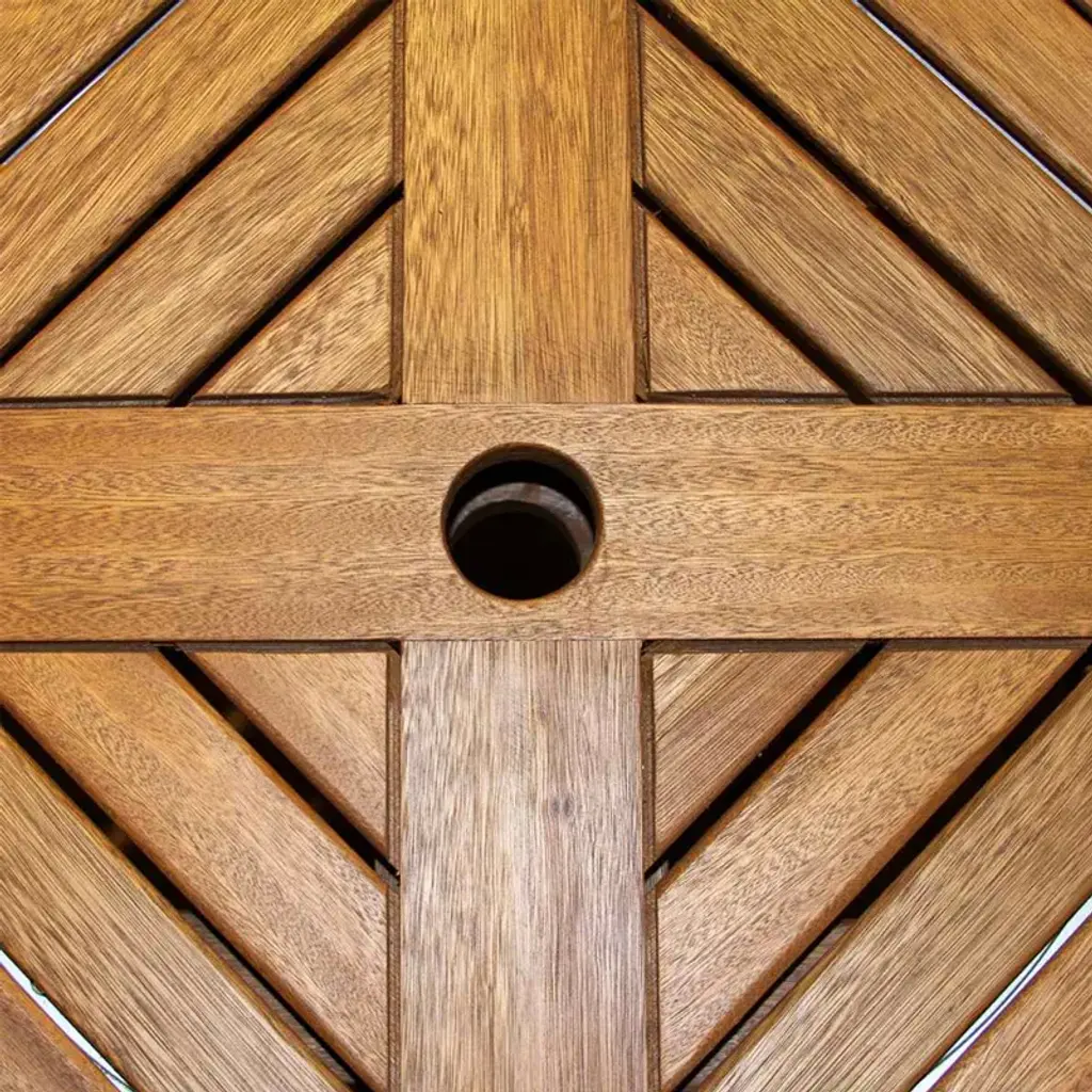 Gather your loved ones around our 7-piece outdoor dining set, perfect for alfresco meals and special occasions. It features a round table with an umbrella hole in the center and six stackable armchairs with breathable resin fabric on the seats and backs. Each piece is crafted from weather-resistant solid eucalyptus wood with a warm brown finish. Bonus: The tabletop has a built-in lazy Susan for easy food sharing.