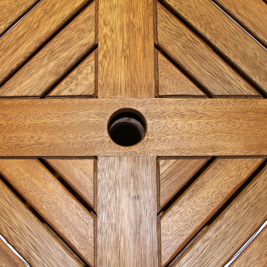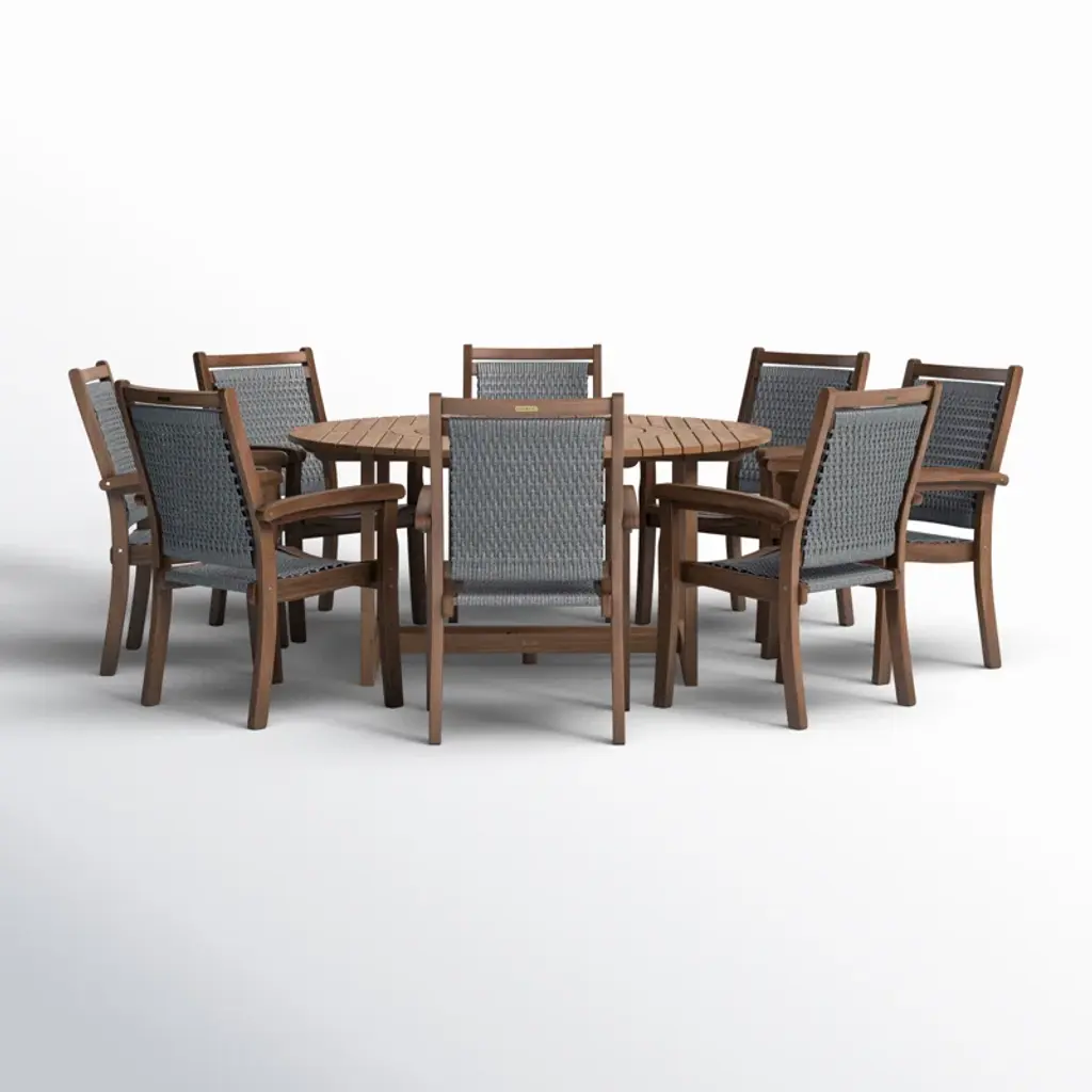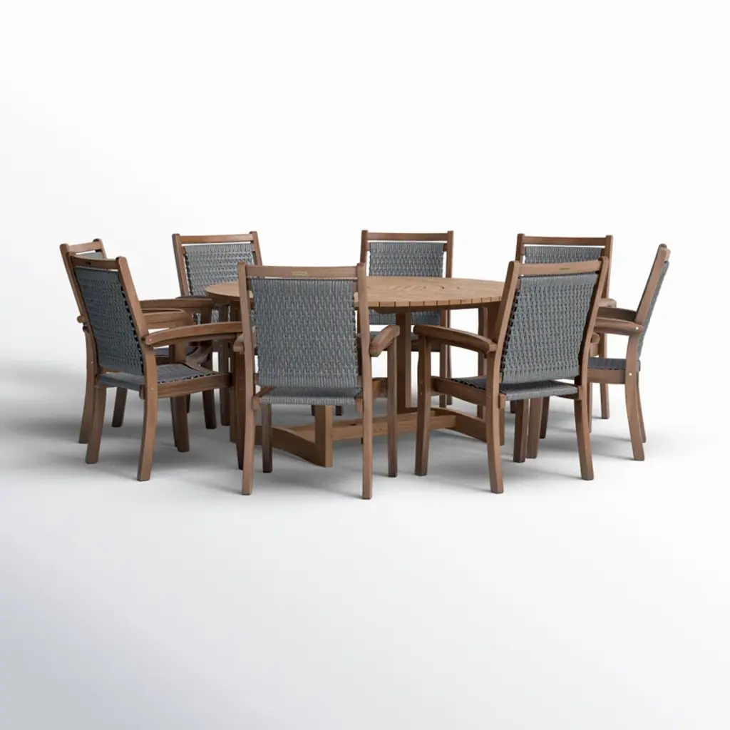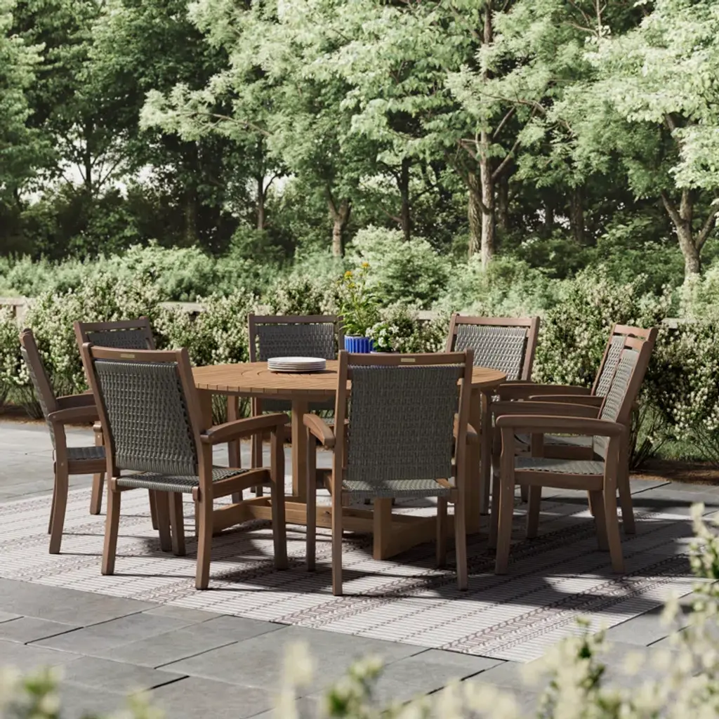 Our 9-piece outdoor dining set is ready for this year's cozy gatherings and special occasions – and in future years, too! It includes eight stackable armchairs and a round table with a lazy Susan. Each piece is made from weather-resistant eucalyptus with a natural brown finish that complements every flower in the garden. The seats and backs of the armchairs are crafted from wicker rattan, giving off a vibe that looks breezy and feels cool.