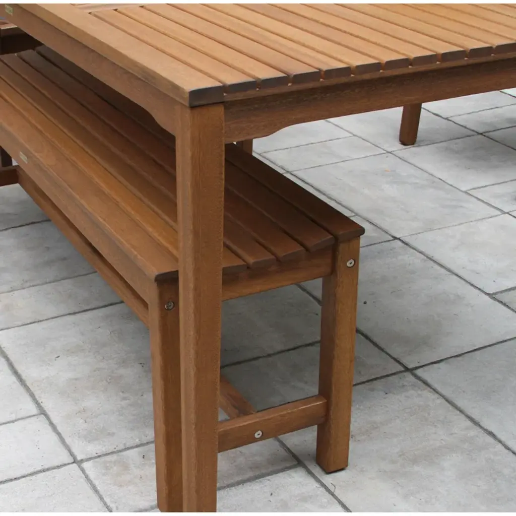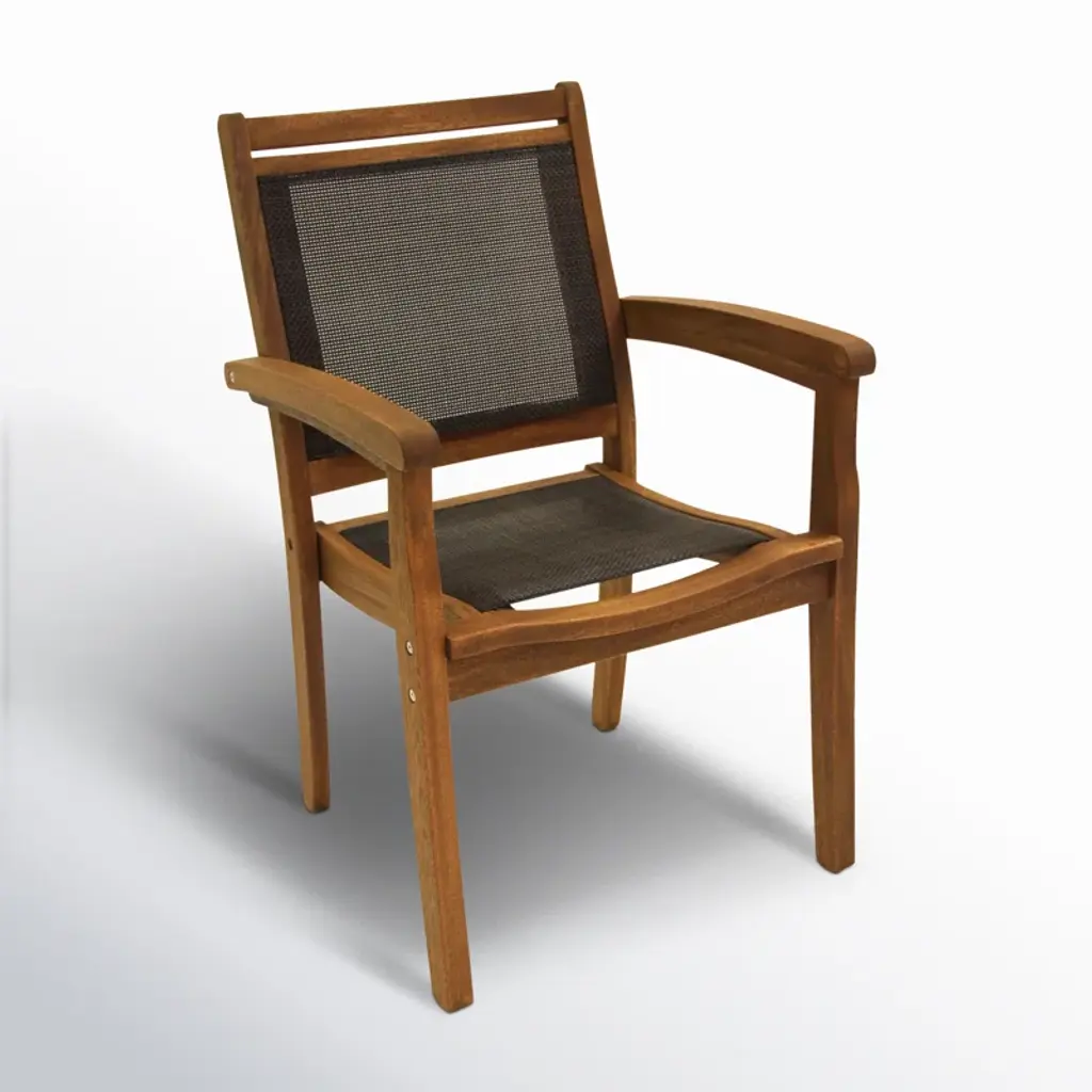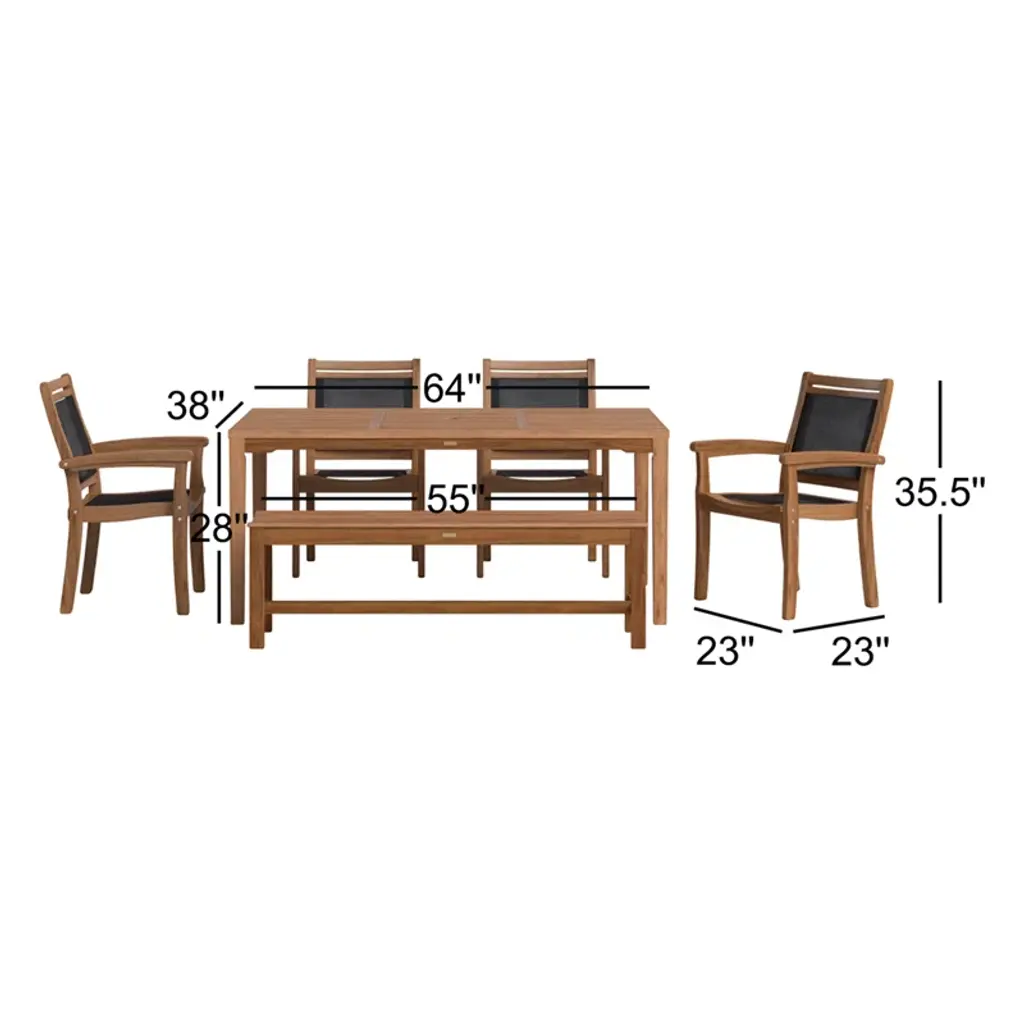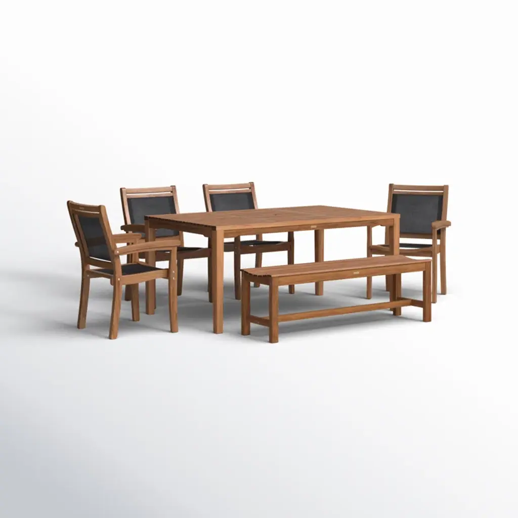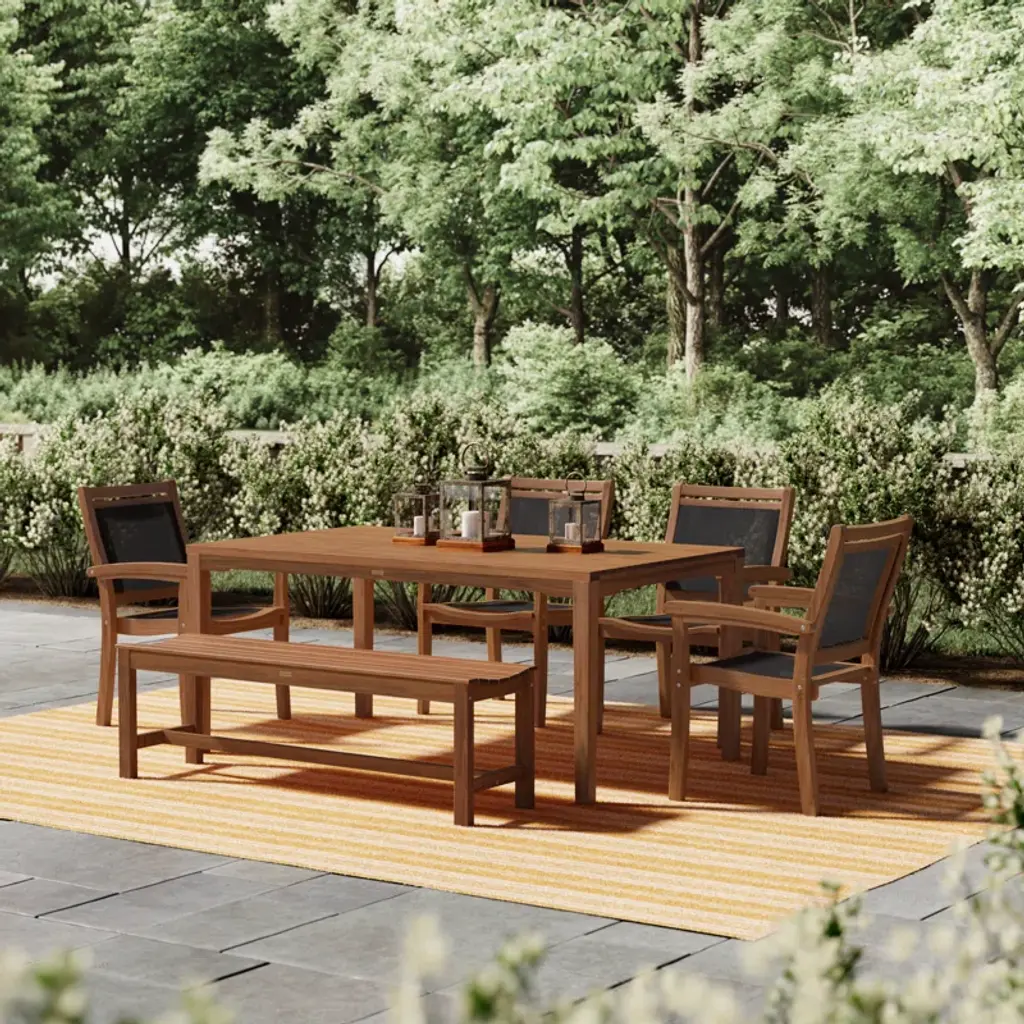 Create an inviting spot for backyard BBQs and family gatherings with this 6-piece outdoor dining set. It includes a spacious dining table, a backless bench, and four stackable armchairs, all crafted from solid, weather-resistant eucalyptus wood in a warm brown finish. The table features a central opening for your favorite patio umbrella (sold separately), perfect for creating a shaded space. Each chair has a breathable sling seat and back, adding comfort to your outdoor dining experience.