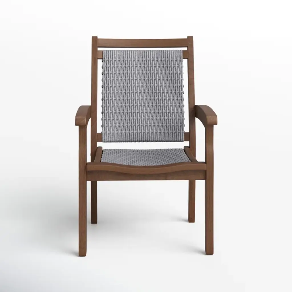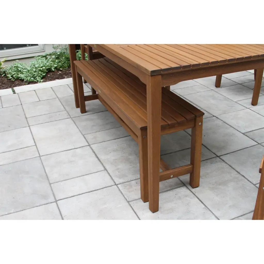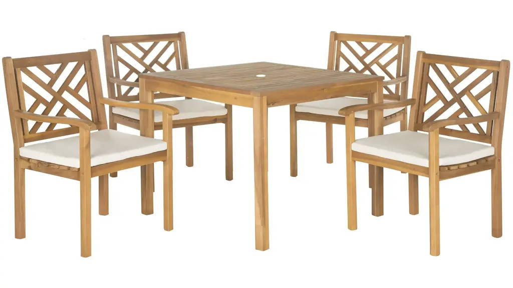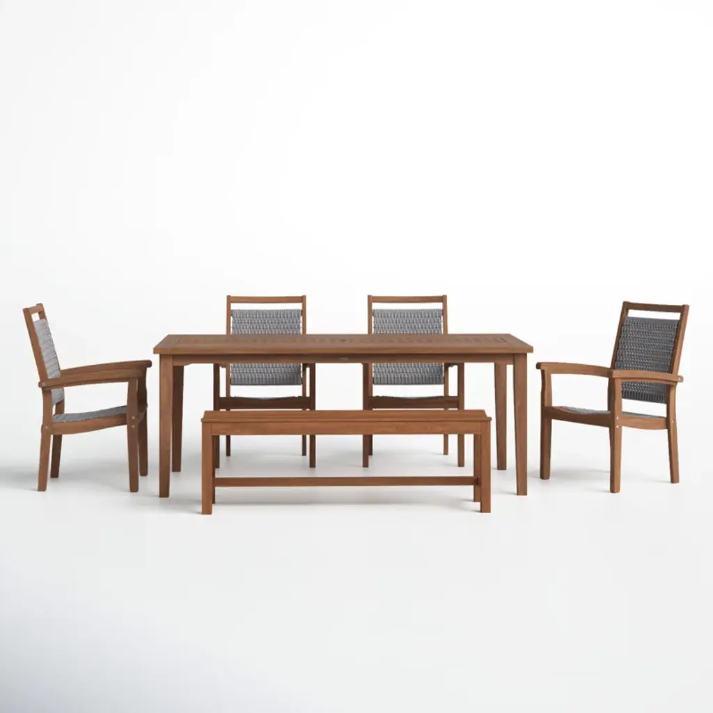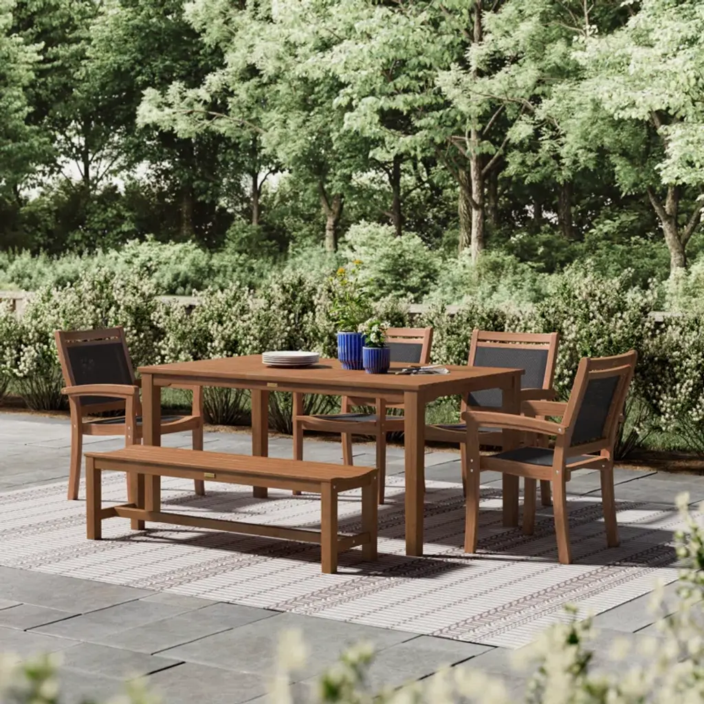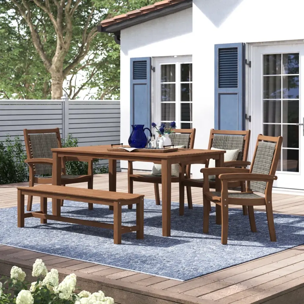 Bring a breezy, farmhouse vibe into your backyard with this 6-piece dining set that includes four armchairs, one bench, and one table. Each piece is made from weather-resistant solid eucalyptus wood with a warm finish that's designed to stand up to the elements. An umbrella hole in the center accommodates the shade of your choice, and the stackable chairs feature wicker rattan seats and backs to complete the look.