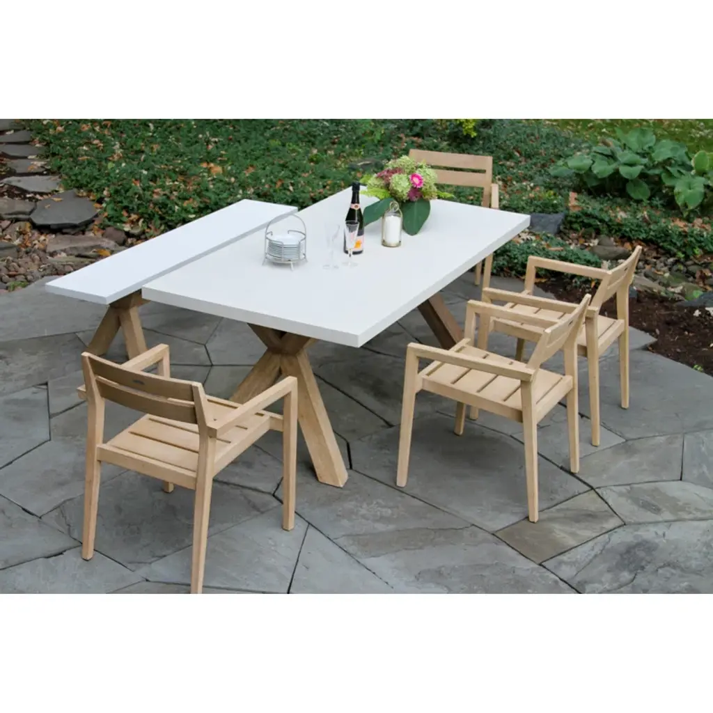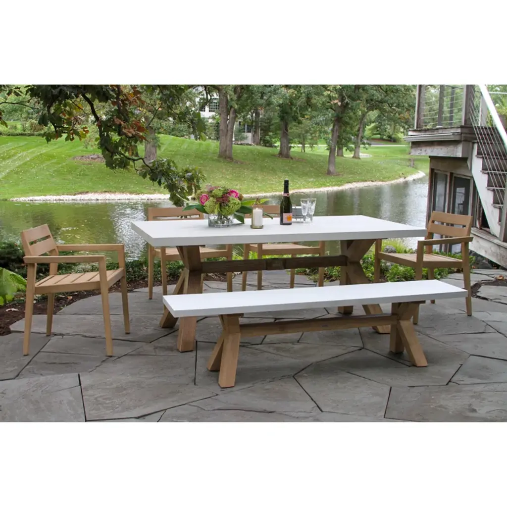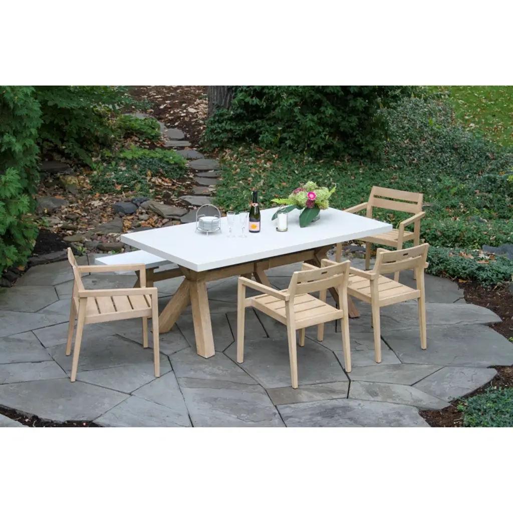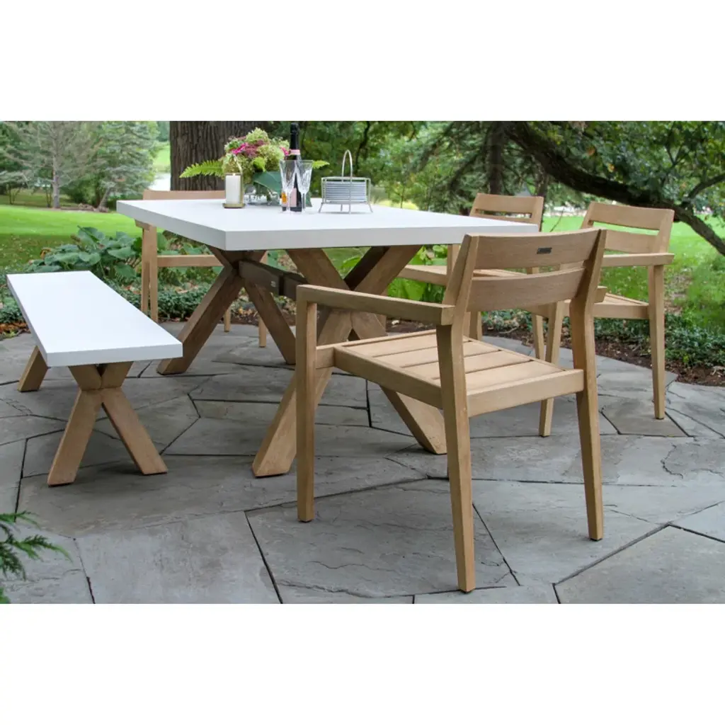 The 6 pieces eucalyptus wash dining set is made from sustainable, plantation-grown eucalyptus hardwood. The composite table and benchtop are made from a molded polyresin and blended with powdered concrete for texture, density, and long-lasting durability in all climates. The chairs are solid eucalyptus hardwood. The set is gently brushed for texture and then stained and washed in a beautiful UV inhibited lasting finish. The table includes an umbrella hole and a matching composite plug.