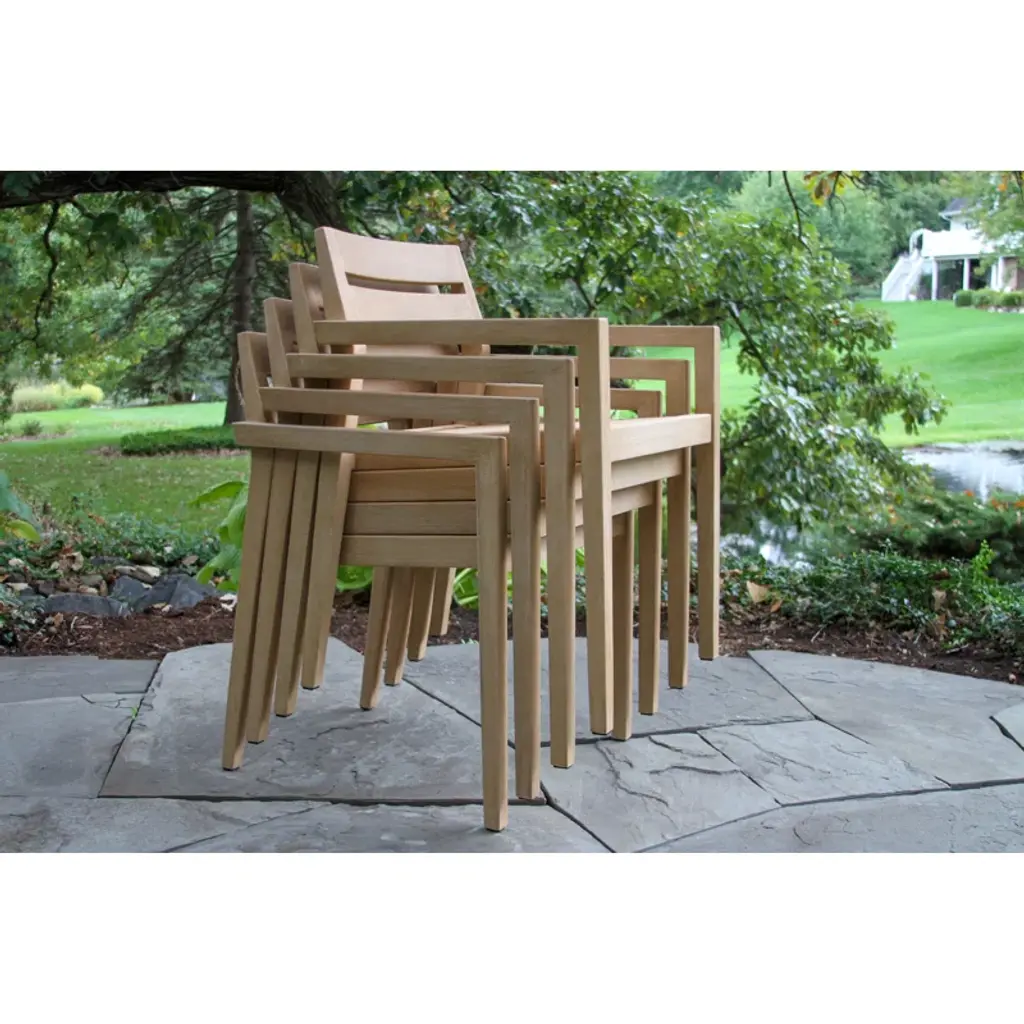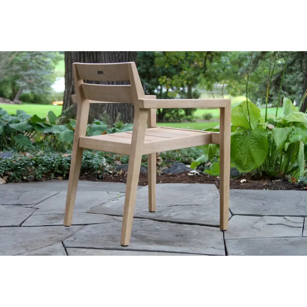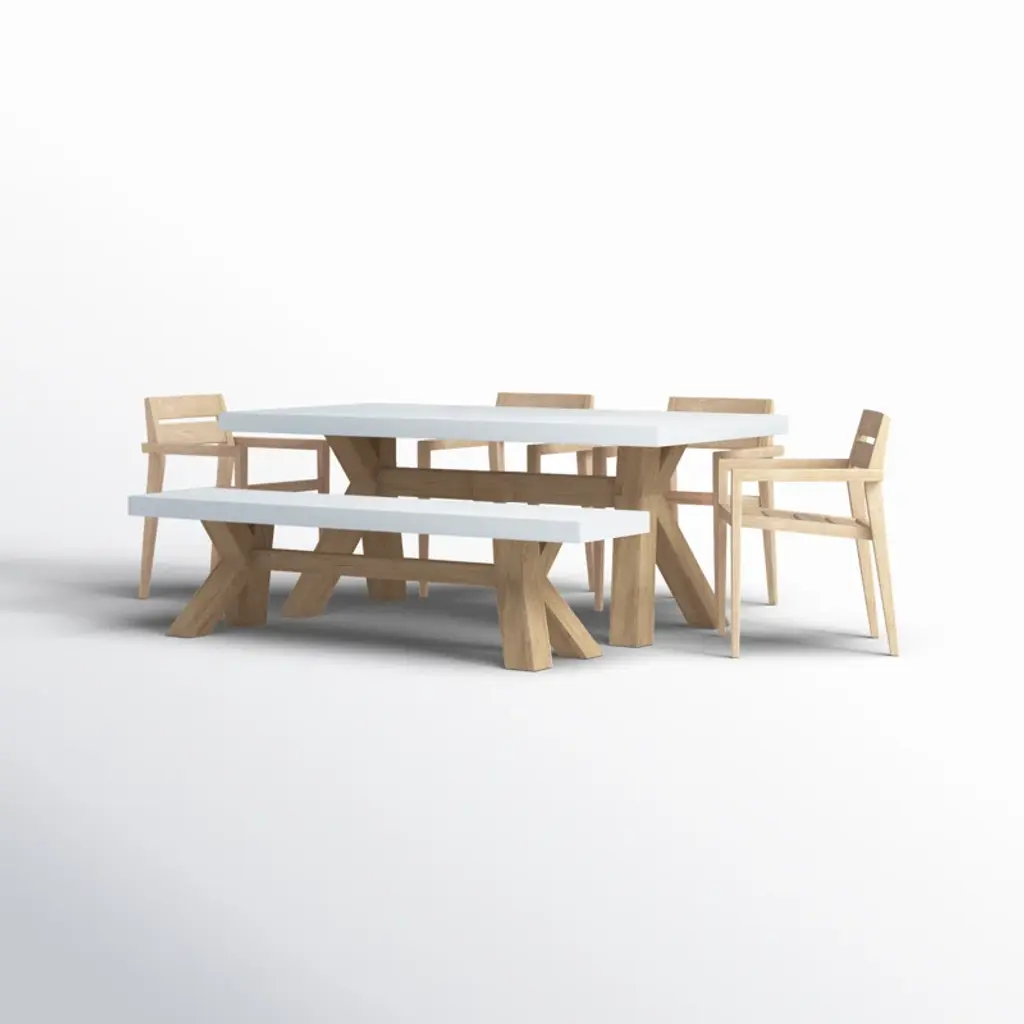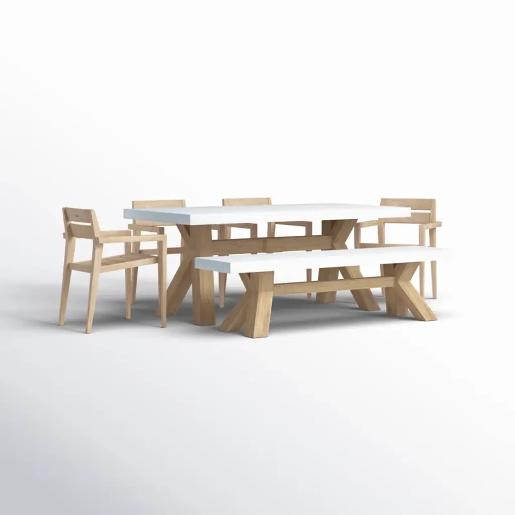 The 6 pieces eucalyptus wash dining set is made from sustainable, plantation-grown eucalyptus hardwood. The composite table and benchtop are made from a molded polyresin and blended with powdered concrete for texture, density, and long-lasting durability in all climates. The chairs are solid eucalyptus hardwood. The set is gently brushed for texture and then stained and washed in a beautiful UV inhibited lasting finish. The table includes an umbrella hole and a matching composite plug.