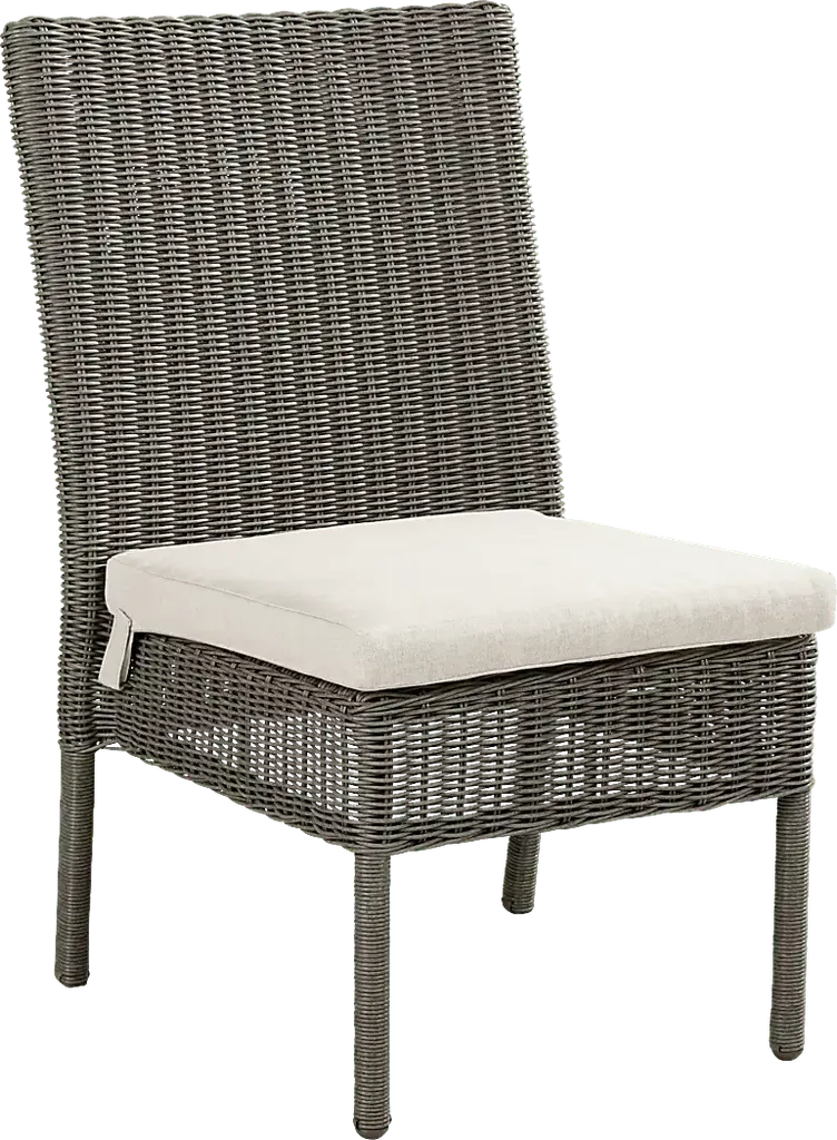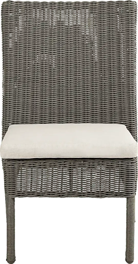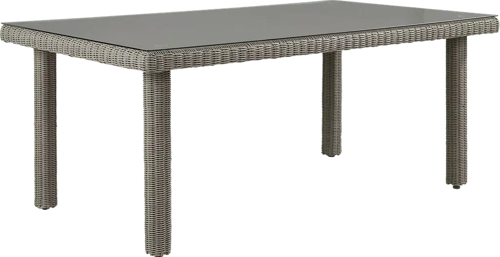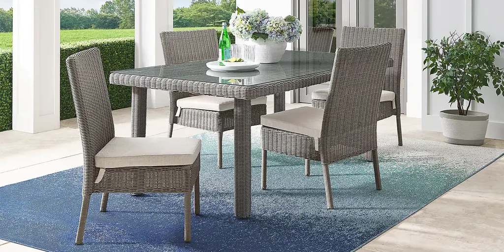 The warm familiarity of a family classic takes its cue from country club chic in the Forest Hills seating set's relaxed angles and deep seats. A handsome 74" x 42" glass tabletop sets the scene. The weather-resistant aluminum frames of the table and each side chair are wrapped in gray all-weather wicker in an understated weave that adds a touch of coastal charm. Cushions in UV-resistant beige outdoor fabric offer perfect plushness to match the subtle tilt of the seats for maximum comfort.