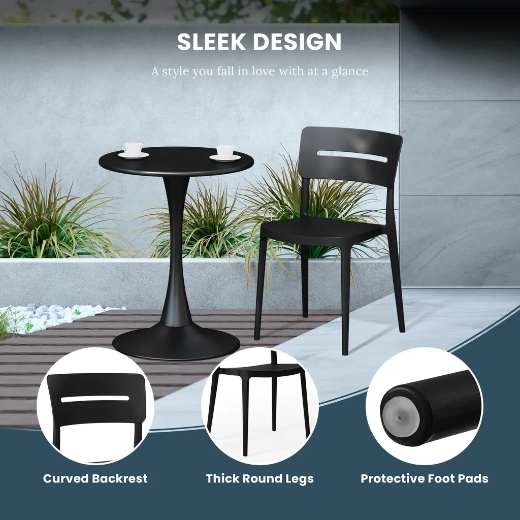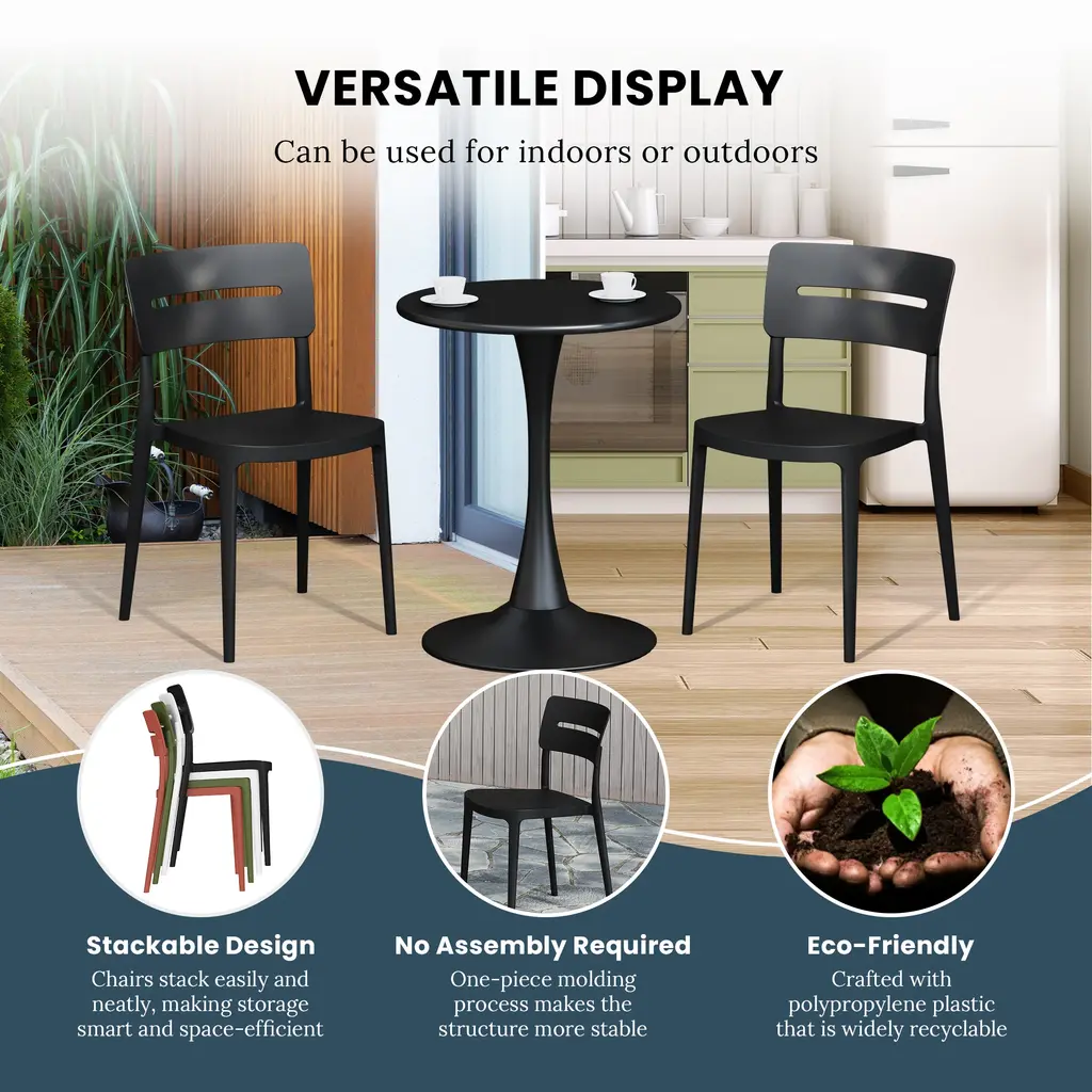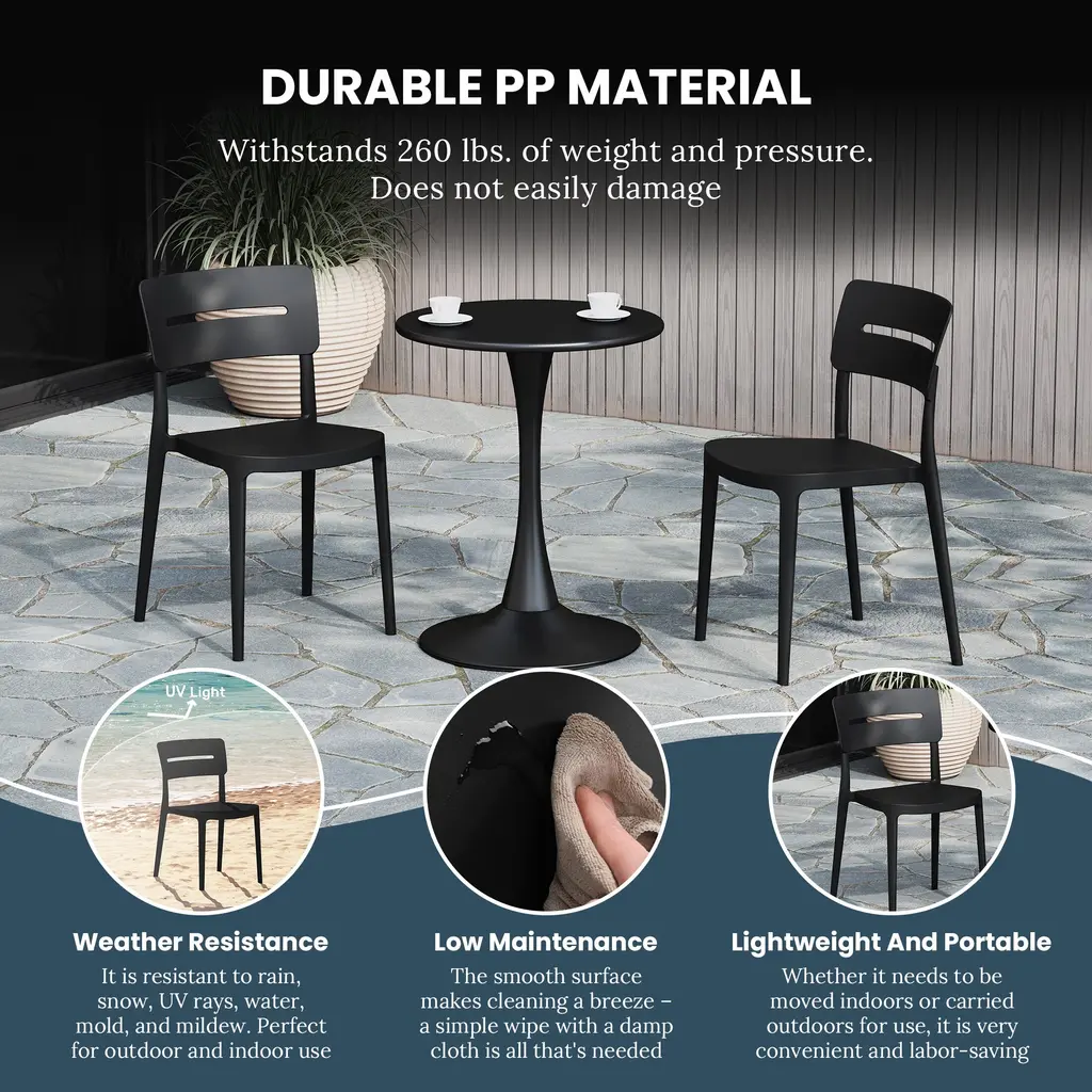 Appealing and modern style that is sure to give your balcony or outdoor terrace some added charm with this set of four modern outdoor dining chairs. Crafted from durable, all-weather PP resin, prepared to withstand the elements while retaining their vibrant color year-round thanks to their UV and fade-resistant properties. Lightweight and simple to move, they are perfect for creating a flexible dining area on even the smallest balconies or patios. Designed with comfort in mind, a ventilated backrest keeps you cool on warm summer evenings. And when not in use, they stack neatly for easy storage.While we strive to accurately represent product colors, please be aware that actual colors may vary slightly due to individual screen settings and lighting conditions. FeaturesDetails:Dining Chair