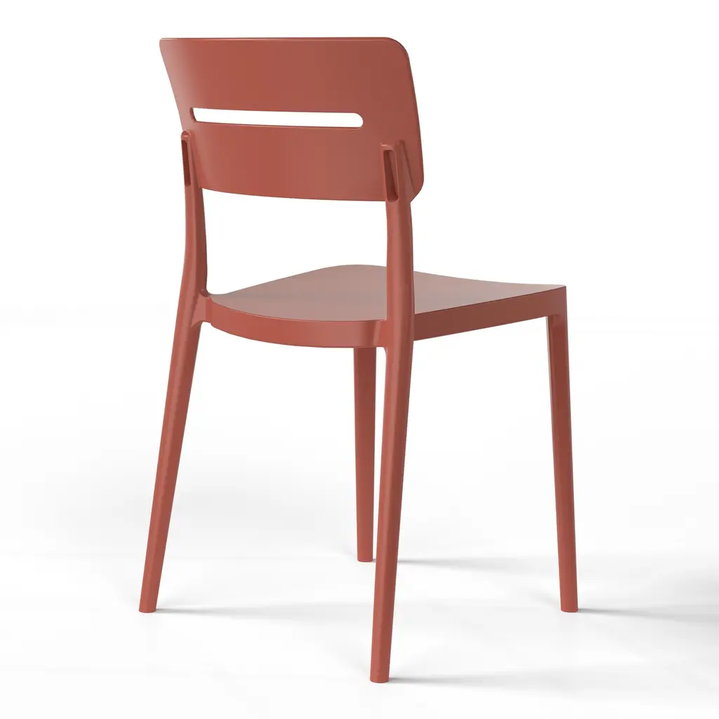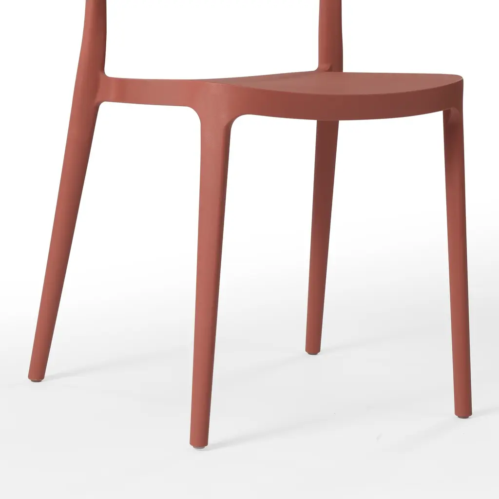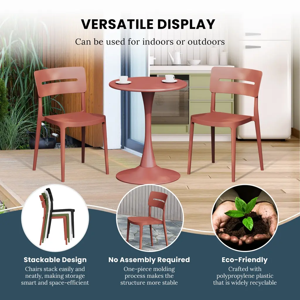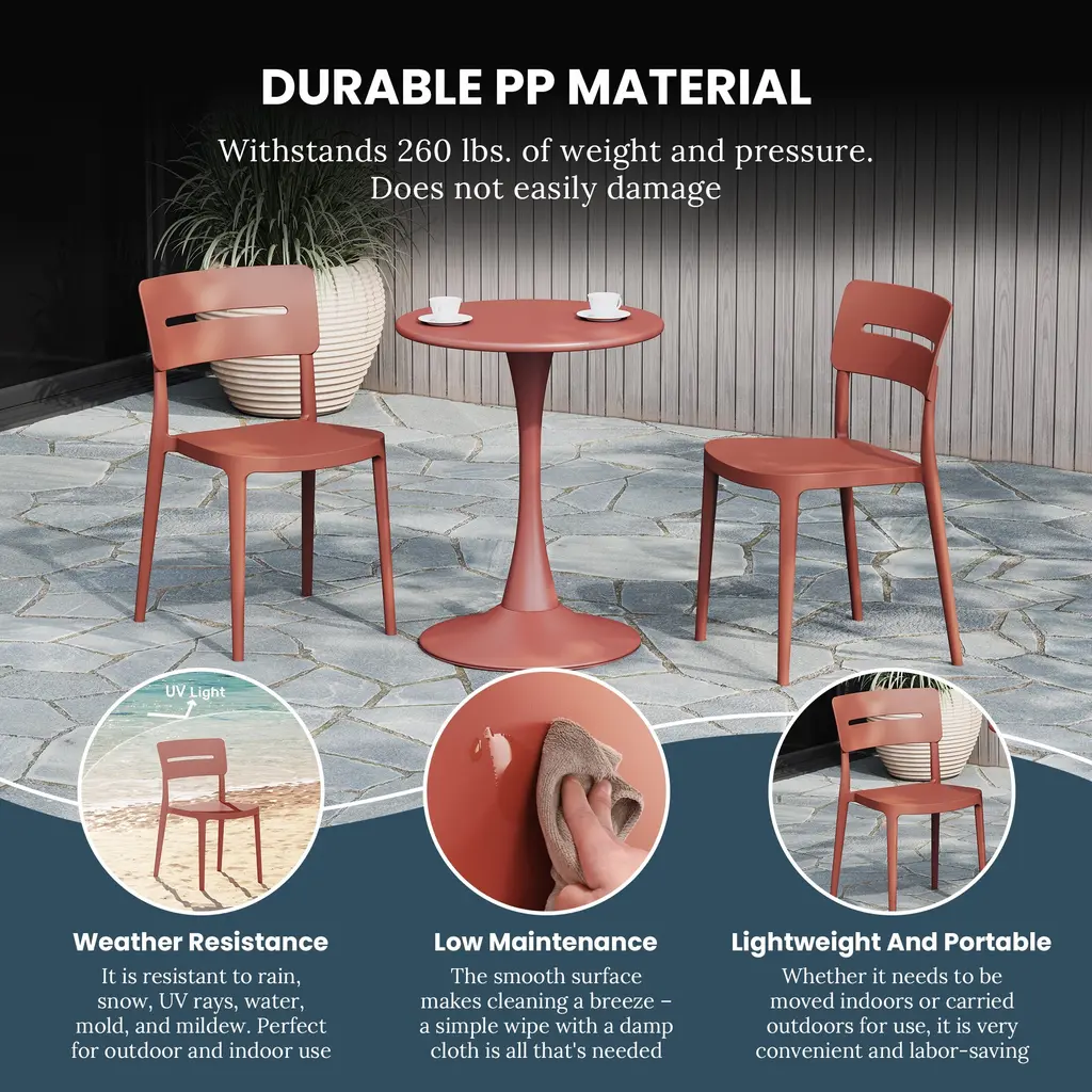 Appealing and modern style that is sure to give your balcony or outdoor terrace some added charm with this set of four modern outdoor dining chairs. Crafted from durable, all-weather PP resin, prepared to withstand the elements while retaining their vibrant color year-round thanks to their UV and fade-resistant properties. Lightweight and simple to move, they are perfect for creating a flexible dining area on even the smallest balconies or patios. Designed with comfort in mind, a ventilated backrest keeps you cool on warm summer evenings. And when not in use, they stack neatly for easy storage.While we strive to accurately represent product colors, please be aware that actual colors may vary slightly due to individual screen settings and lighting conditions. FeaturesDetails:Dining Chair